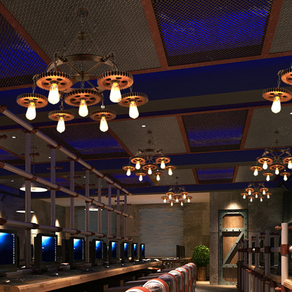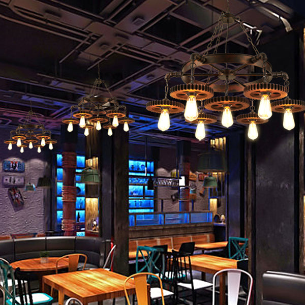 ثريا دائرية تقليدية ريفية من الحديد والخشب، مزودة بإضاءة 3/7، مناسبة للمطاعم