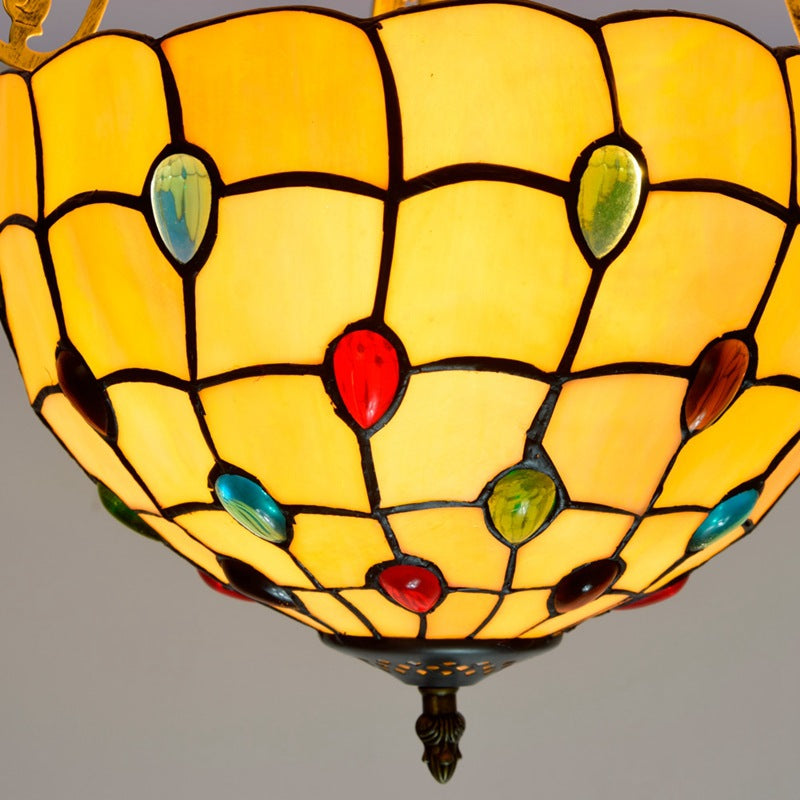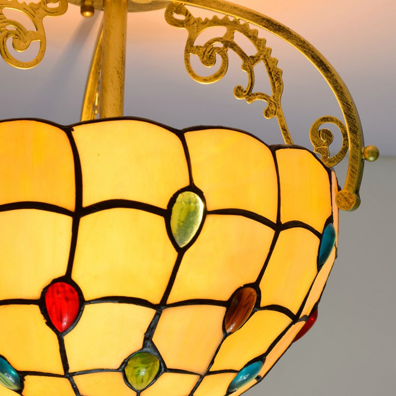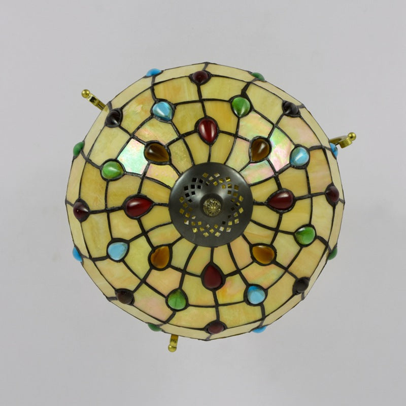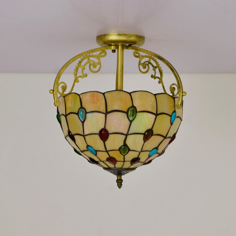 مصباح سقف تقليدي من تيفاني باسكت، مصنوع من خرزات شبه دائرية، مصنوع من الزجاج والحديد، مزود بمصباحين، مثبت بشكل شبه مسطح، لغرفة المعيشة