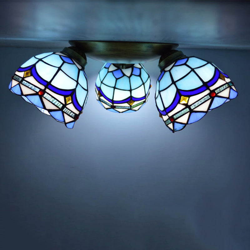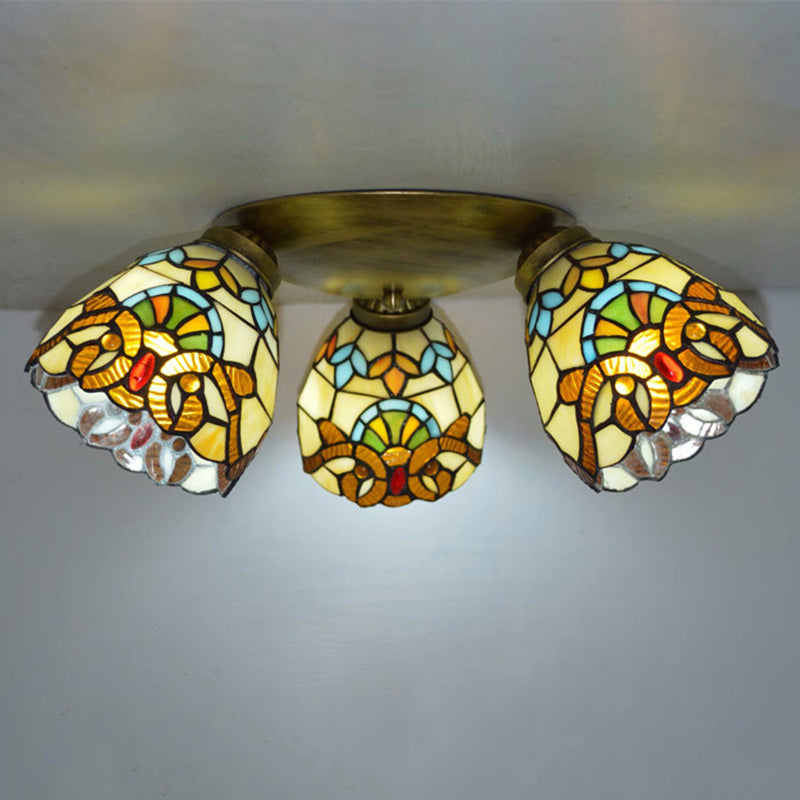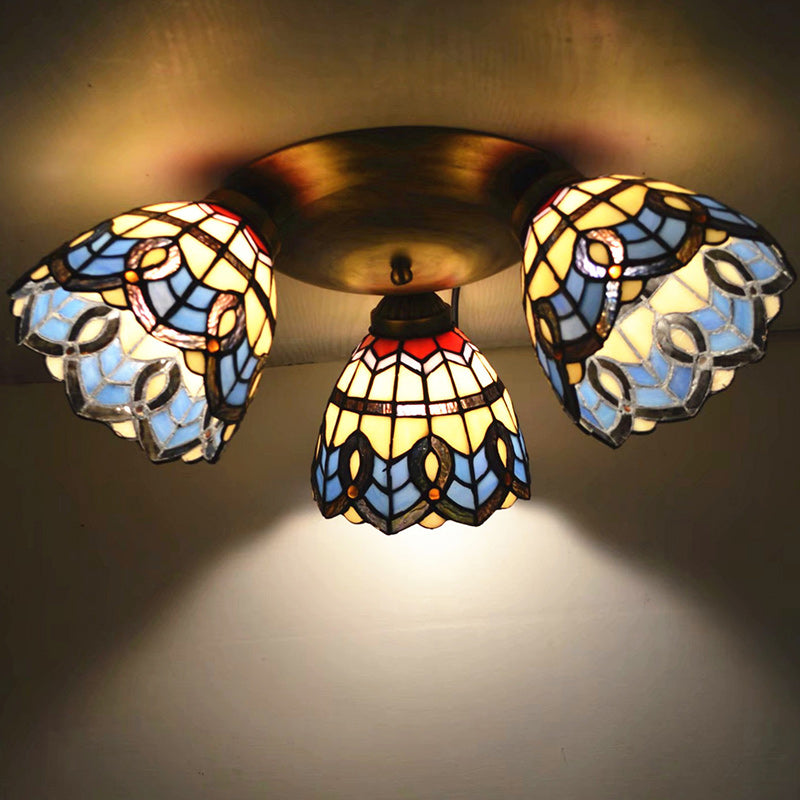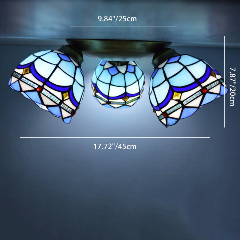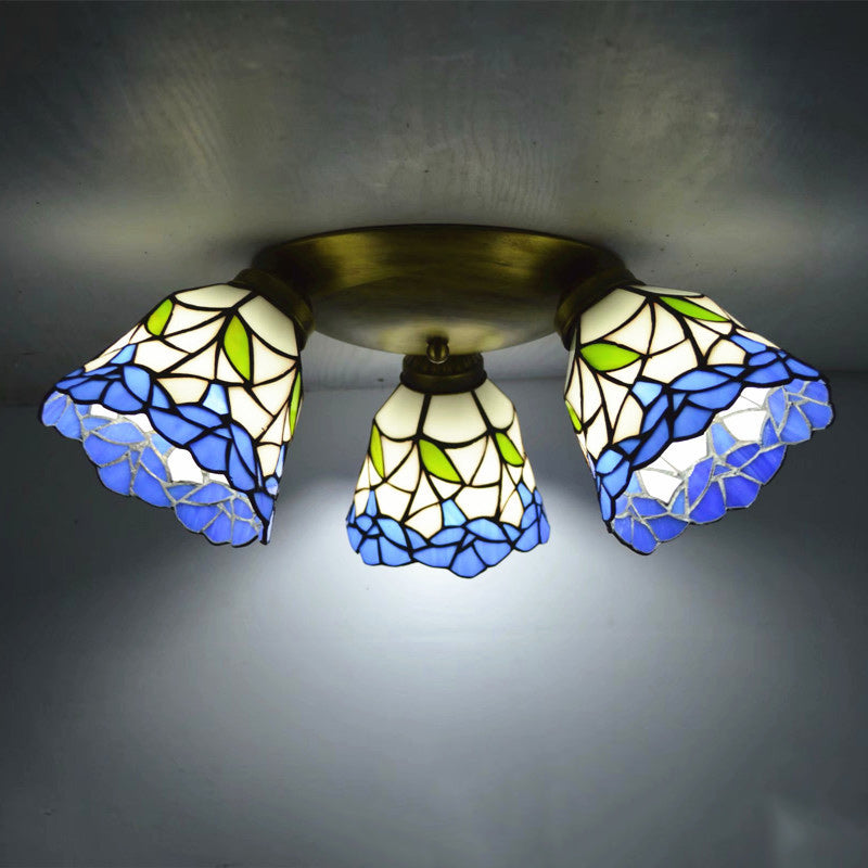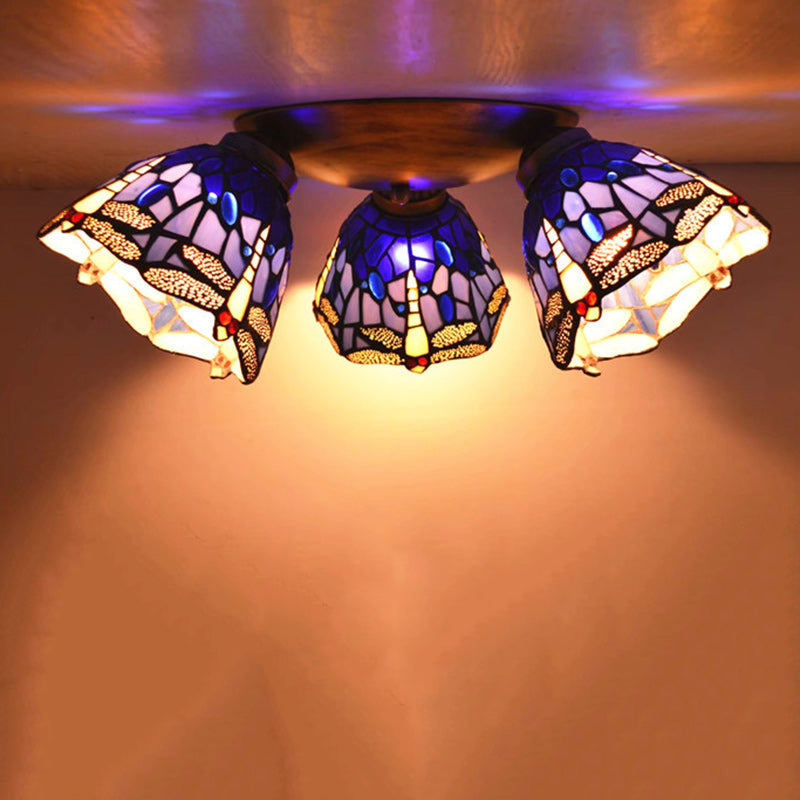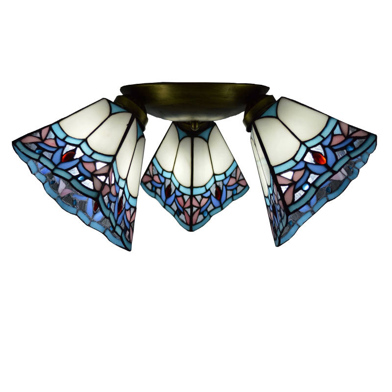 مصباح سقف تقليدي من تيفاني برانش دائري مربع من الزجاج والحديد بثلاثة مصابيح مثبت بشكل نصف مسطح لغرفة المعيشة