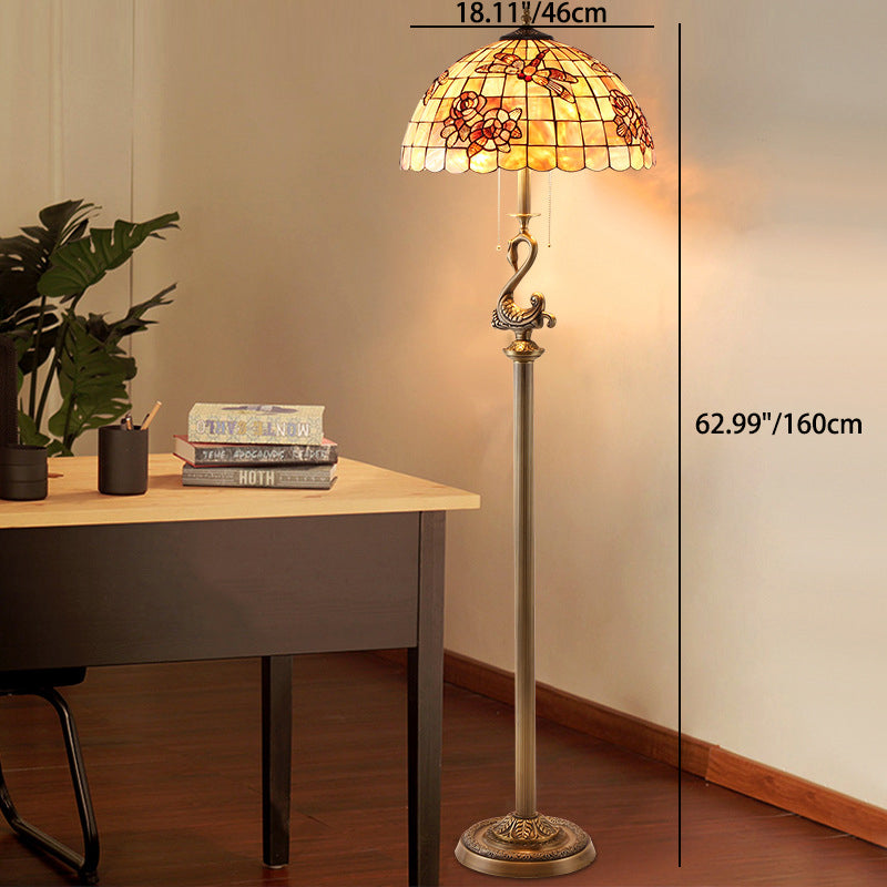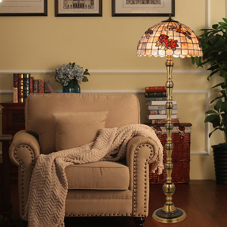 Traditional Tiffany Brass Shell Dome Rose Dragonfly 3-Light Standing Floor Lamp For Living Room