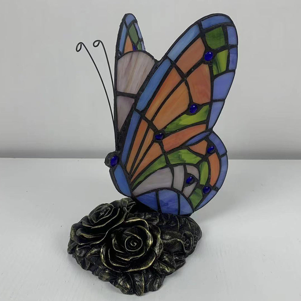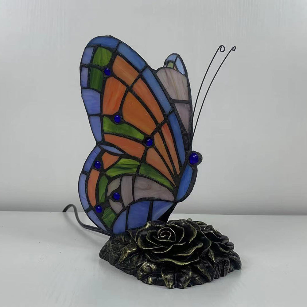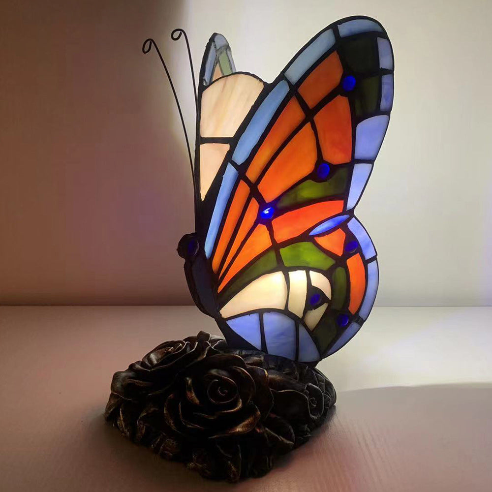 Traditional Tiffany Butterfly Rose Base Resin Glass 1-Light Table Lamp For Bedroom