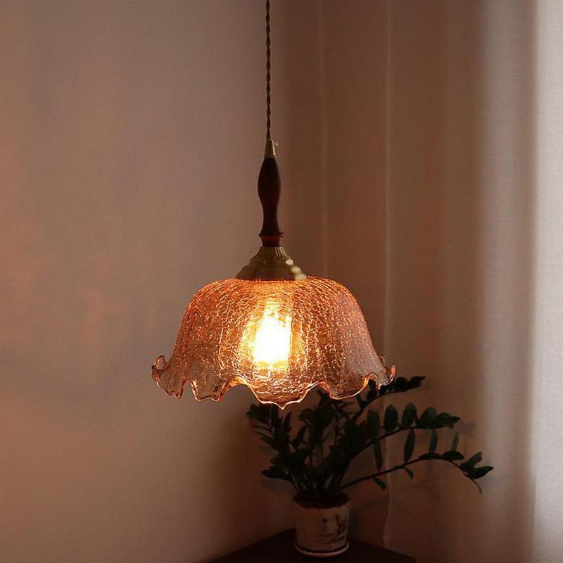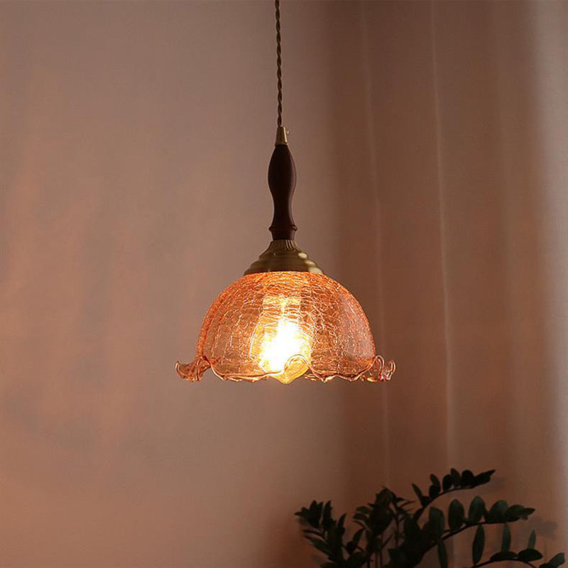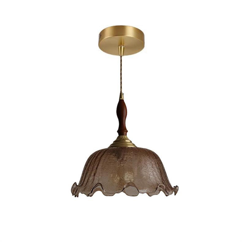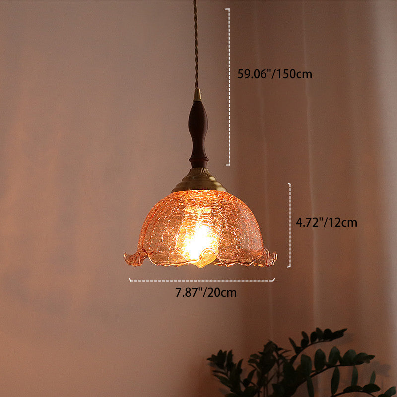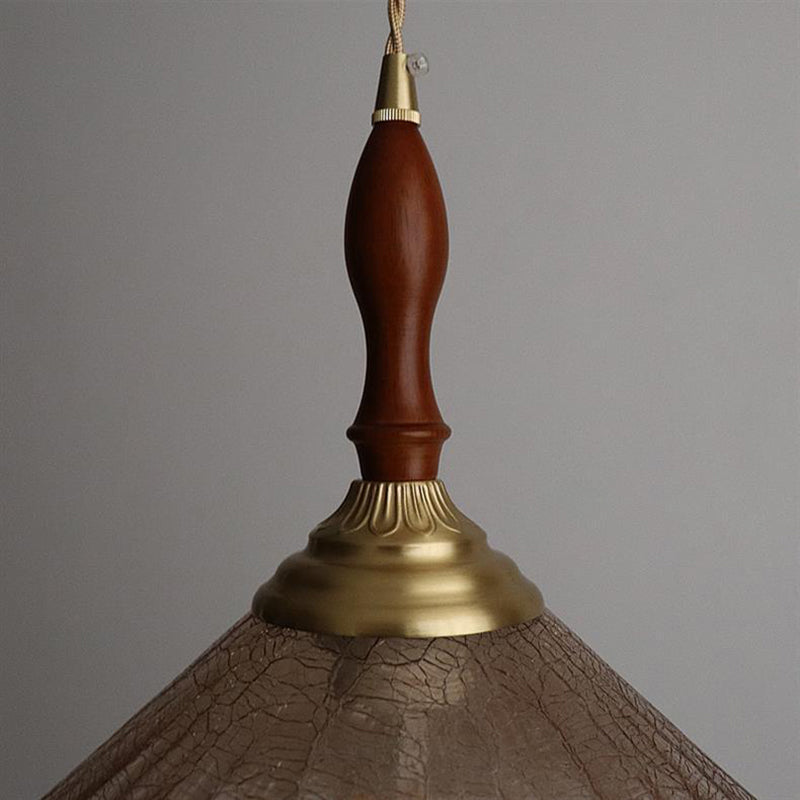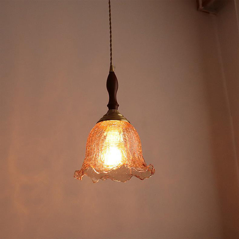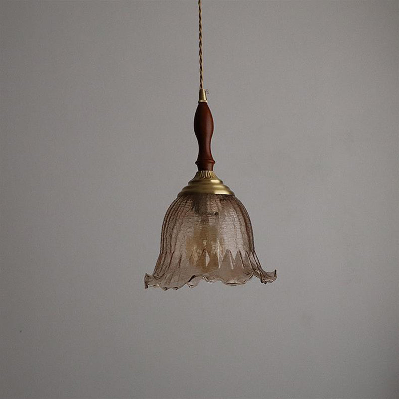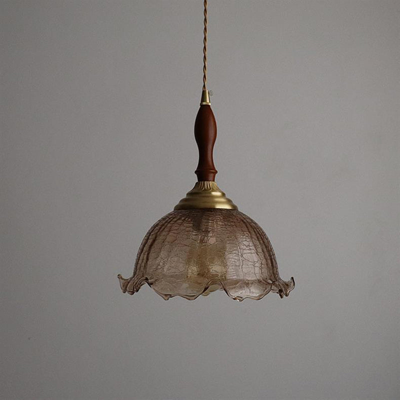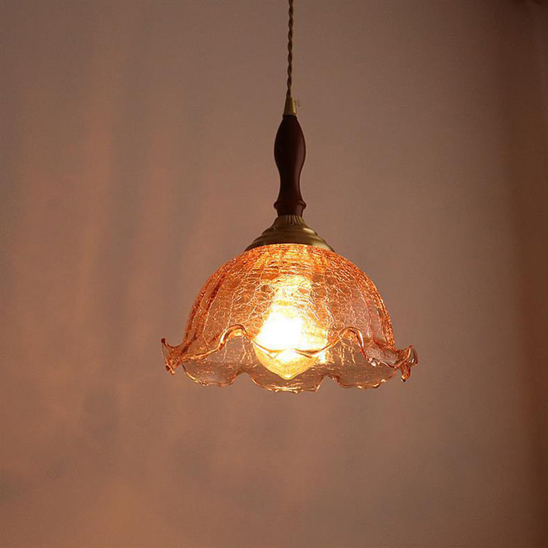 مصباح معلق تقليدي عتيق من النحاس الأصفر مع غطاء زهرة زجاجي متصدع لغرفة الطعام