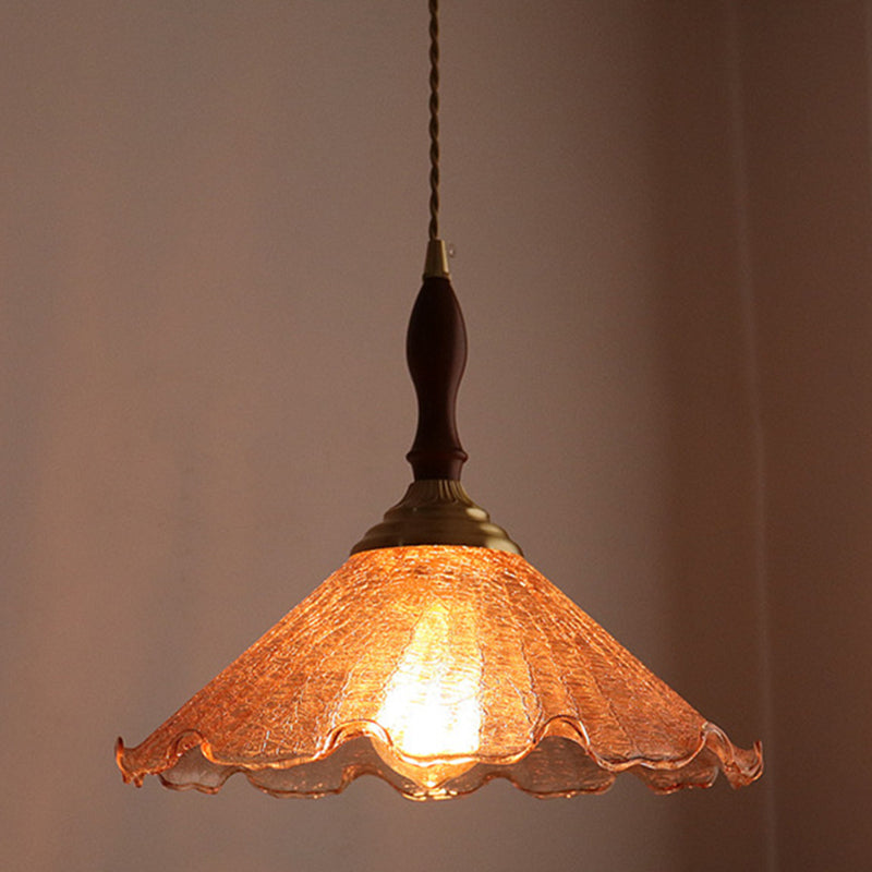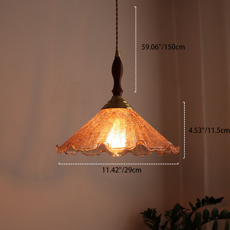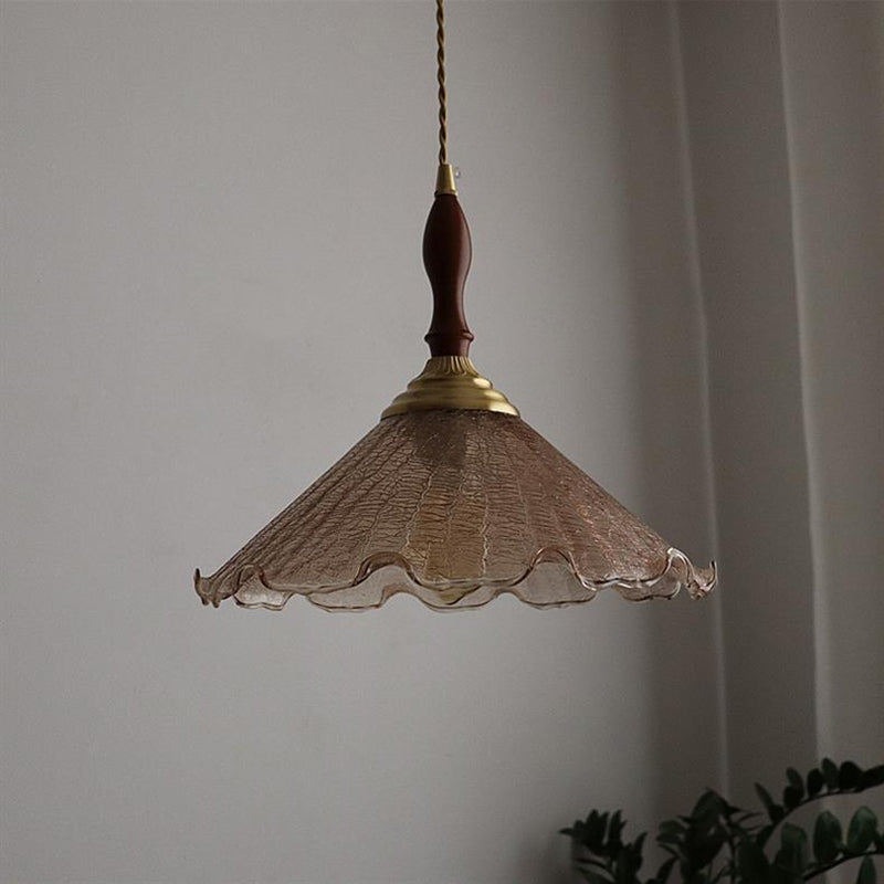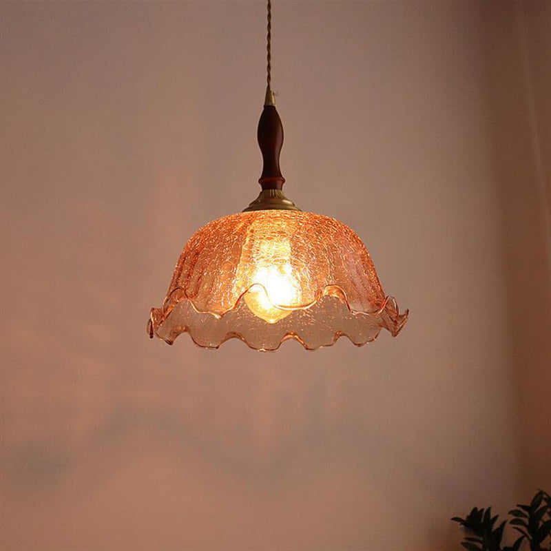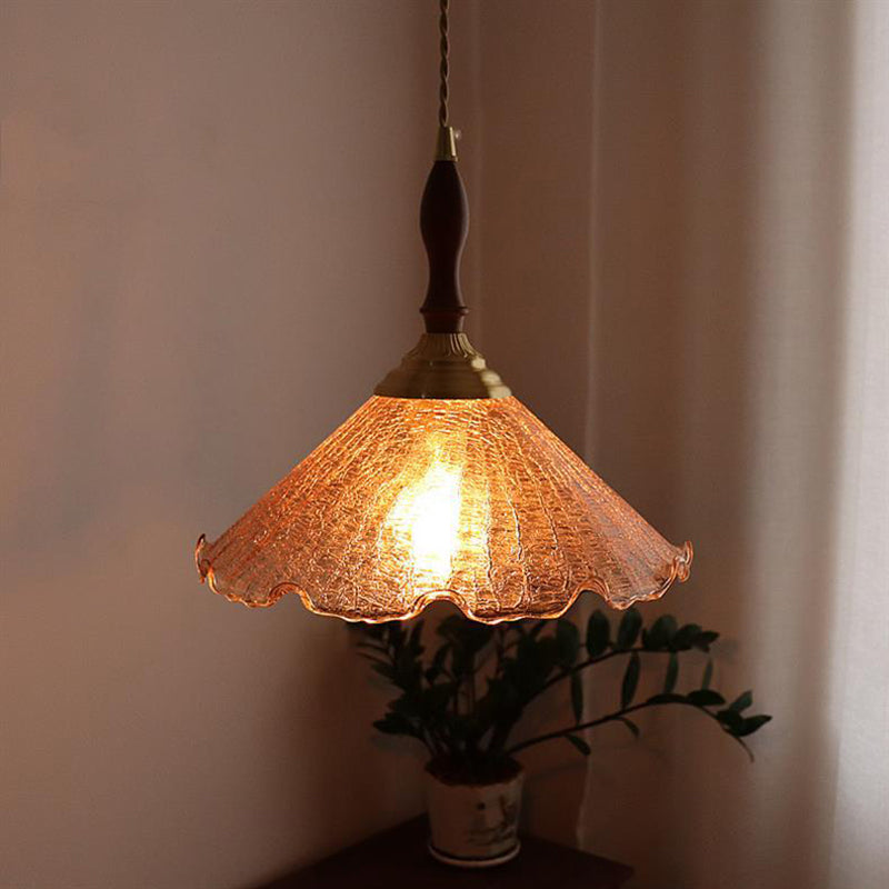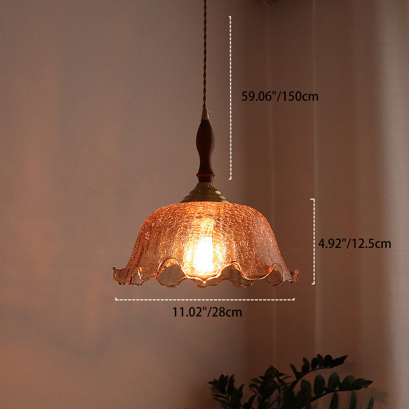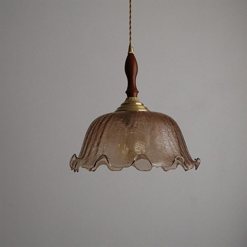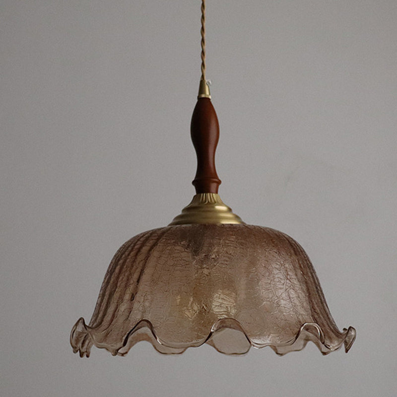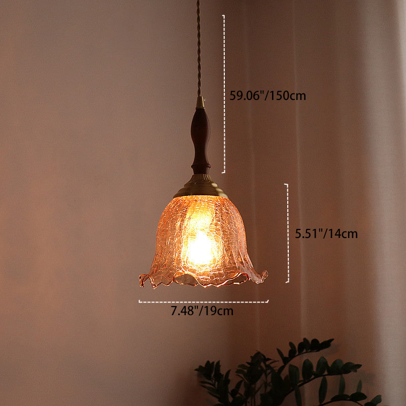 مصباح معلق تقليدي عتيق من النحاس الأصفر مع غطاء زهرة زجاجي متصدع لغرفة الطعام