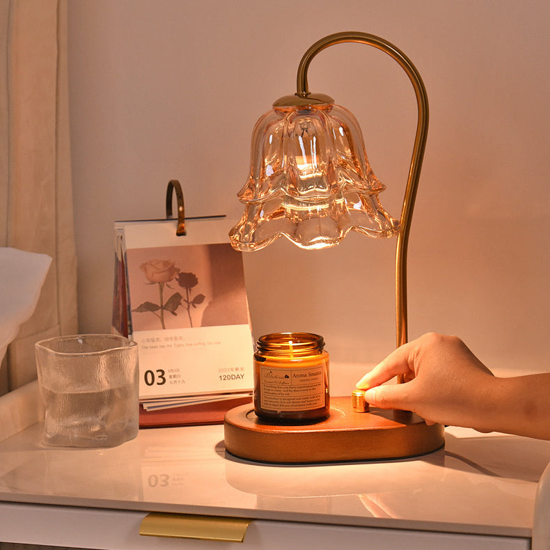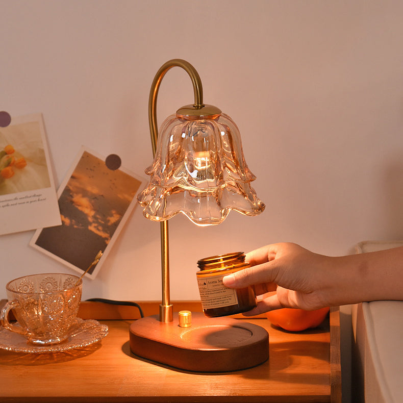 Contemporary Creative Bell Orchid Flower Solid Wood Base Hardware Frame Glass Shade 1-Light Aromatherapy Melting Wax Table Lamp For Bedroom