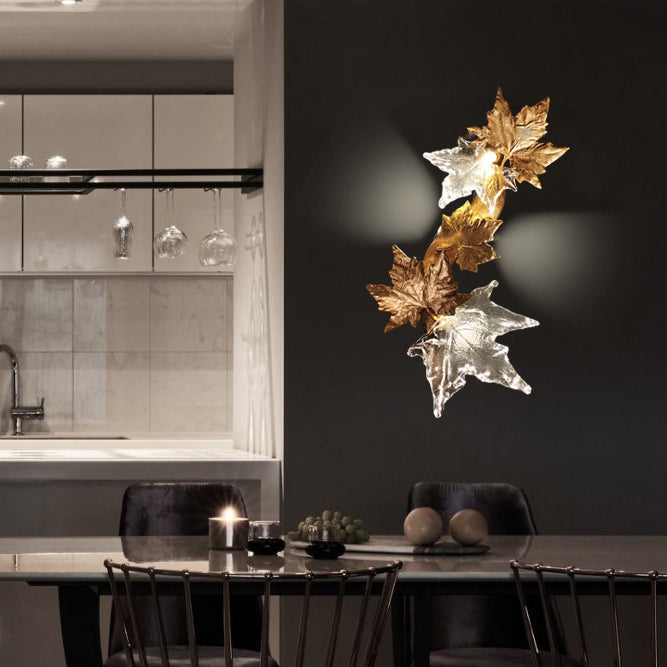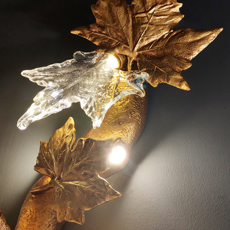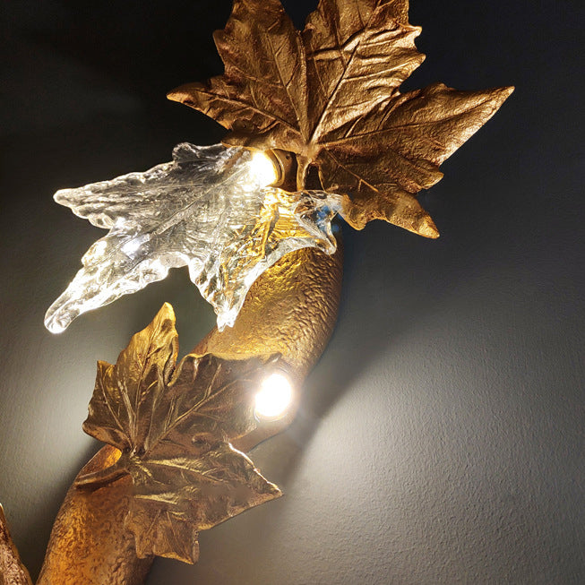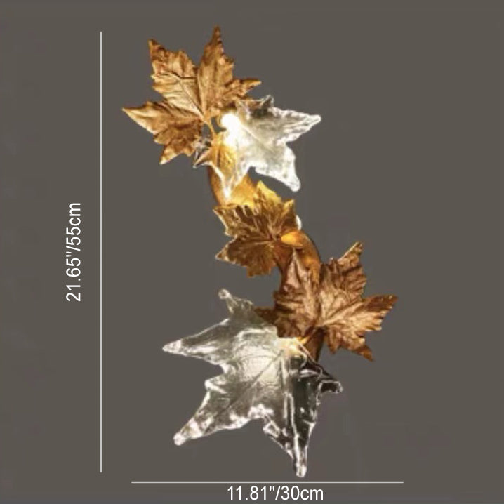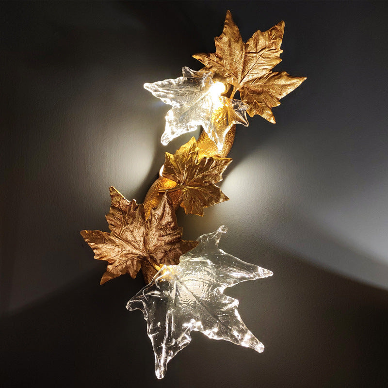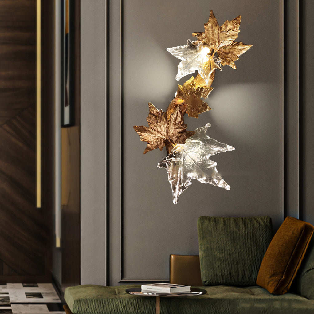 Contemporary Creative Copper Glass Splicing Maple Leaves Design 2-Light Wall Sconce Lamp For Living Room