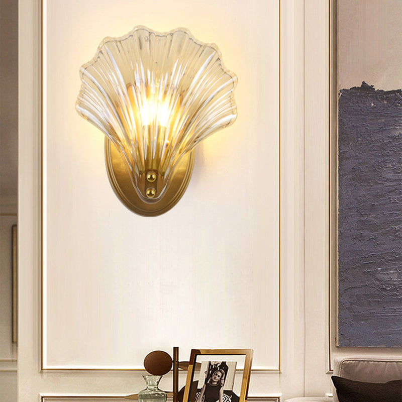 Elevate your space with this contemporary creative wall sconce lamp, crafted from iron and glass in a delicate shell shape. Available in amber, smoky gray, and clear colors, this 1-light fixture adds a touch of elegance and charm to bedrooms, living rooms, and hallways.
