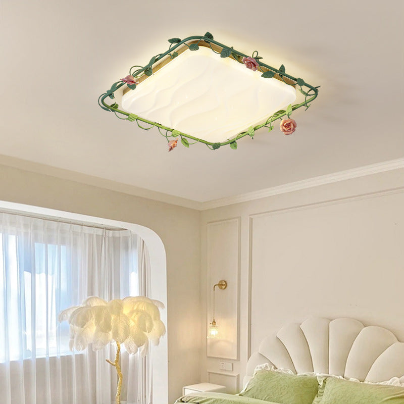 Contemporary Creative Square Rectangular Rose Vine Rubberwood Base Iron Acrylic Ceramic LED Flush Mount Ceiling Light For Living Room