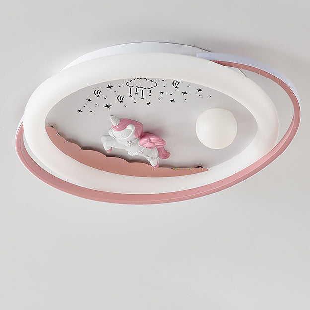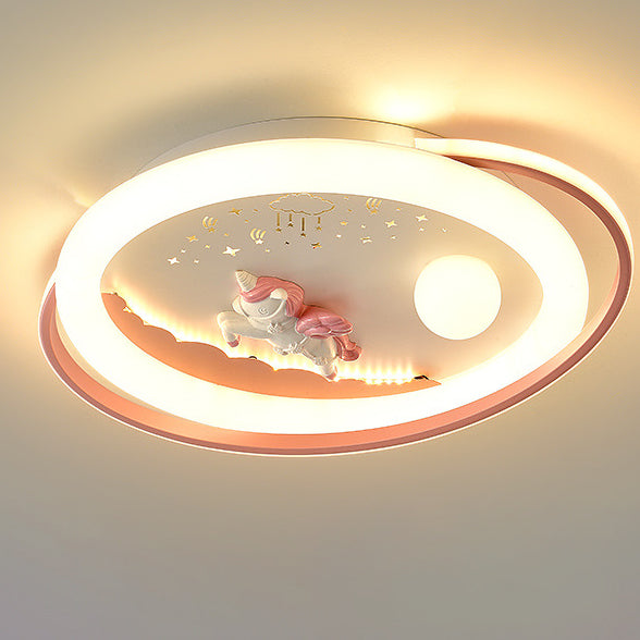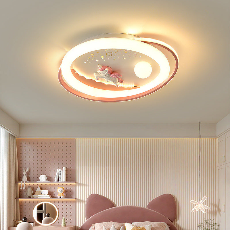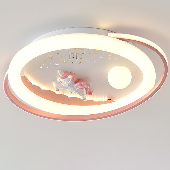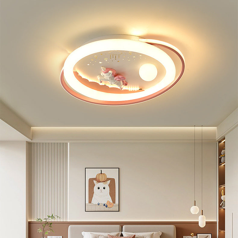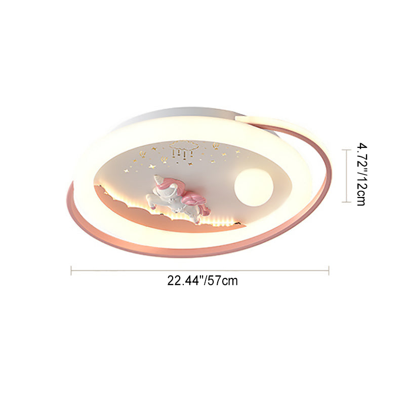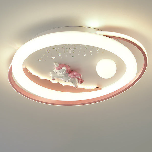 Contemporary Creative Unicorn Astronaut Rocket Round Iron Acrylic Resin LED Flush Mount Ceiling Light For Bedroom
