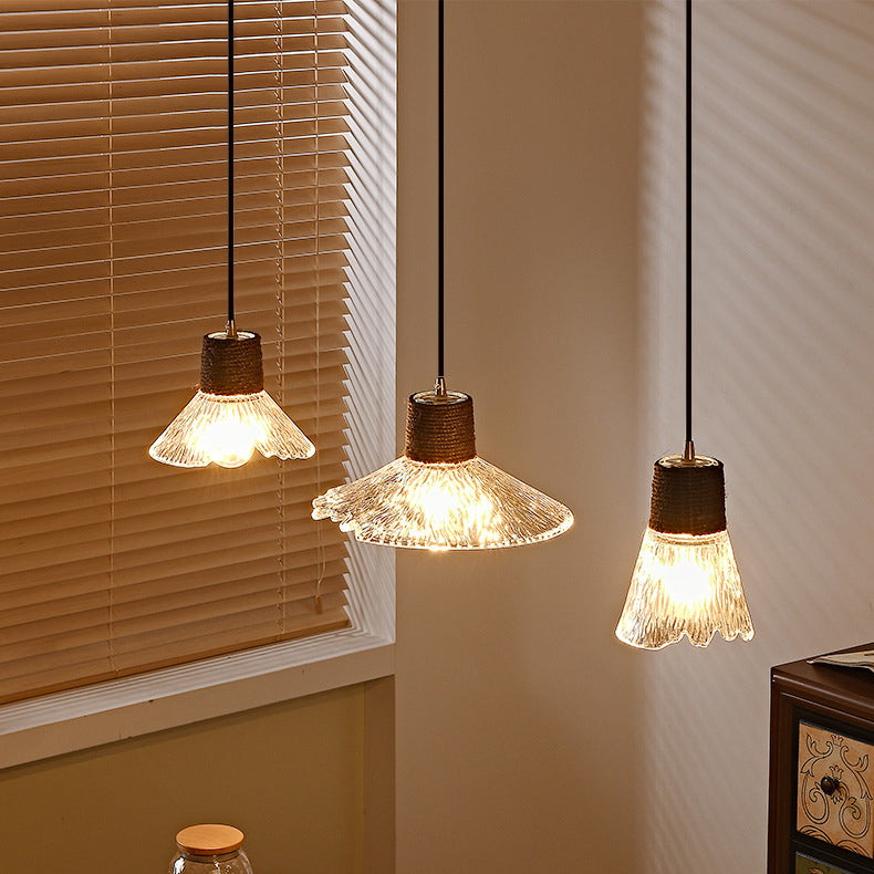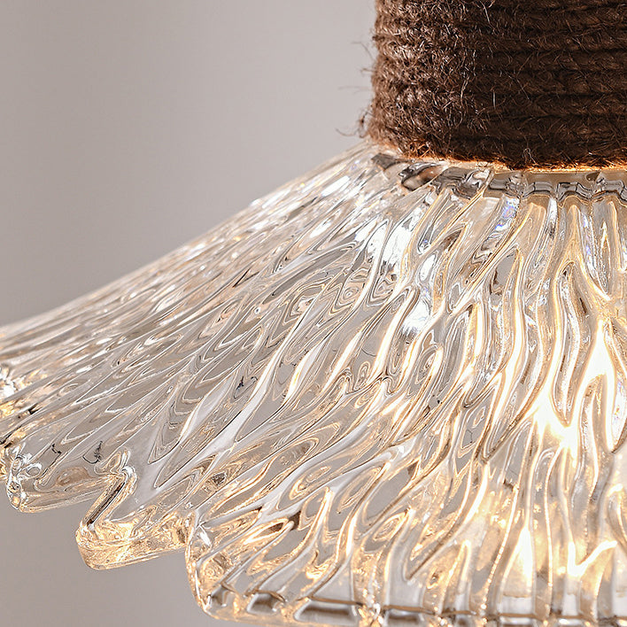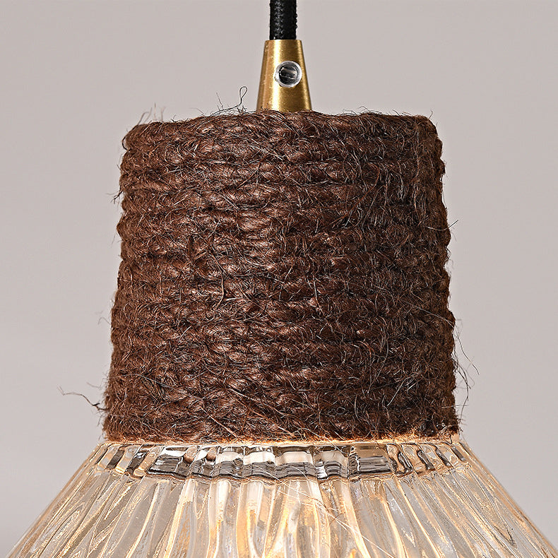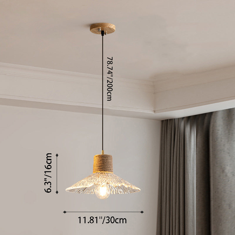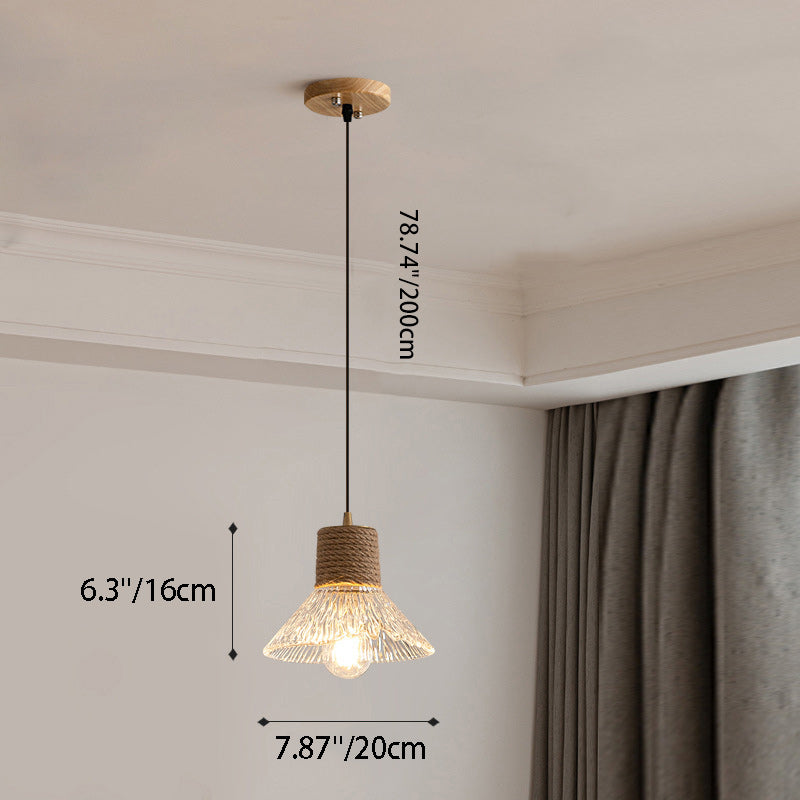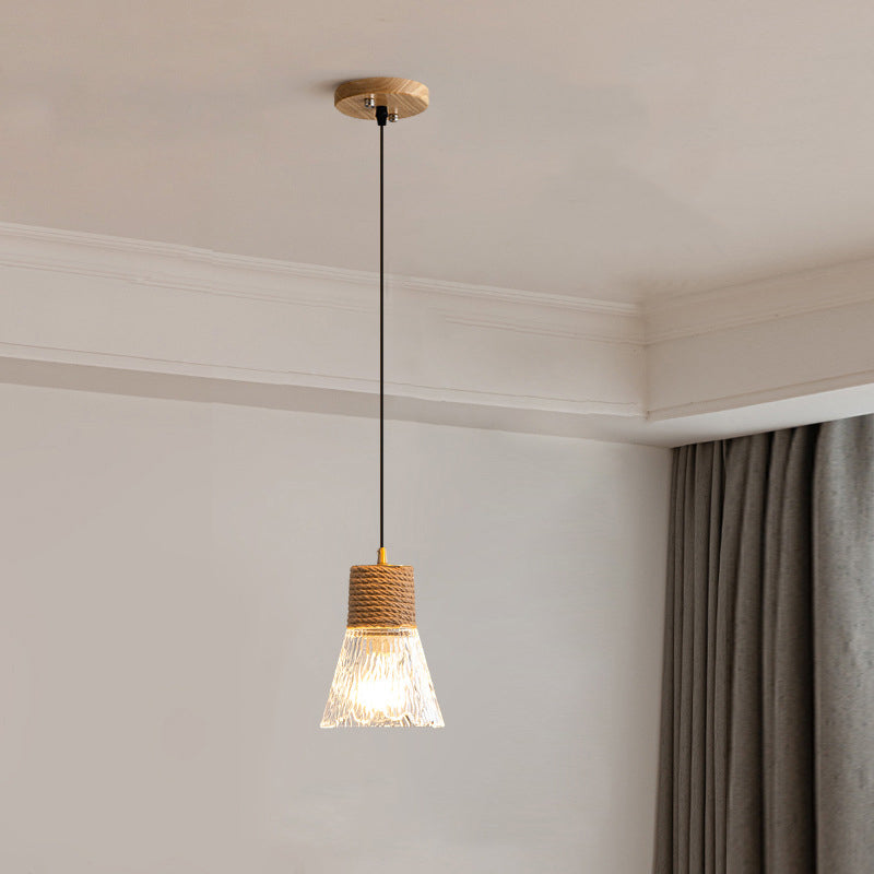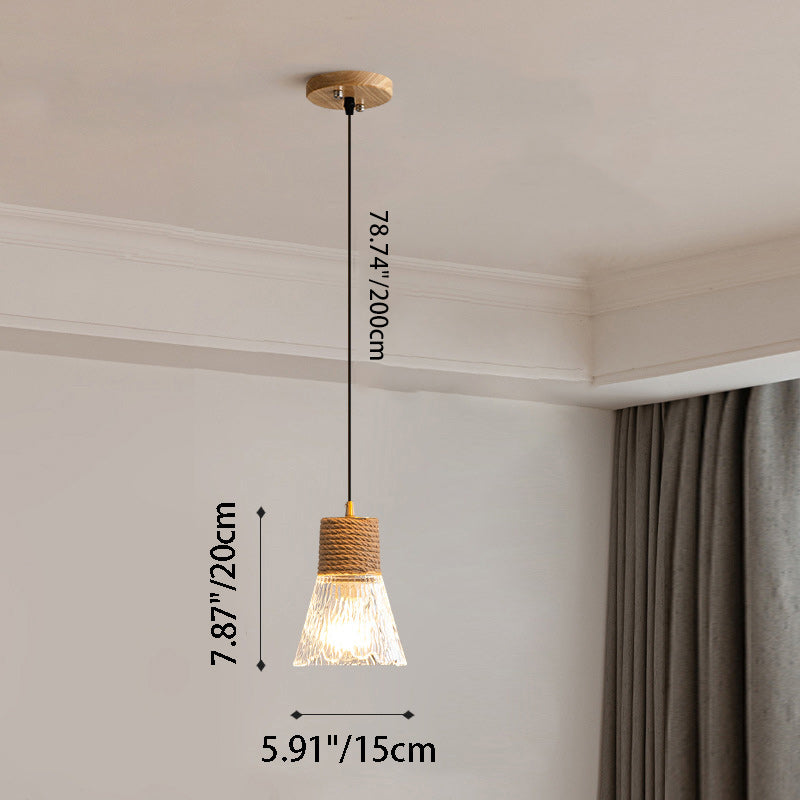 Contemporary Nordic Hemp Rope Wood Glass Conical 1-Light Pendant Light For Living Room