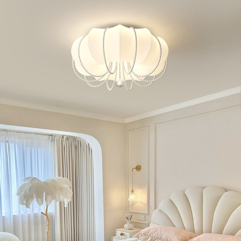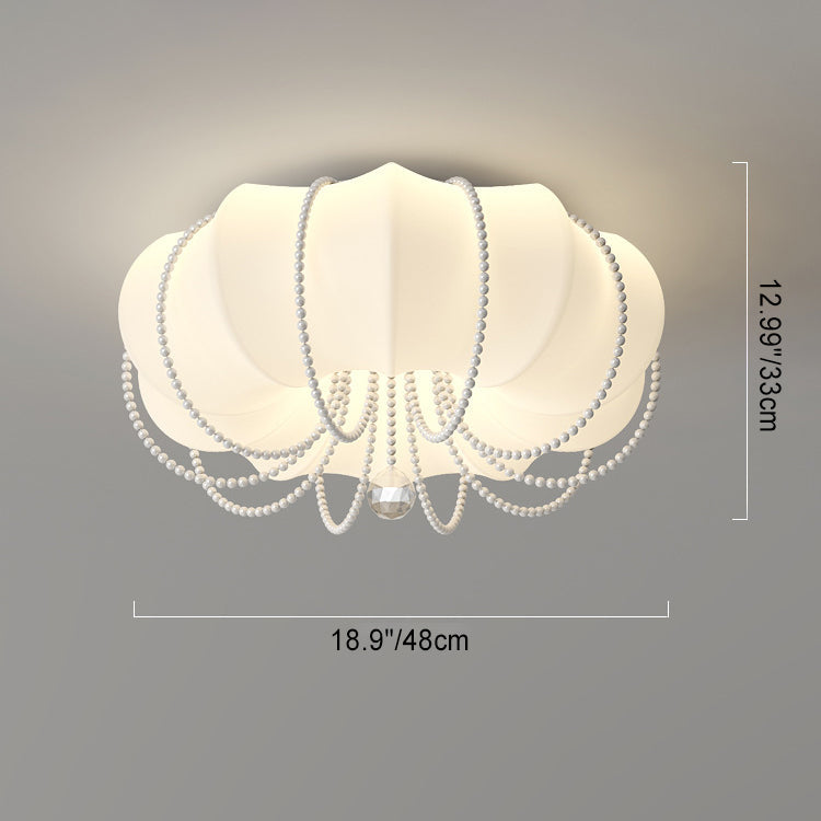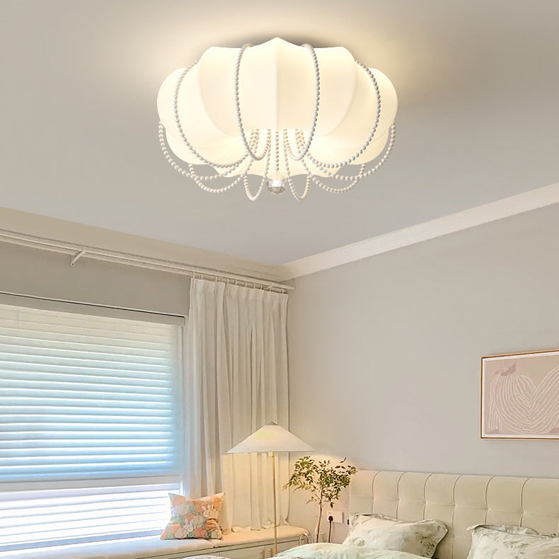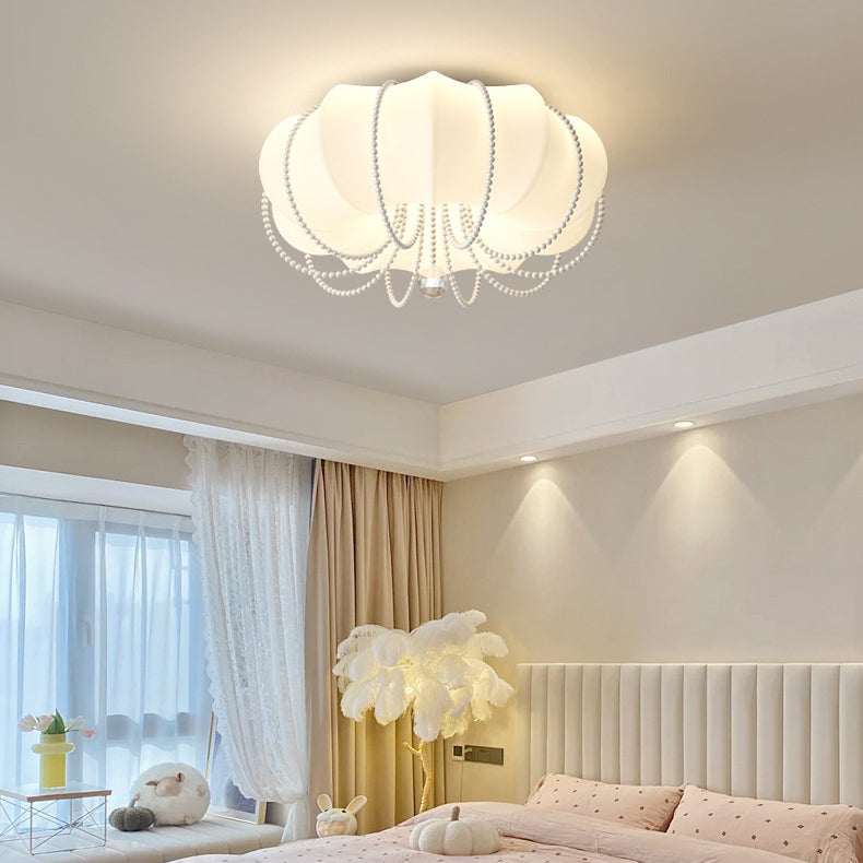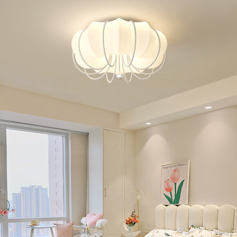 Contemporary Nordic Iron PE Pumpkin Shade Pearl Decoration LED Flush Mount Ceiling Light For Bedroom