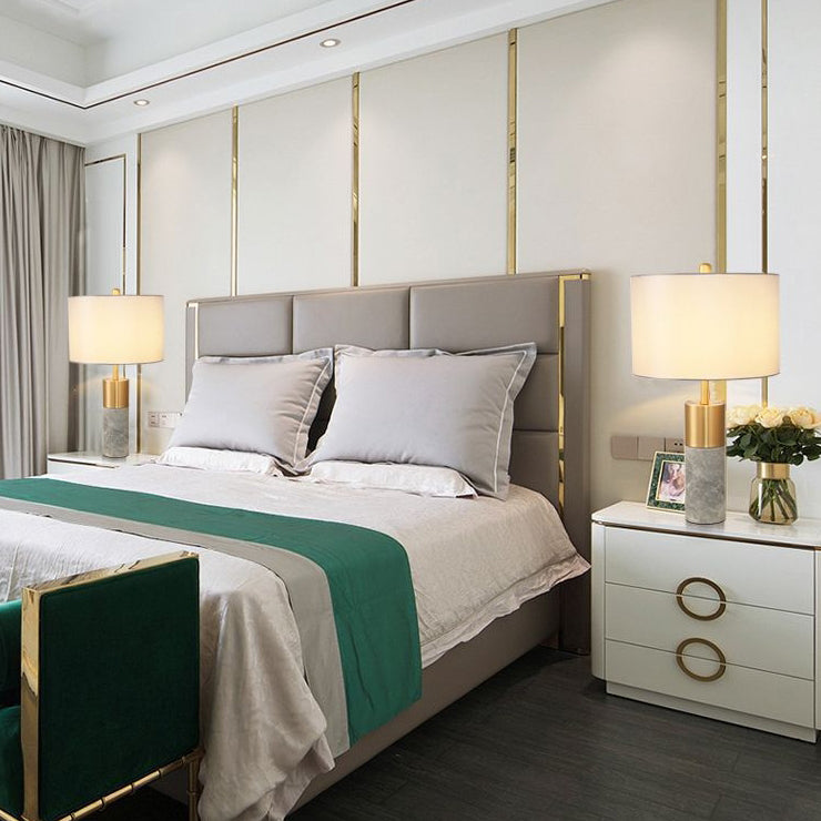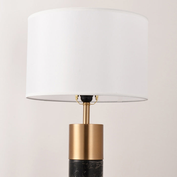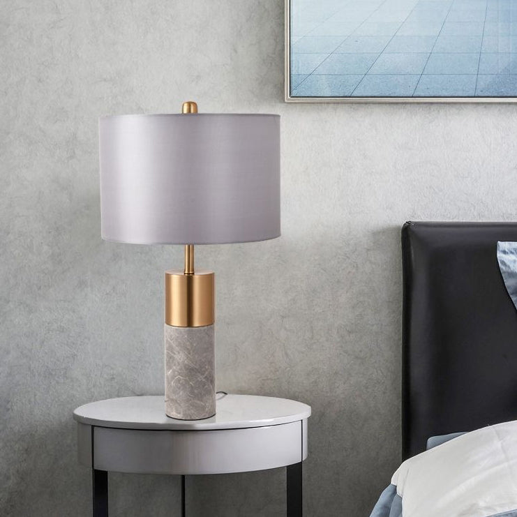 Contemporary Nordic Marble Base Cylindrical Drum Shade Fabric 1-Light Table Lamp For Bedroom