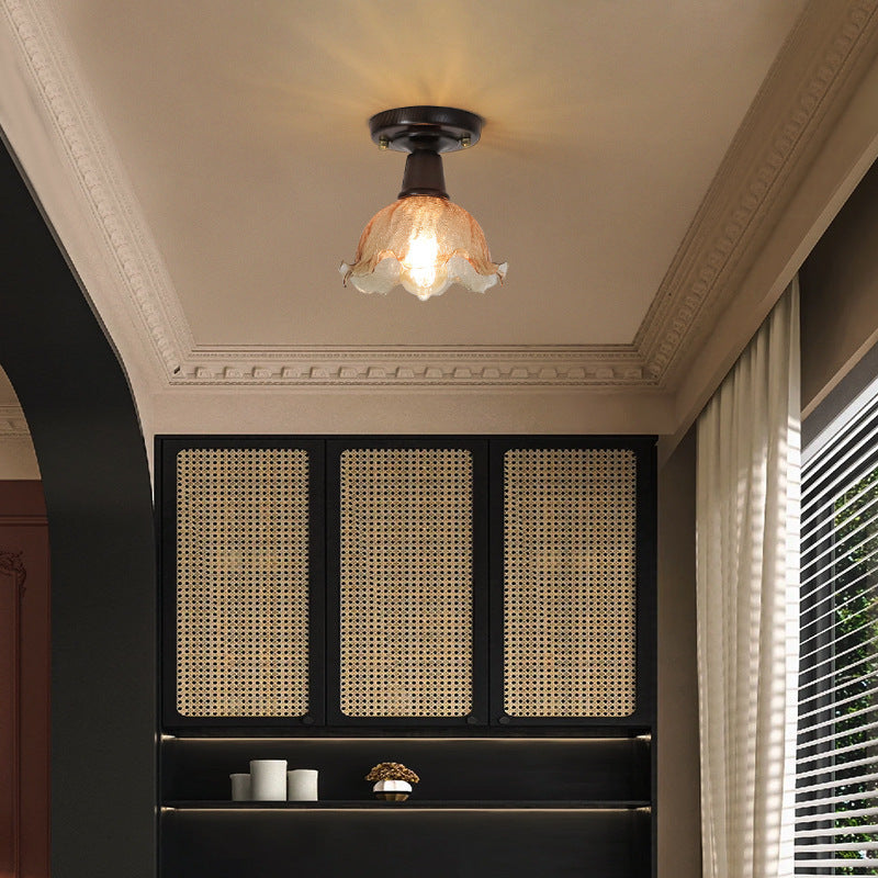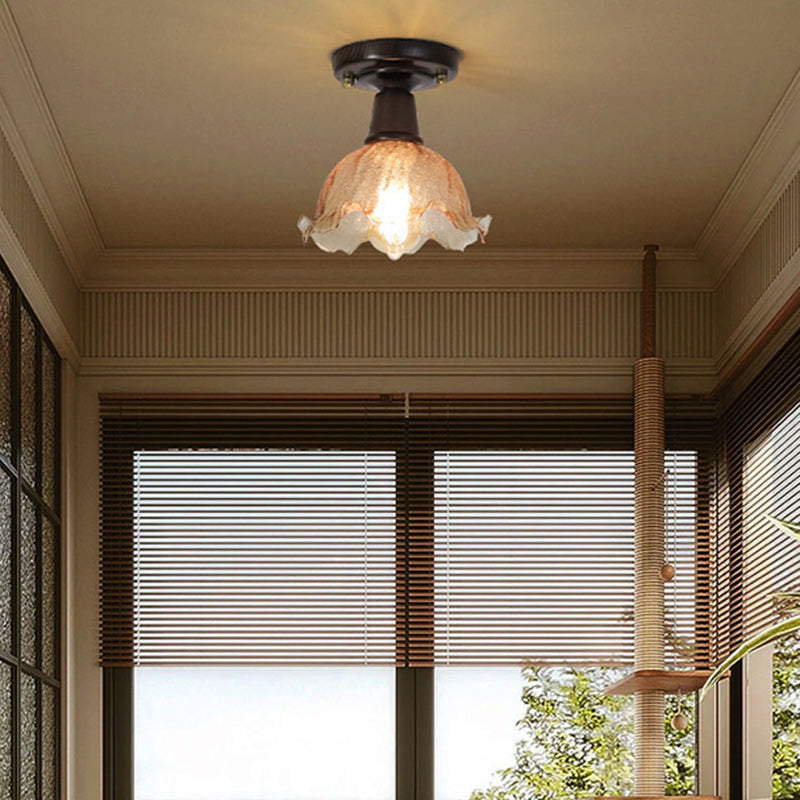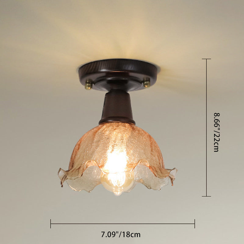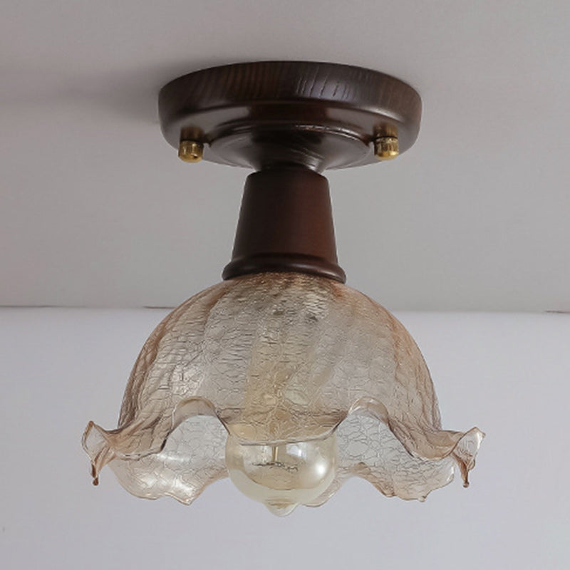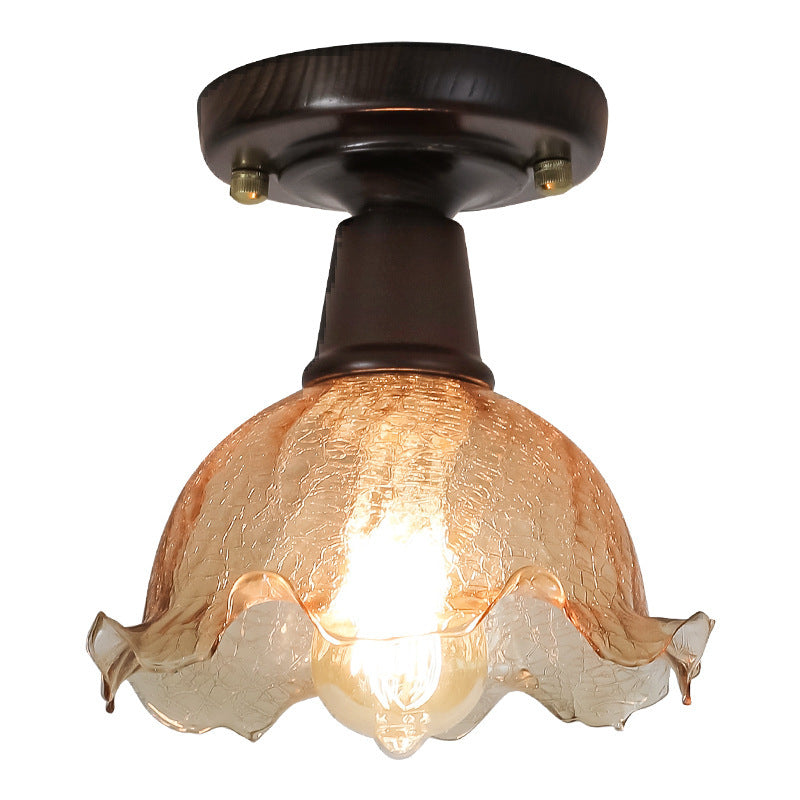 Contemporary Retro Crackle Flower Ash Wood Glass 1-Light Semi-Flush Mount Ceiling Light For Hallway