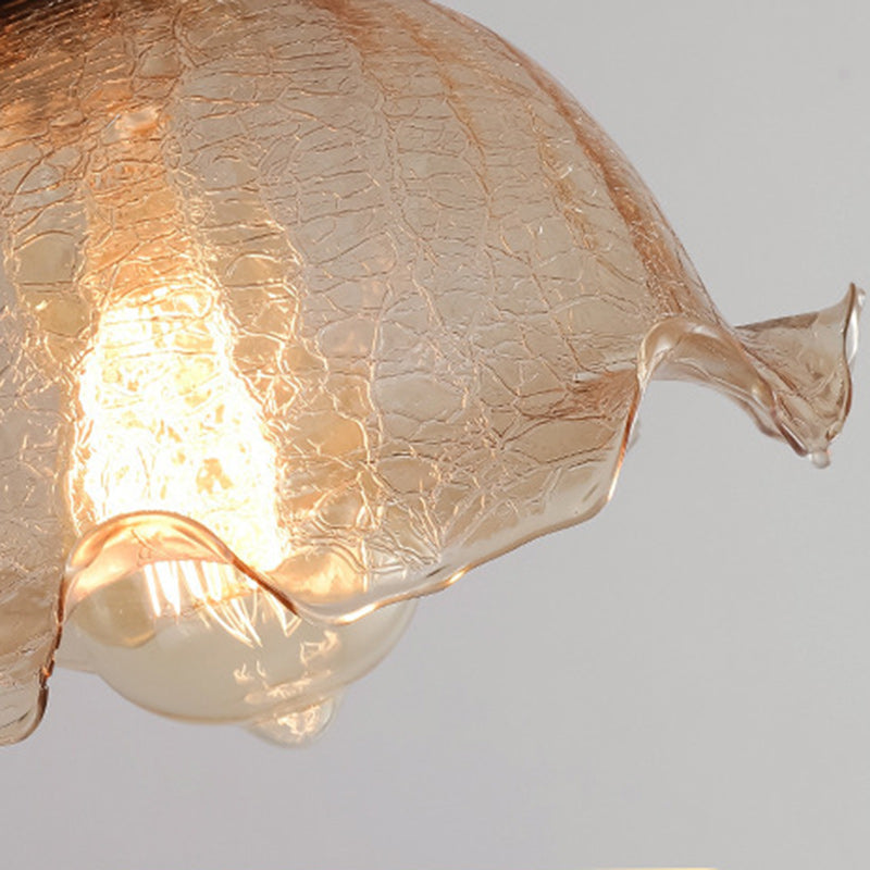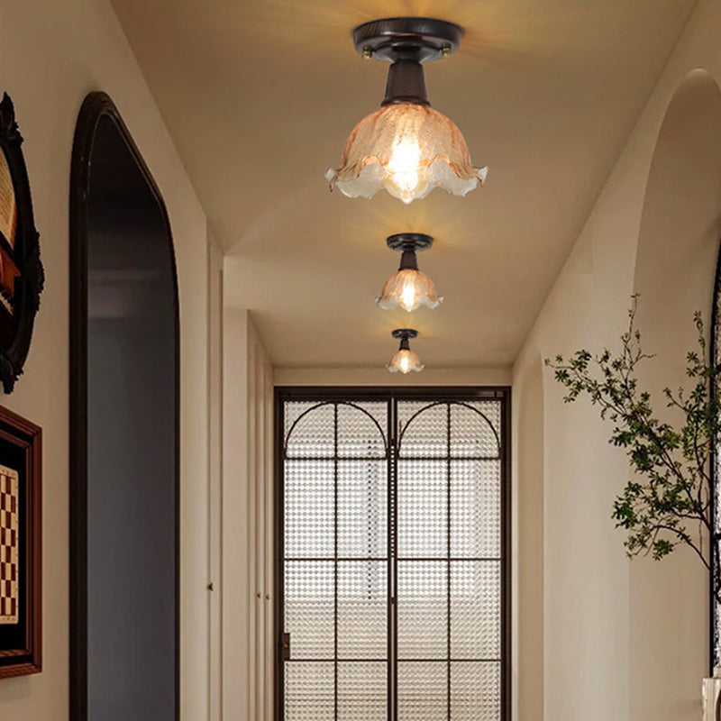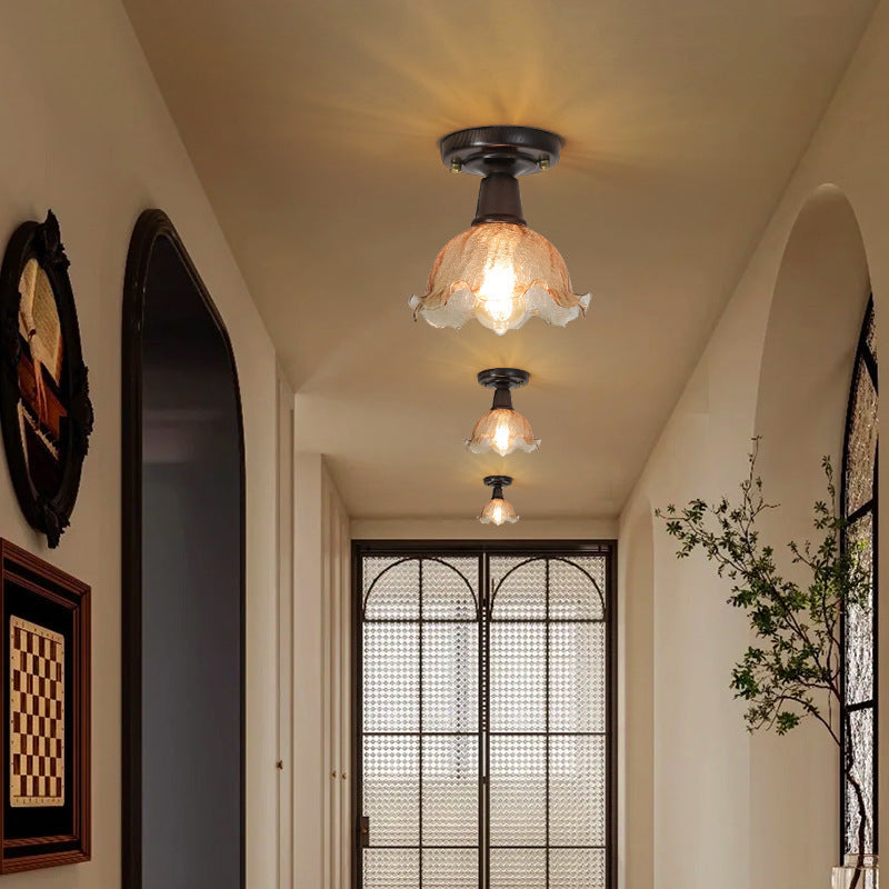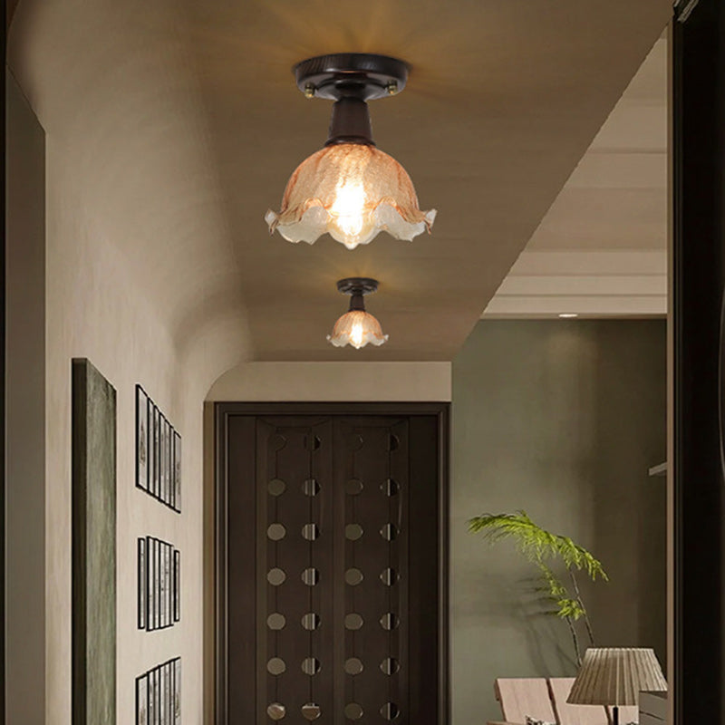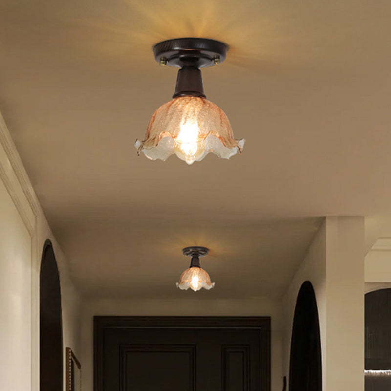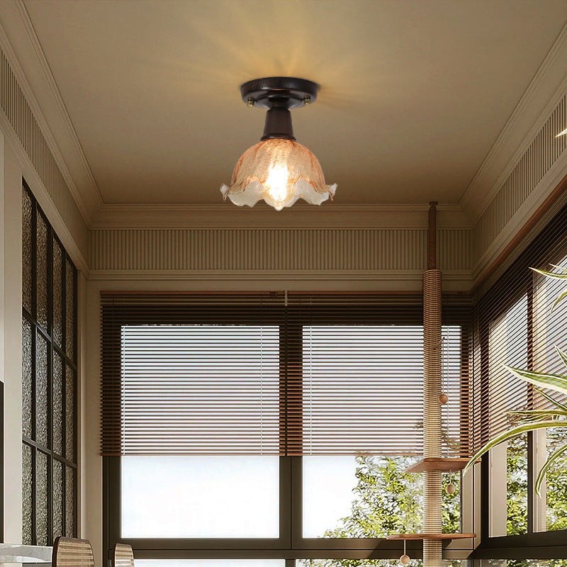 Contemporary Retro Crackle Flower Ash Wood Glass 1-Light Semi-Flush Mount Ceiling Light For Hallway