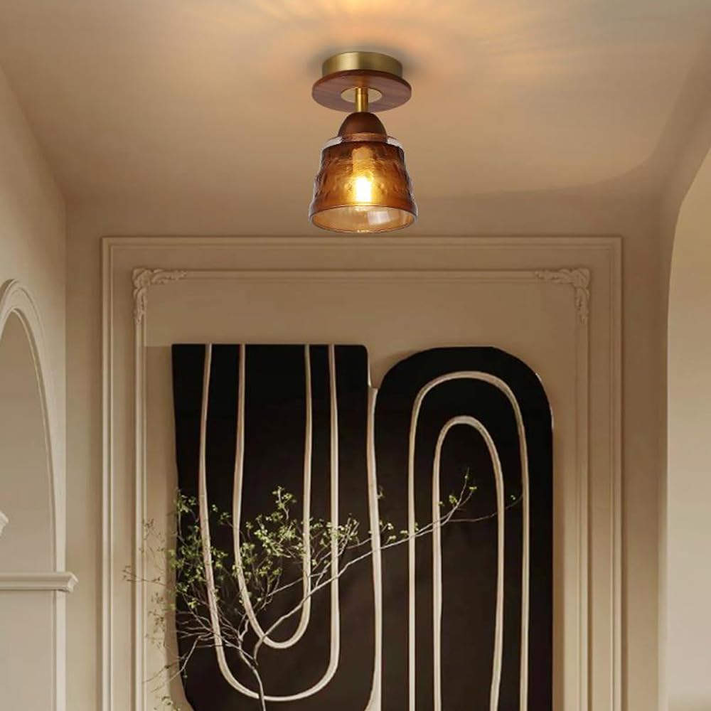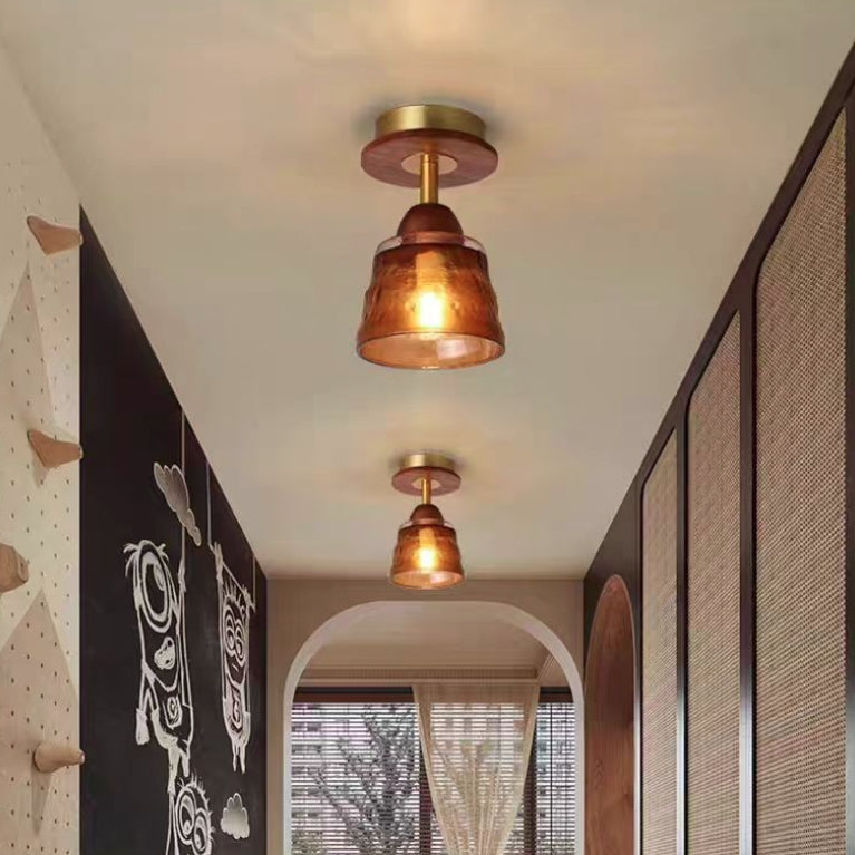 Contemporary Retro Glass Cup Shade Solid Wood 1-Light Semi-Flush Mount Ceiling Light For Living Room