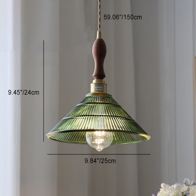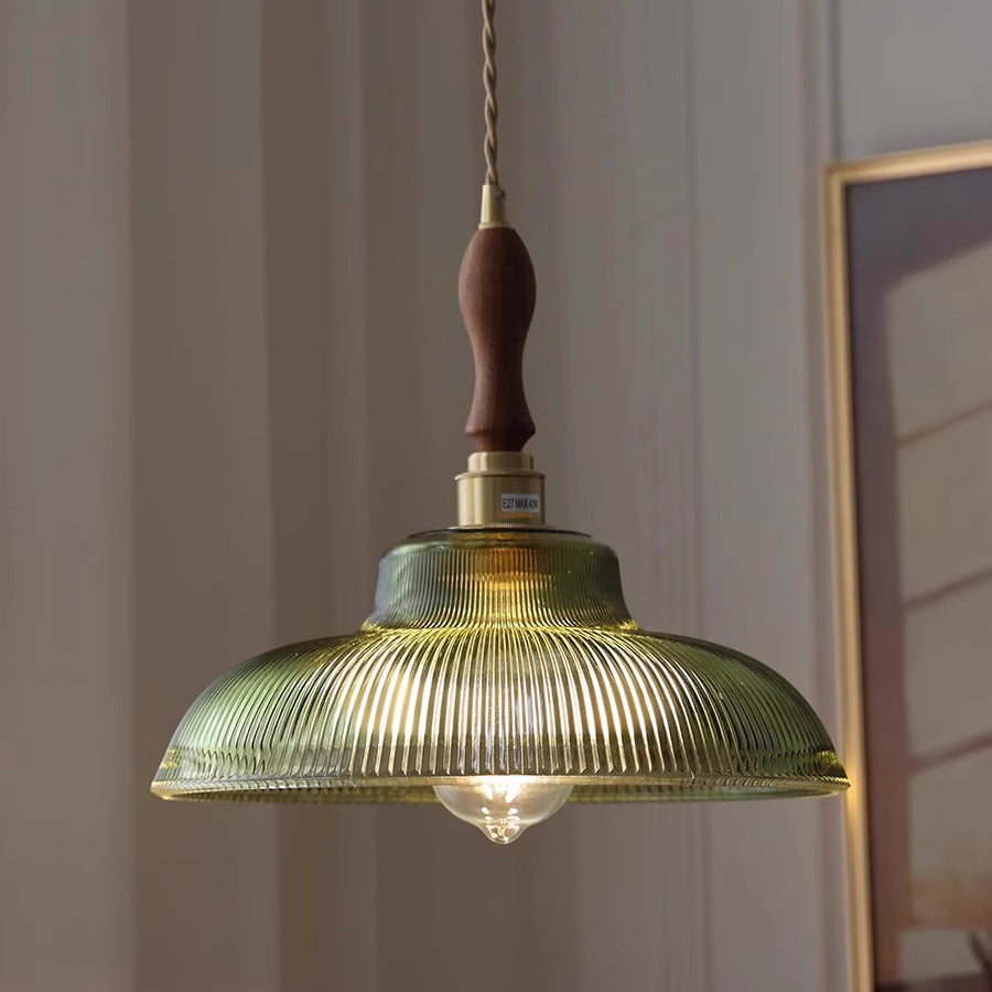 Contemporary Retro Stripe Hat Shape Brass Walnut Glass 1 - Light Pendant Light For Dining Room