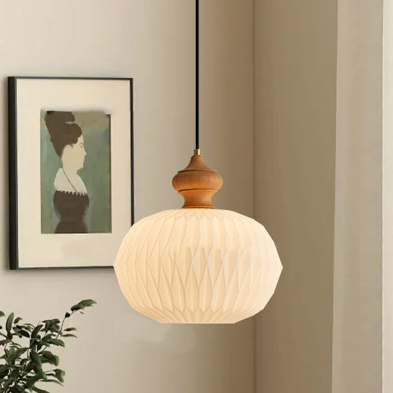 Contemporary Retro Walnut Brass Glass Round Lantern Origami Texture 1-Light Pendant Light For Dining Room