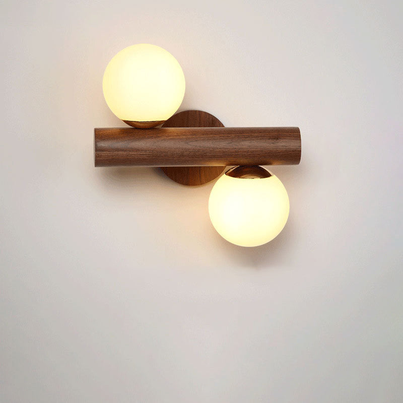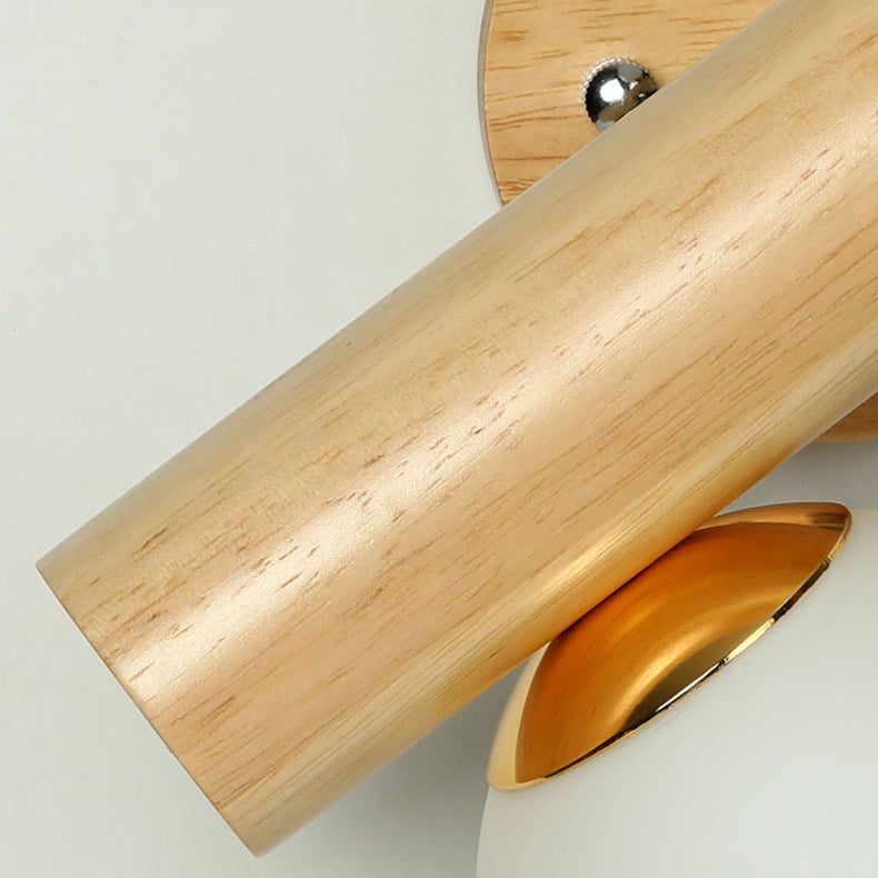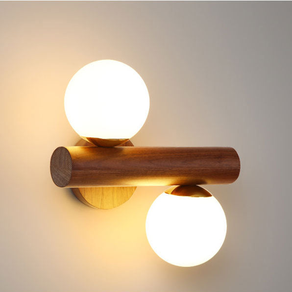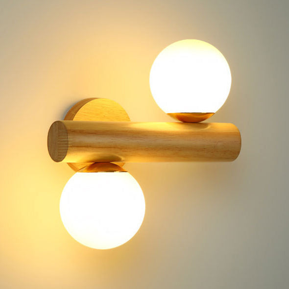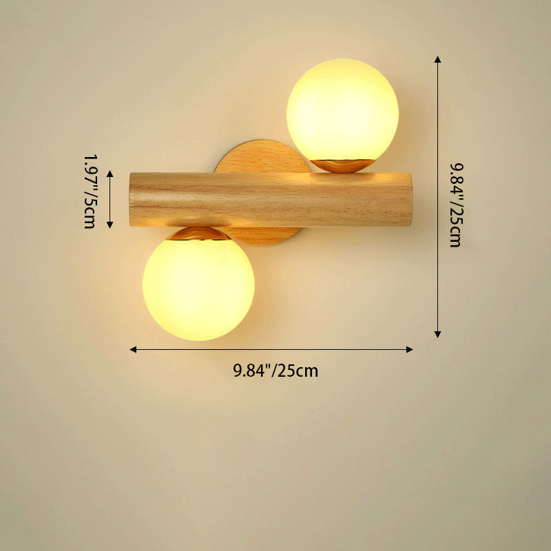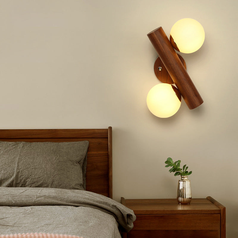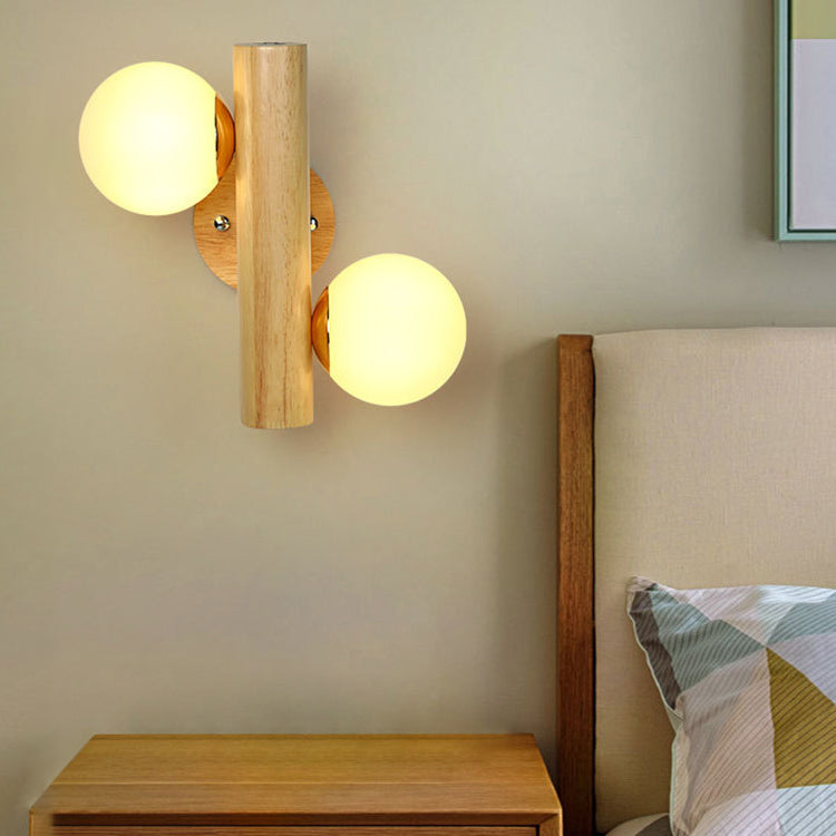 Contemporary Scandinavian Cylinder Orb Rubberwood Glass 2-Light Wall Sconce Lamp For Bedroom