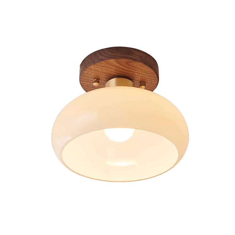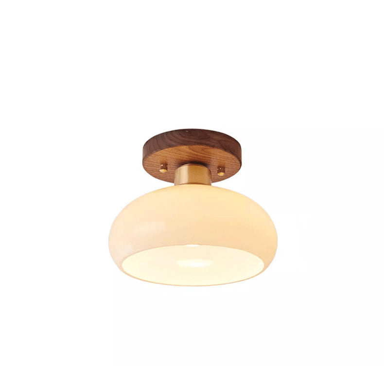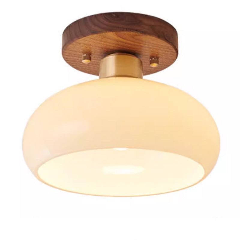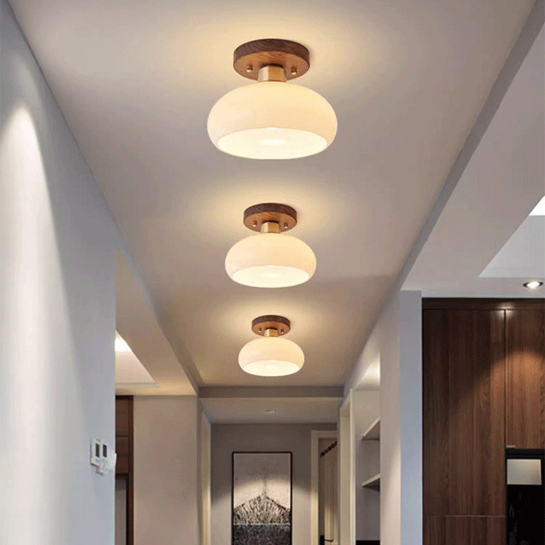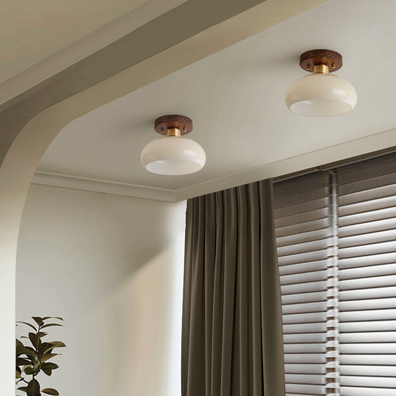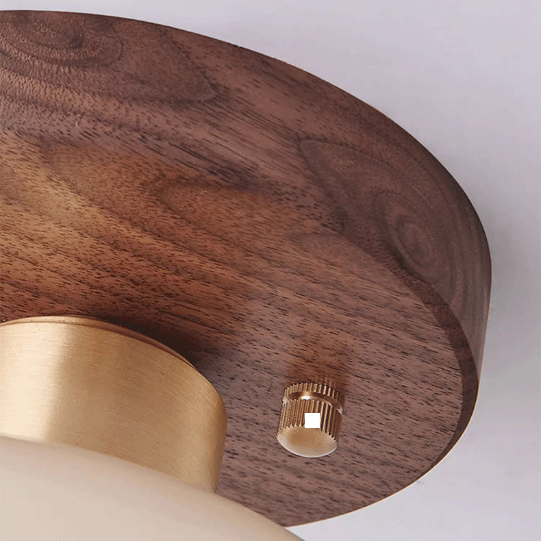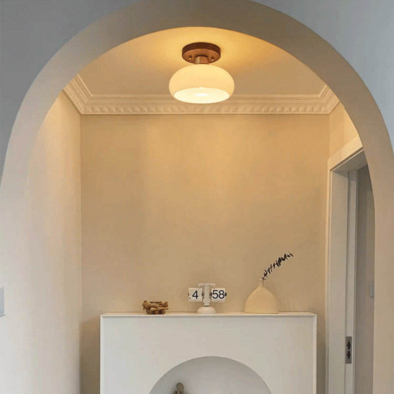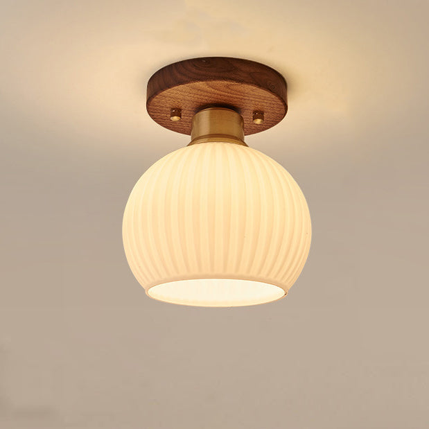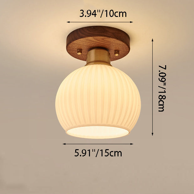 Contemporary Scandinavian Exposed Concealed Installation Drum Round Bowl Ribbed Glass Iron Wood Copper 1-Light Semi-Flush Mount Ceiling Light For Hallway