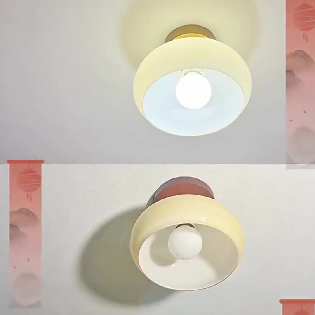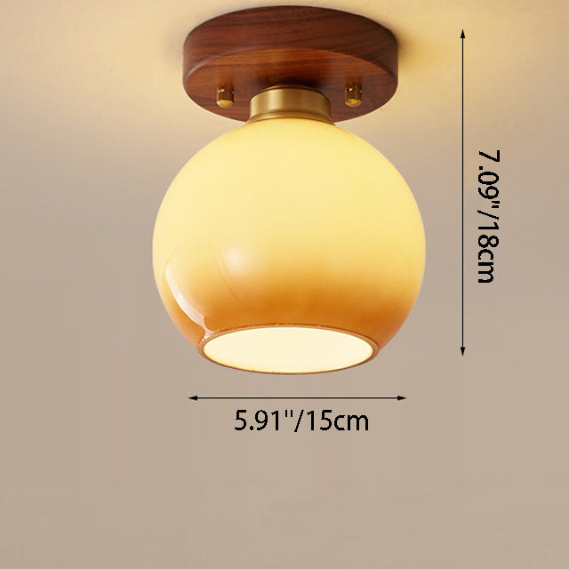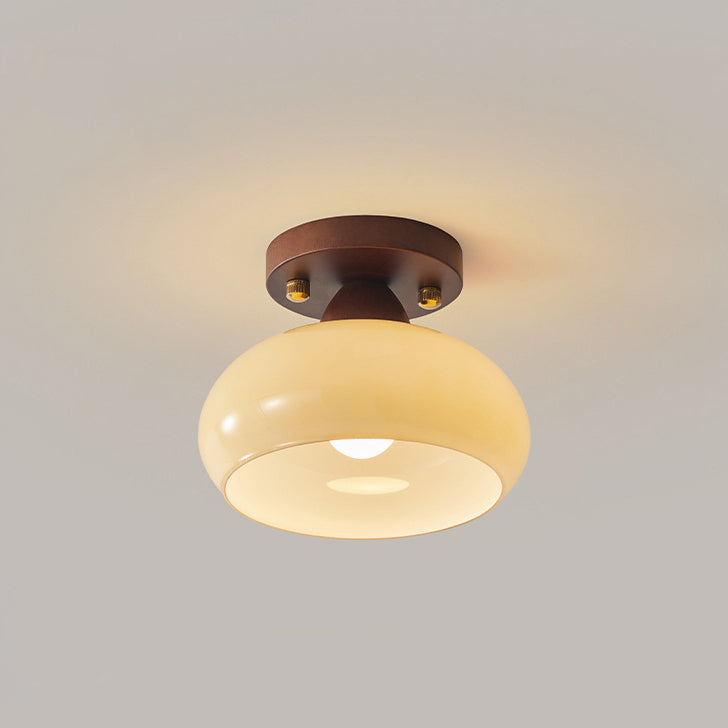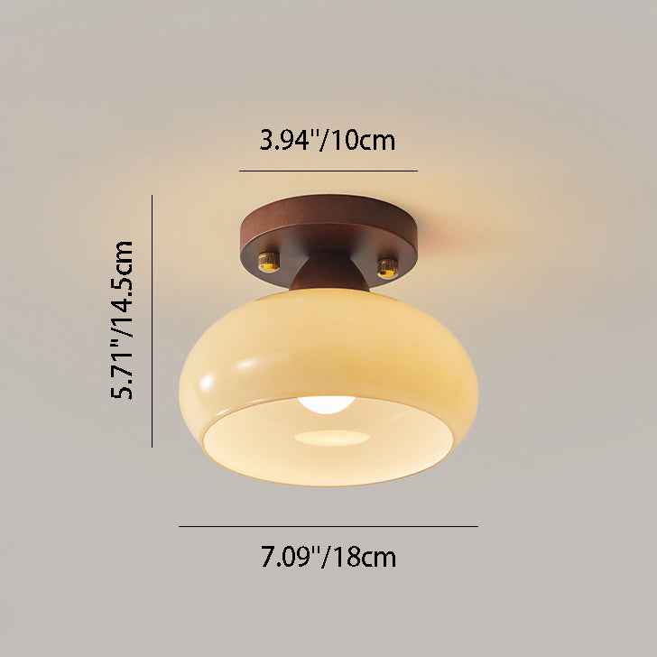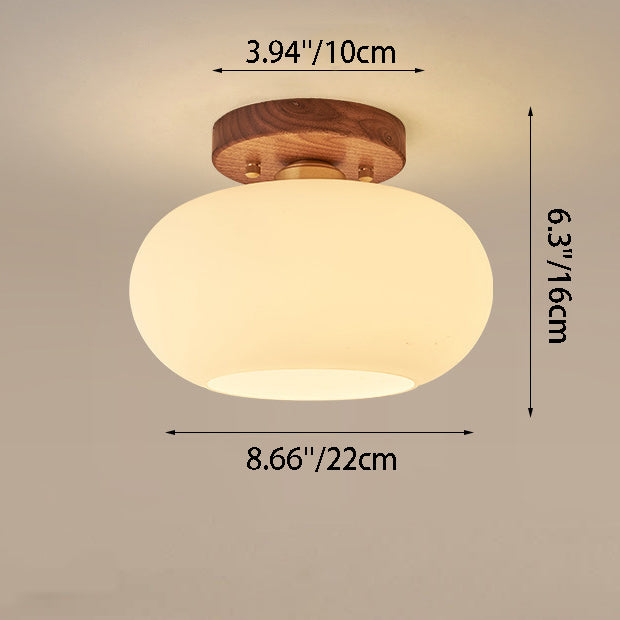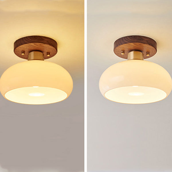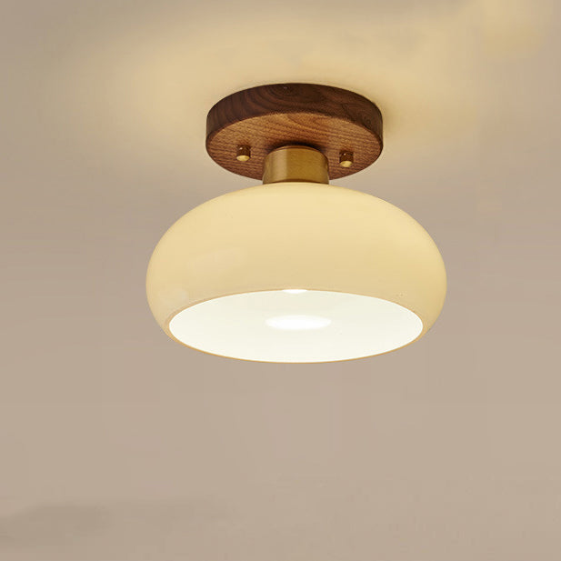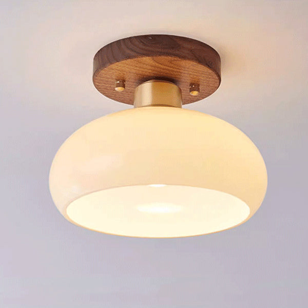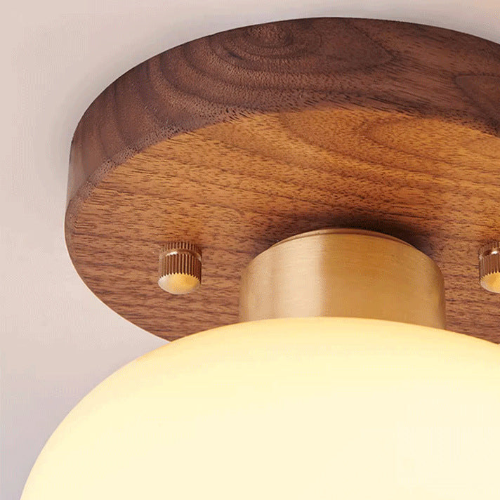 Contemporary Scandinavian Exposed Concealed Installation Drum Round Bowl Ribbed Glass Iron Wood Copper 1-Light Semi-Flush Mount Ceiling Light For Hallway