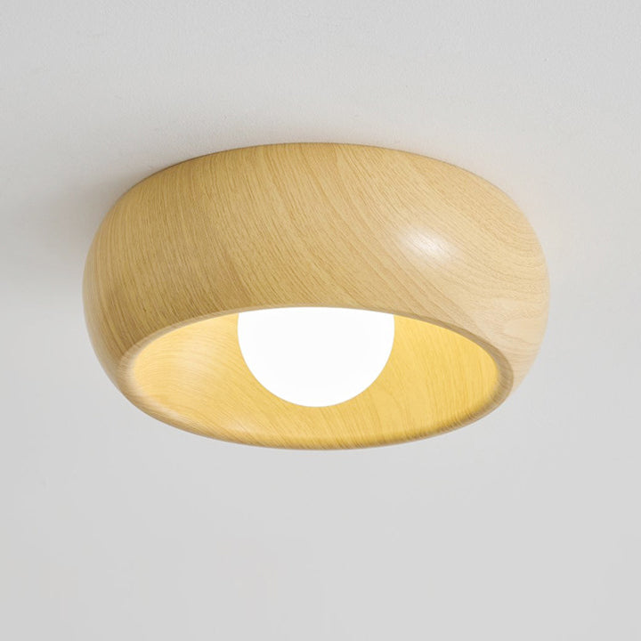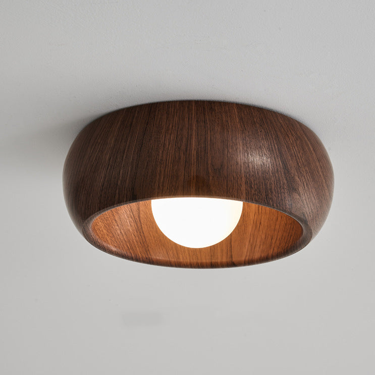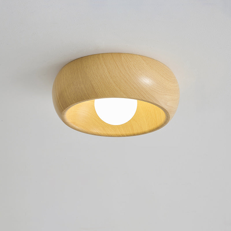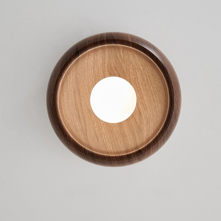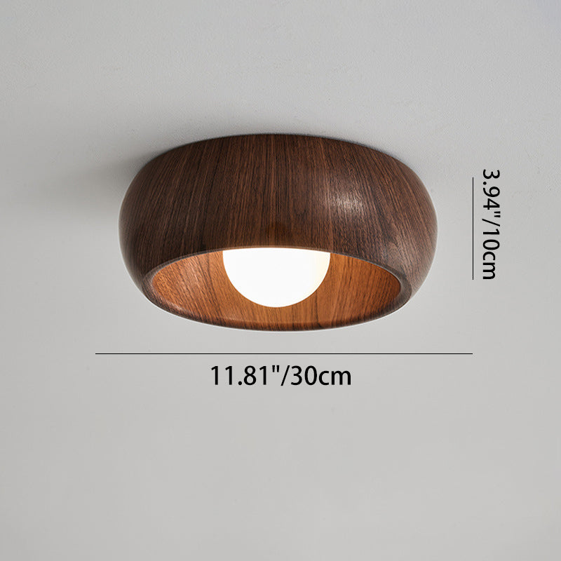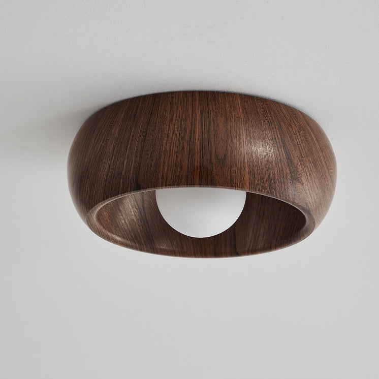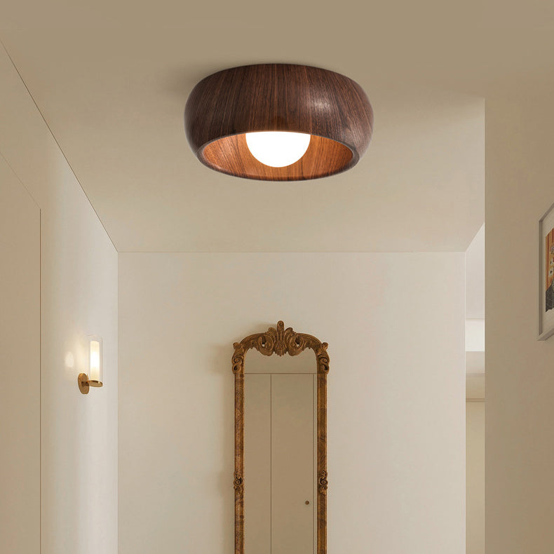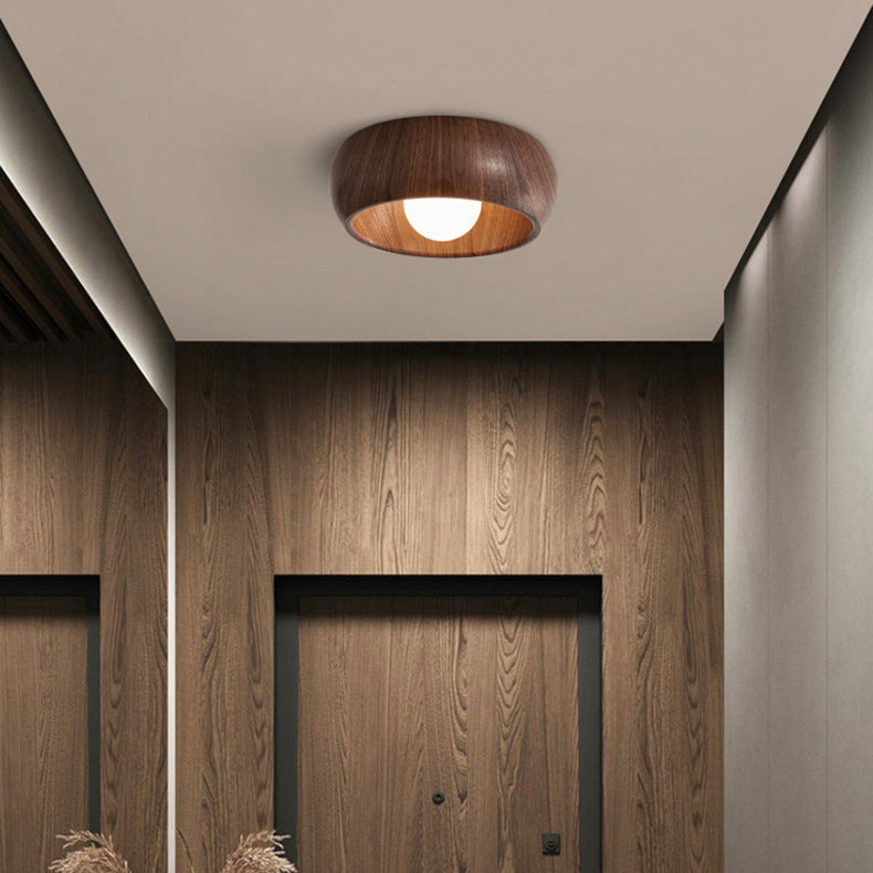 Contemporary Scandinavian Iron Glass Round Tart Wood Grain 1-Light Flush Mount Ceiling Light For Hallway