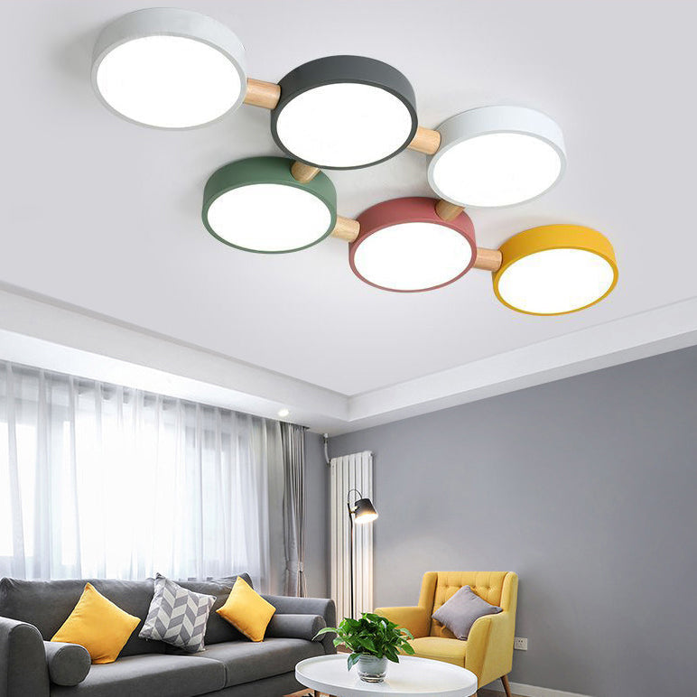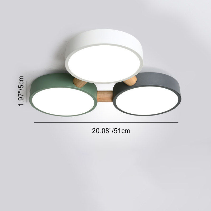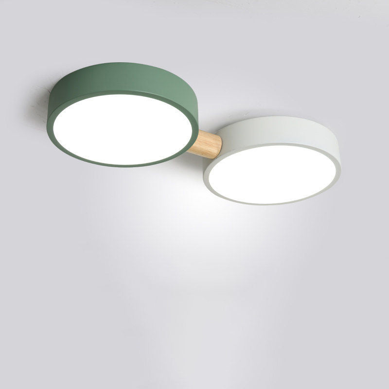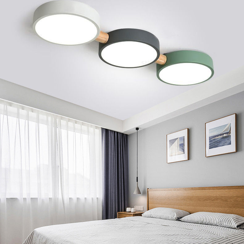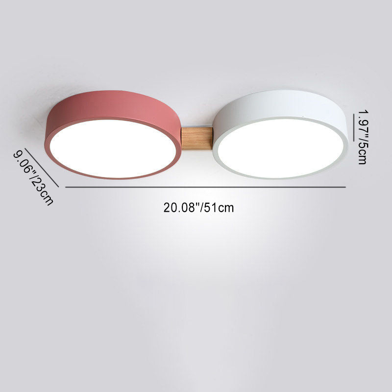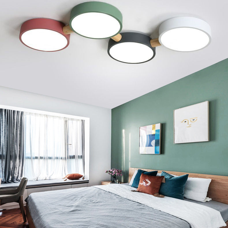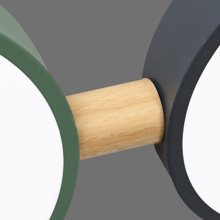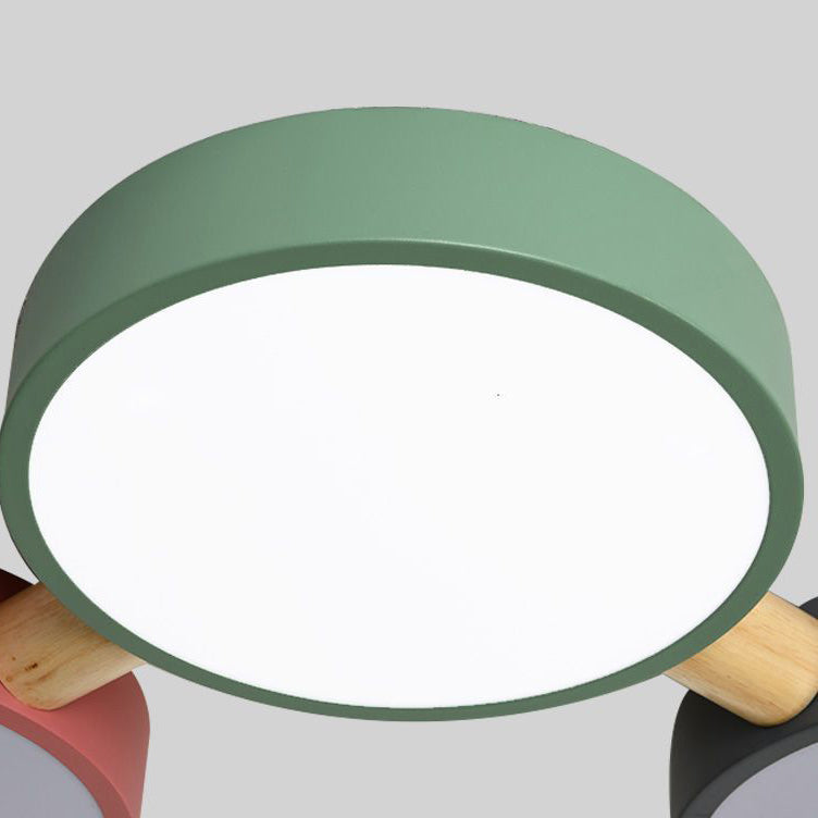 Contemporary Scandinavian Macaron Iron Geometric Round Shade Wood Splicing LED Flush Mount Ceiling Light For Bedroom