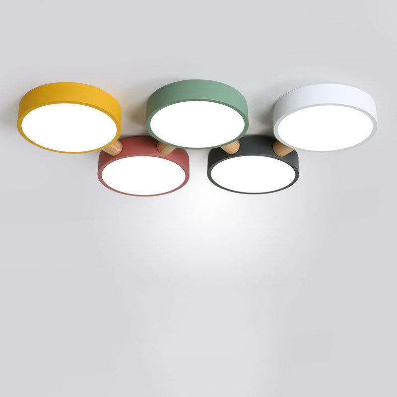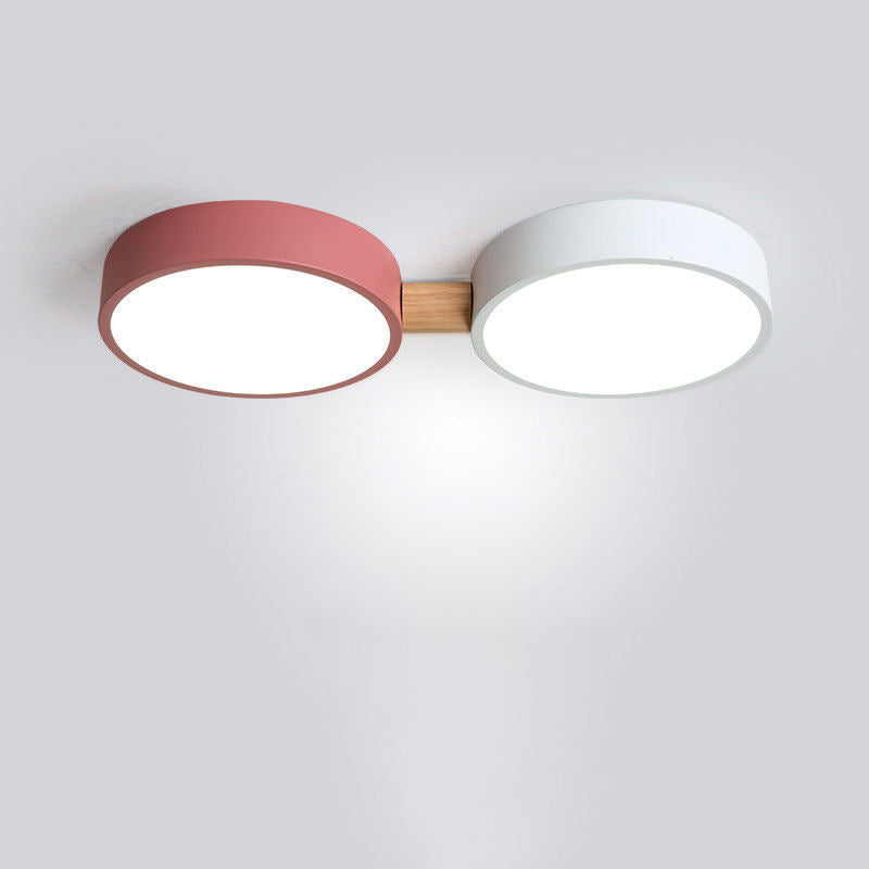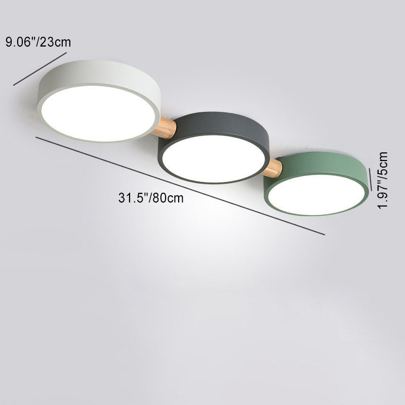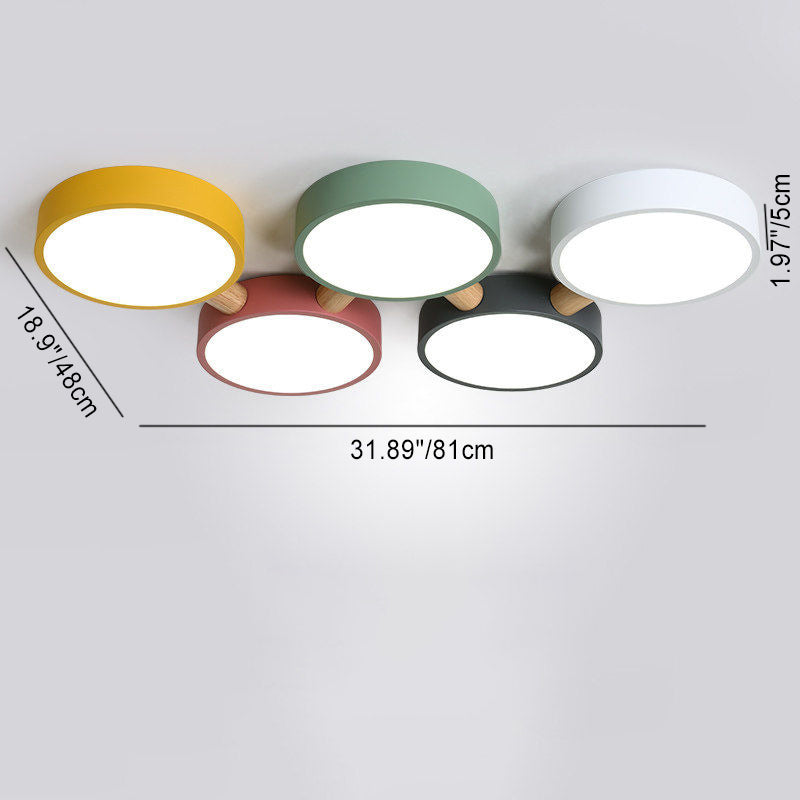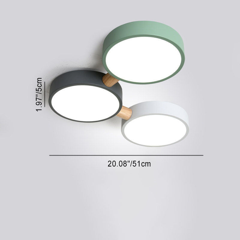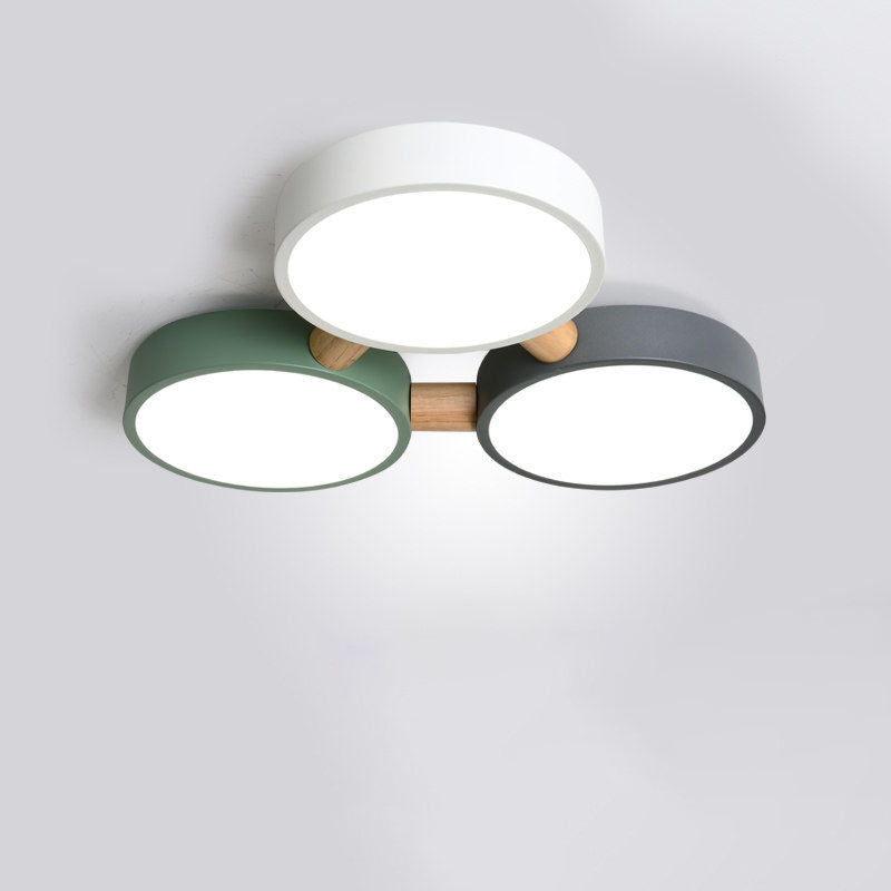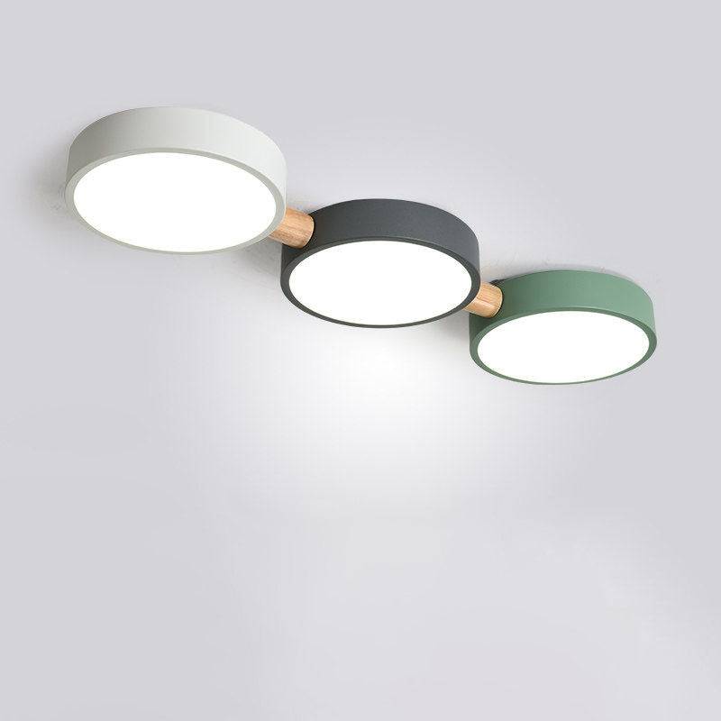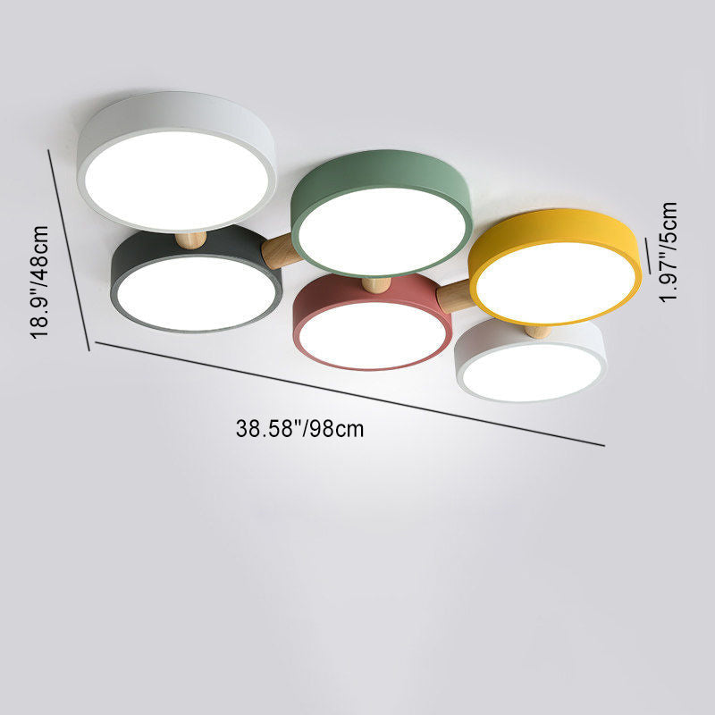 Contemporary Scandinavian Macaron Iron Geometric Round Shade Wood Splicing LED Flush Mount Ceiling Light For Bedroom