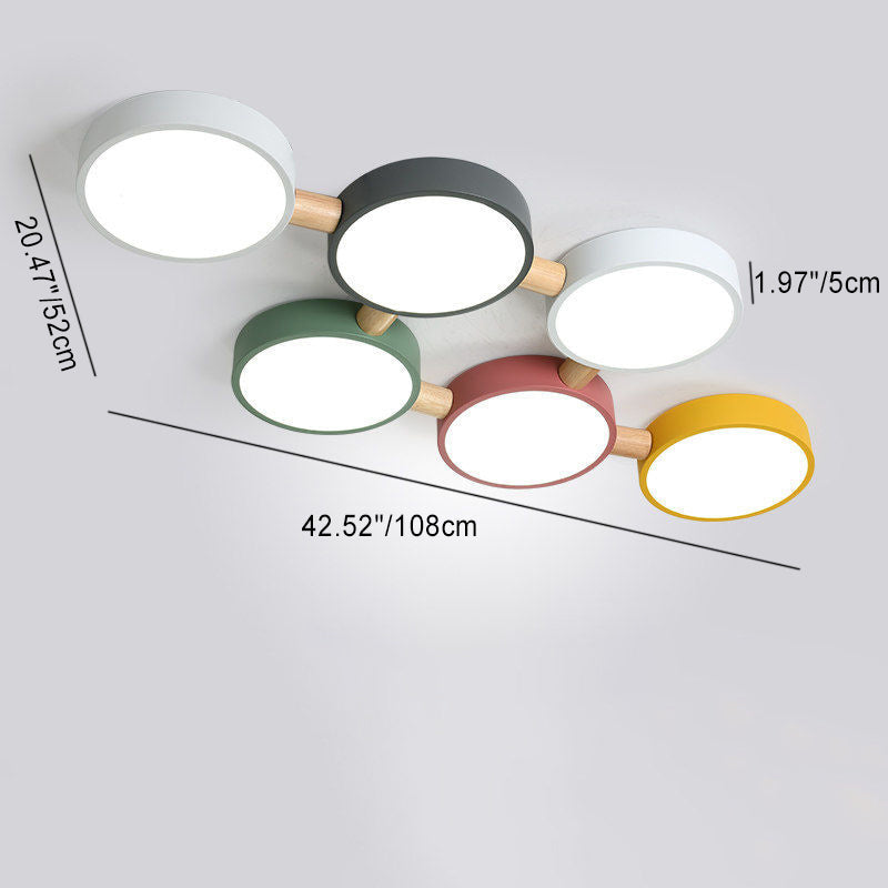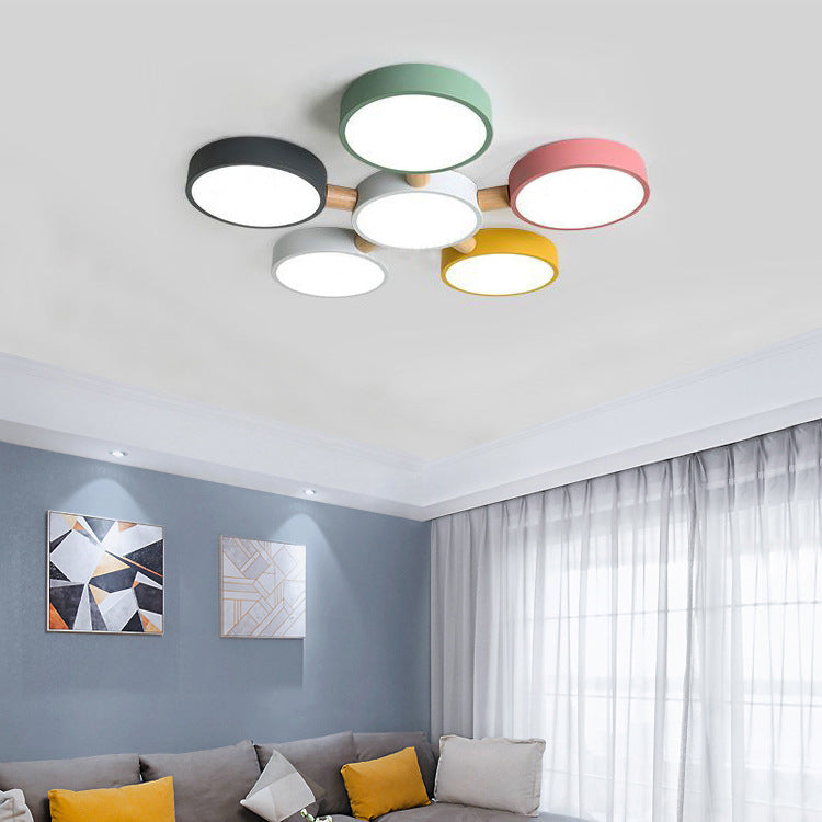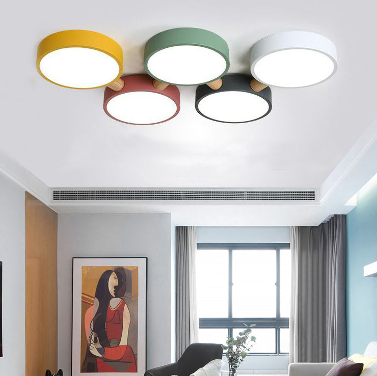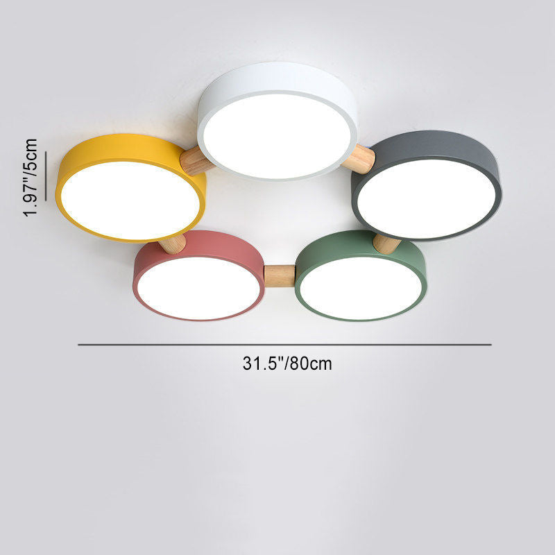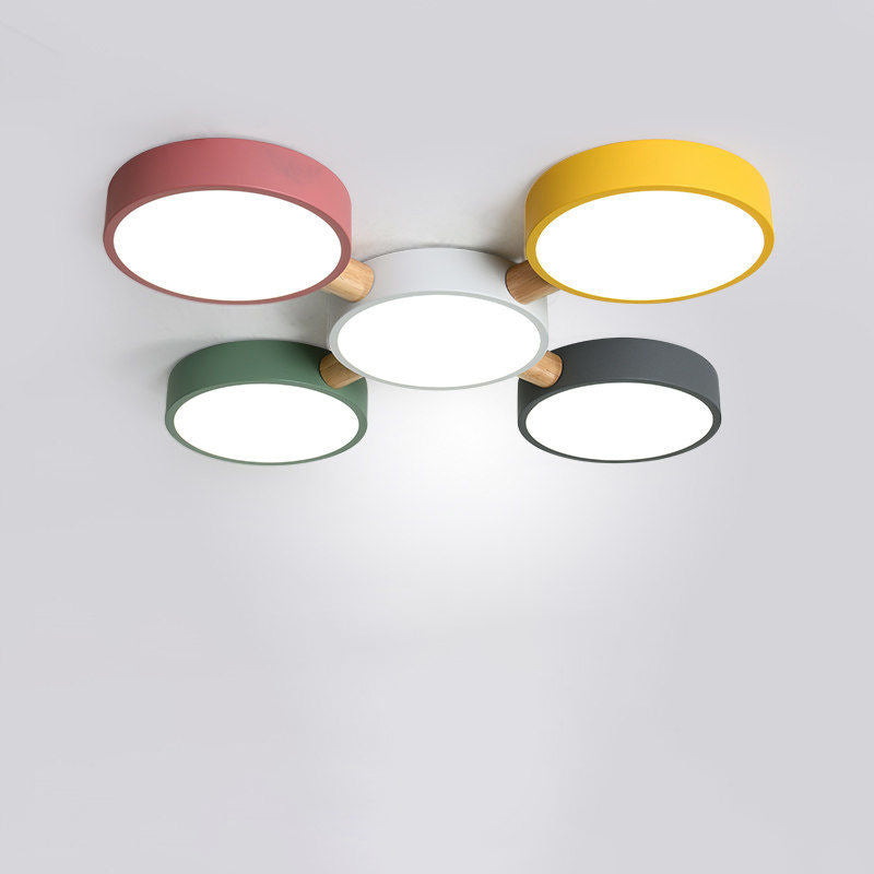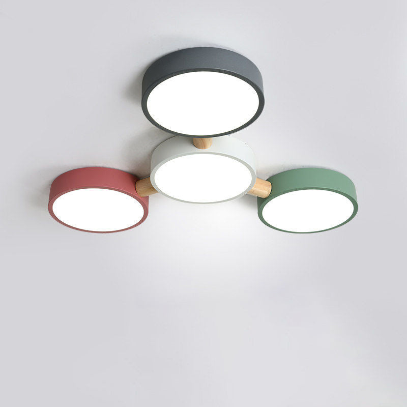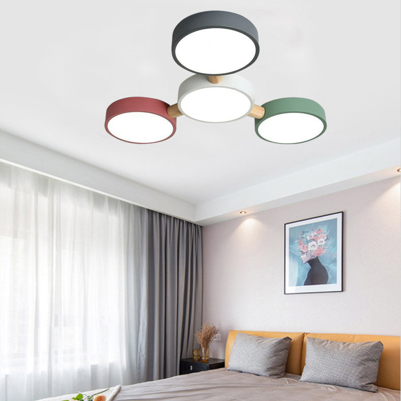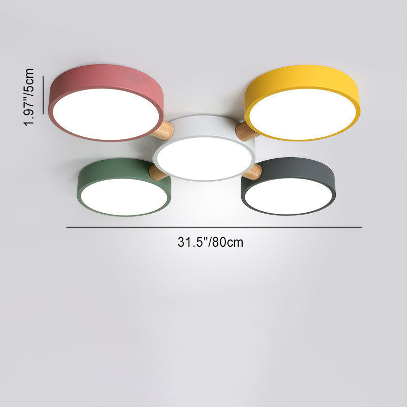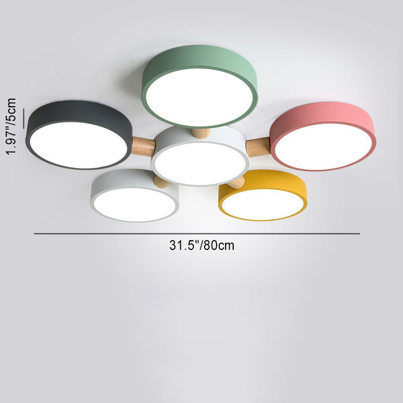 Contemporary Scandinavian Macaron Iron Geometric Round Shade Wood Splicing LED Flush Mount Ceiling Light For Bedroom