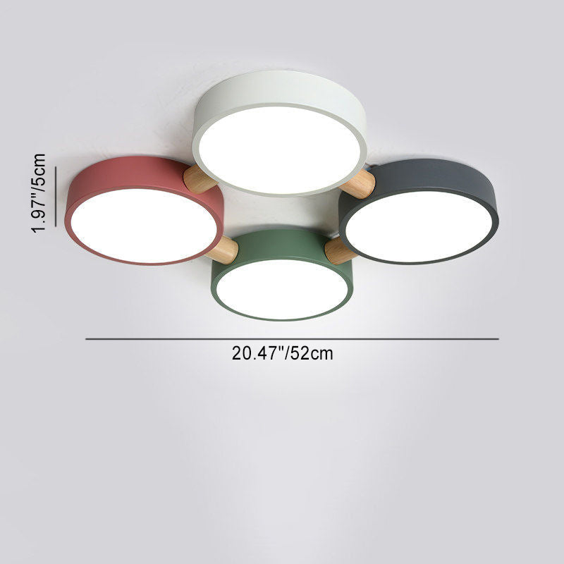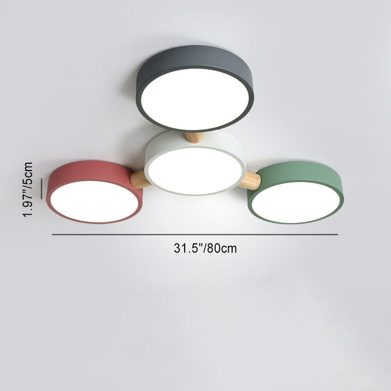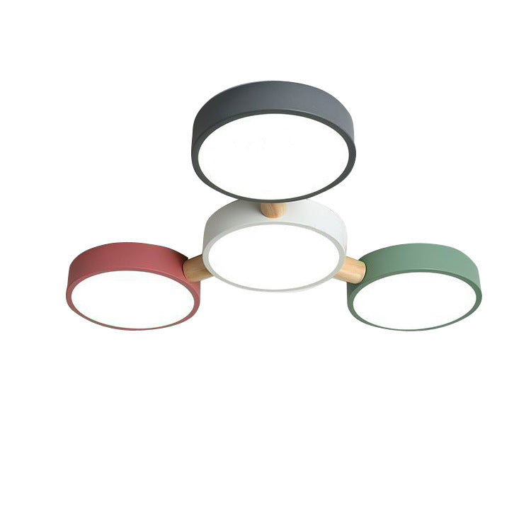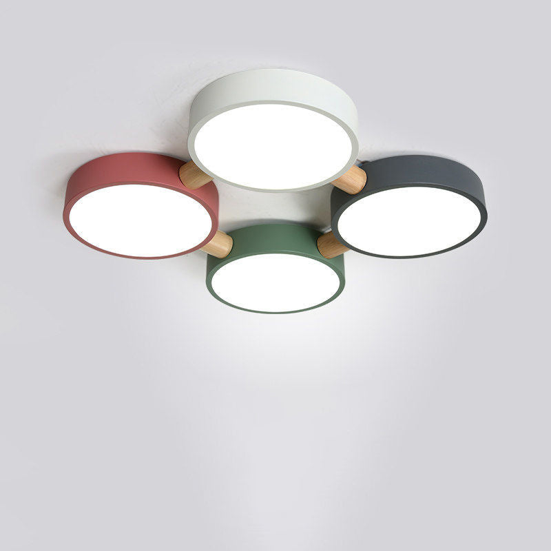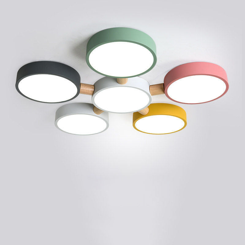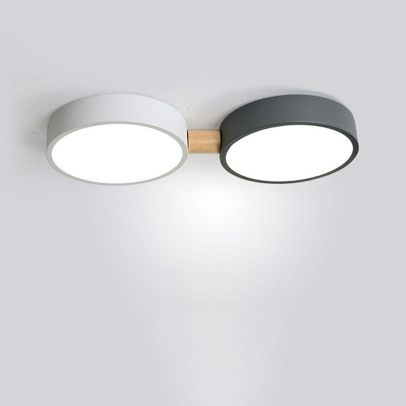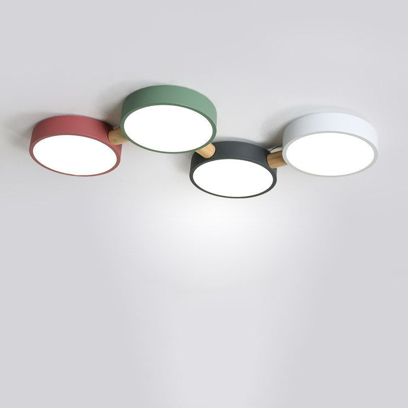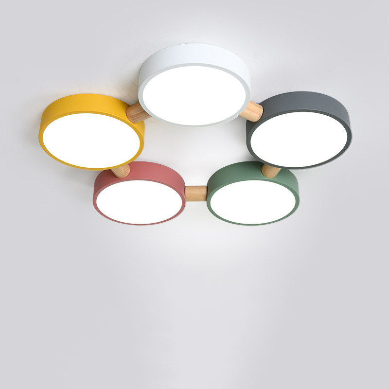 Contemporary Scandinavian Macaron Iron Geometric Round Shade Wood Splicing LED Flush Mount Ceiling Light For Bedroom