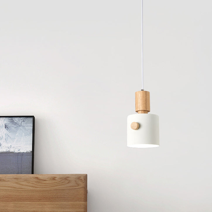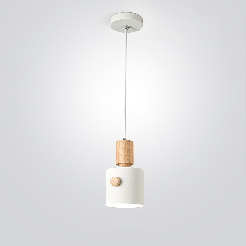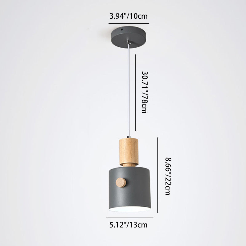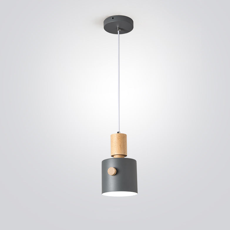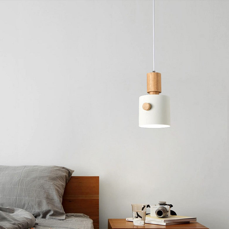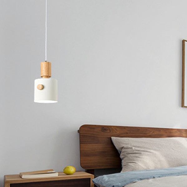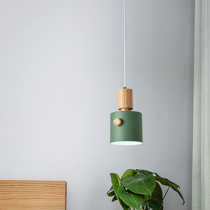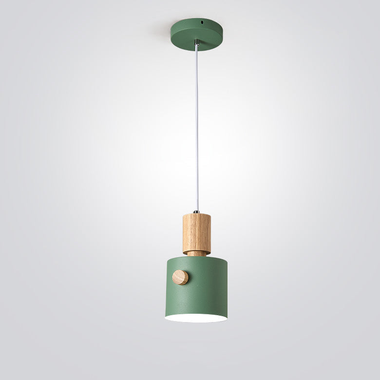 Contemporary Scandinavian Macaron Round Cylinder Iron Wood 1-Light Pendant Light For Bedroom