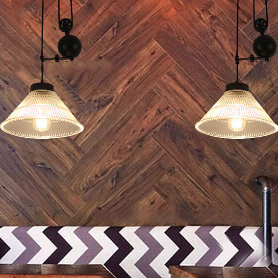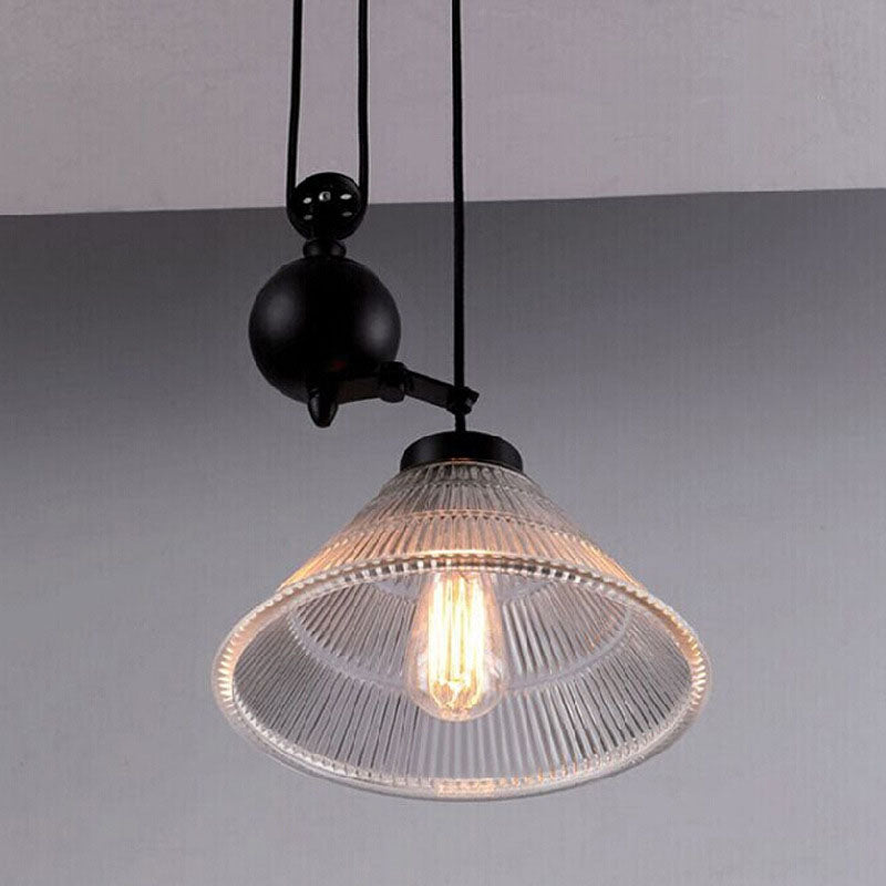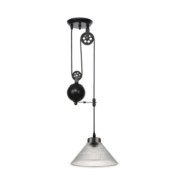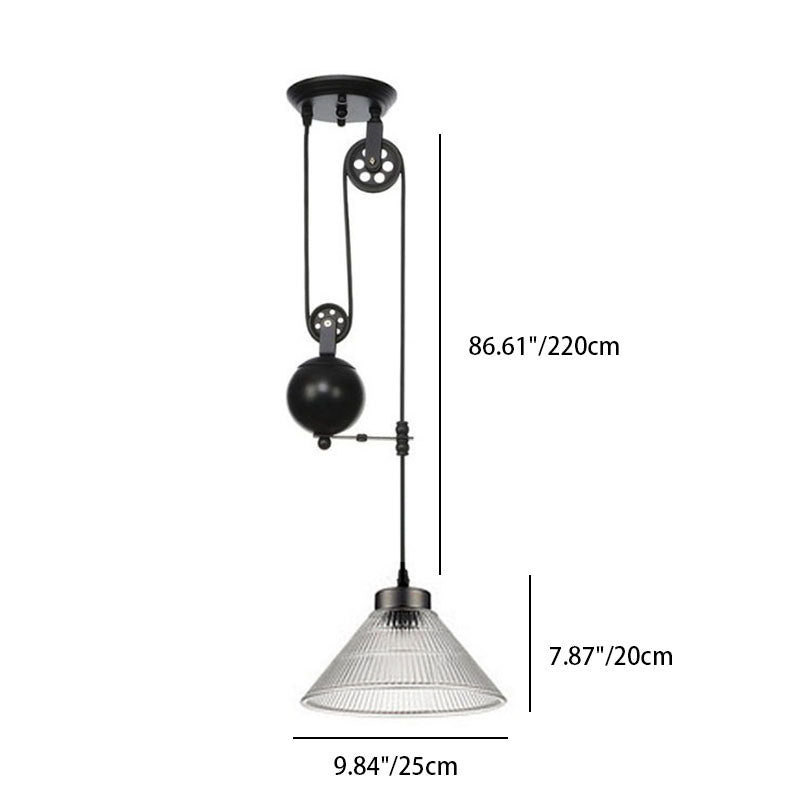 Contemporary Transitional Iron Pulley Liftable Pleated Glass Shade 1-Light Pendant Light For Dining Room