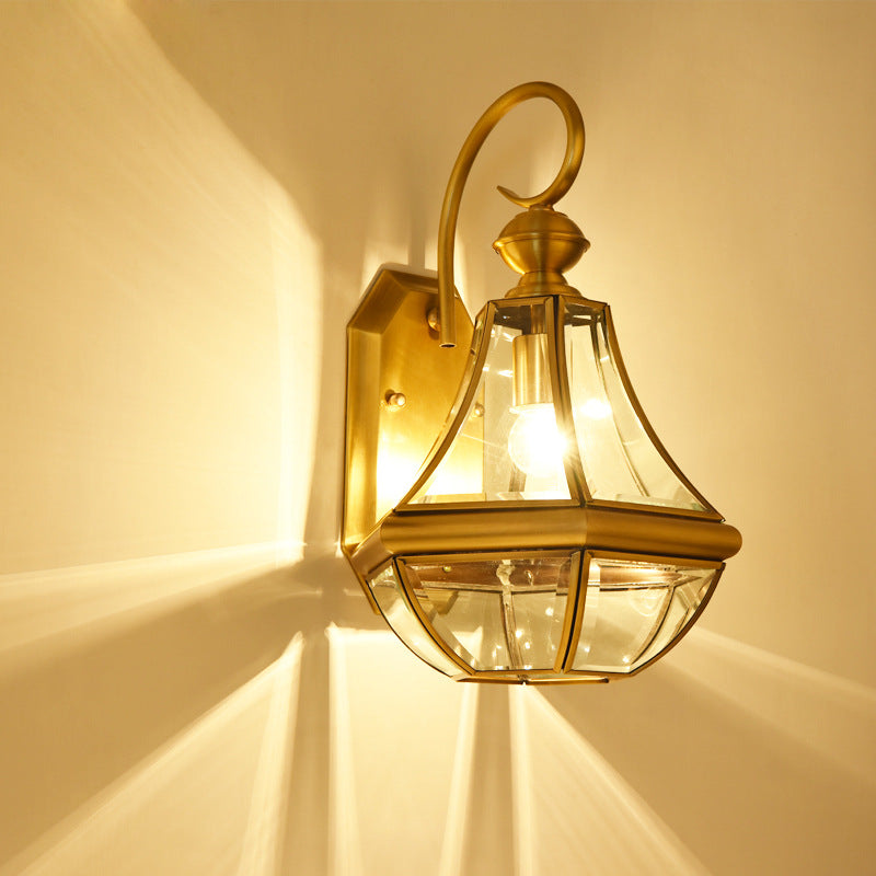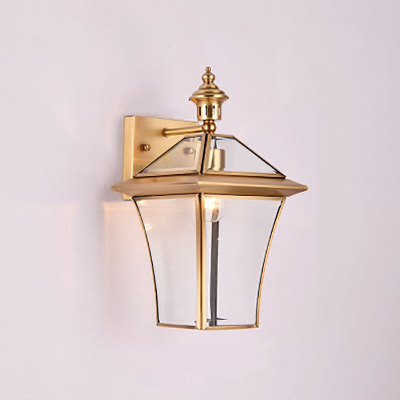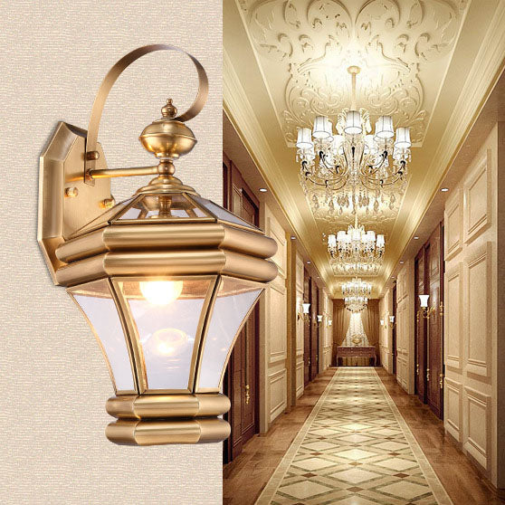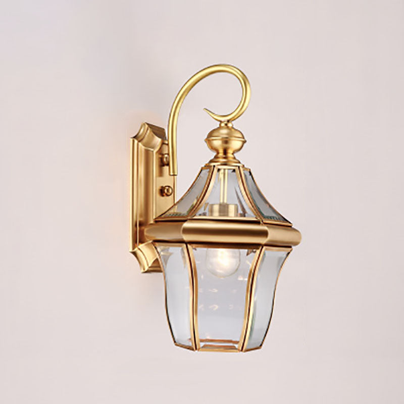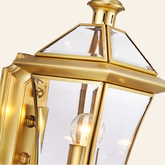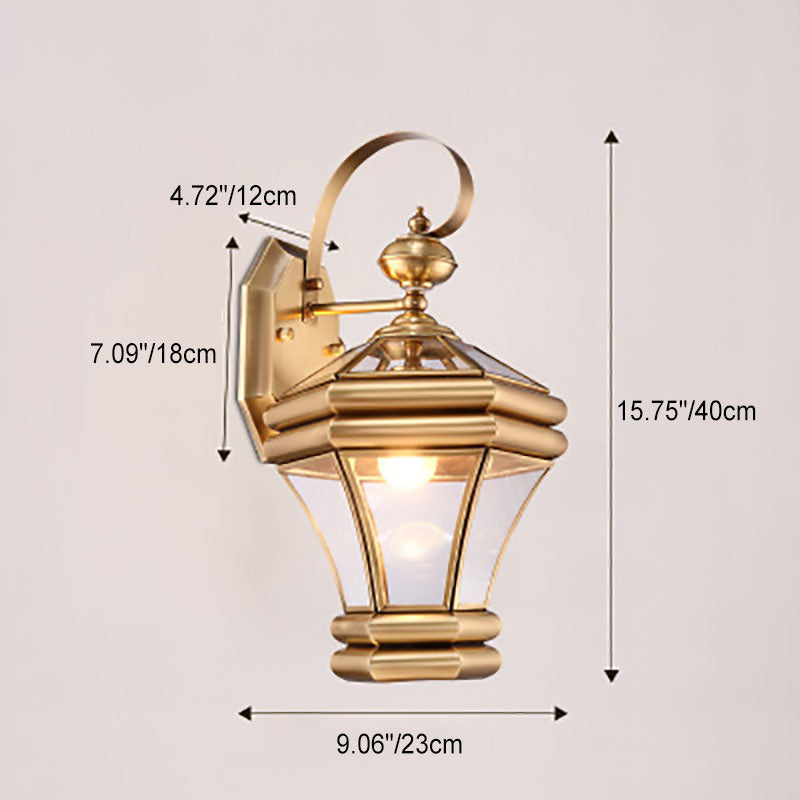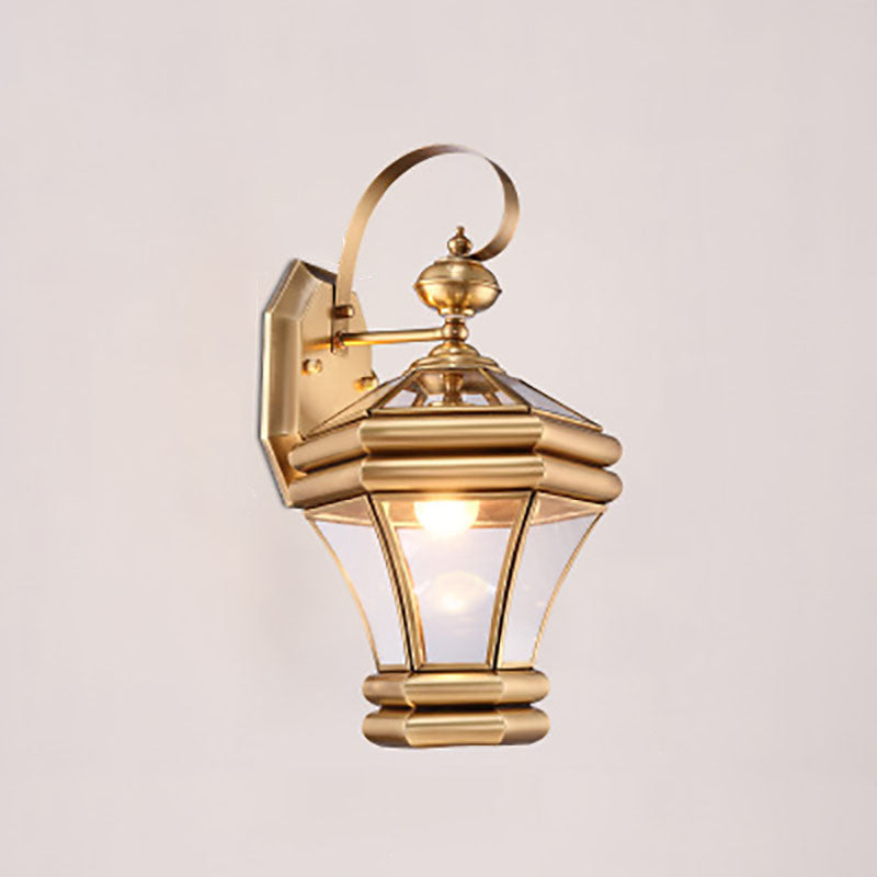 European Modern Luxury Hexagonal Lantern Brass Glass Waterproof 1-Light Outdoor Wall Sconce Lamp