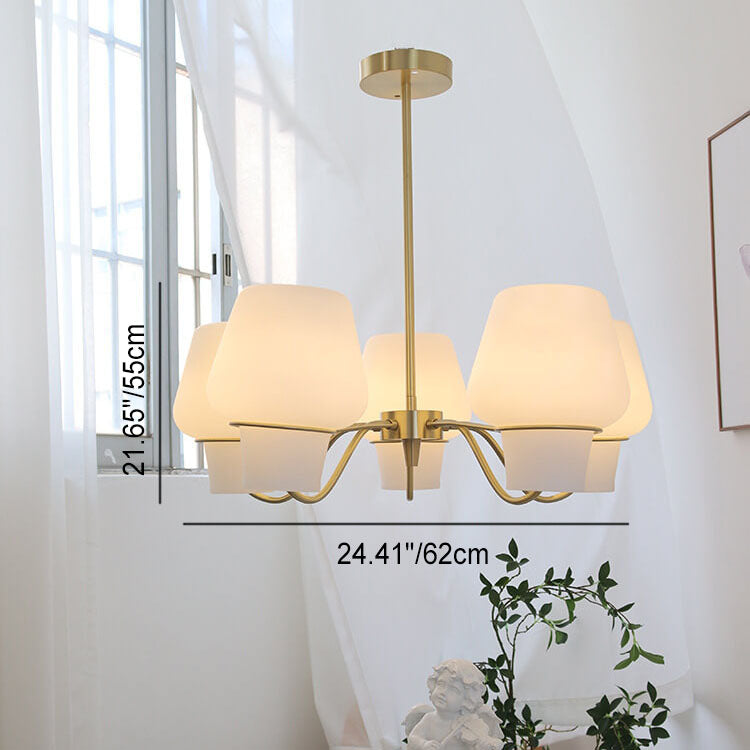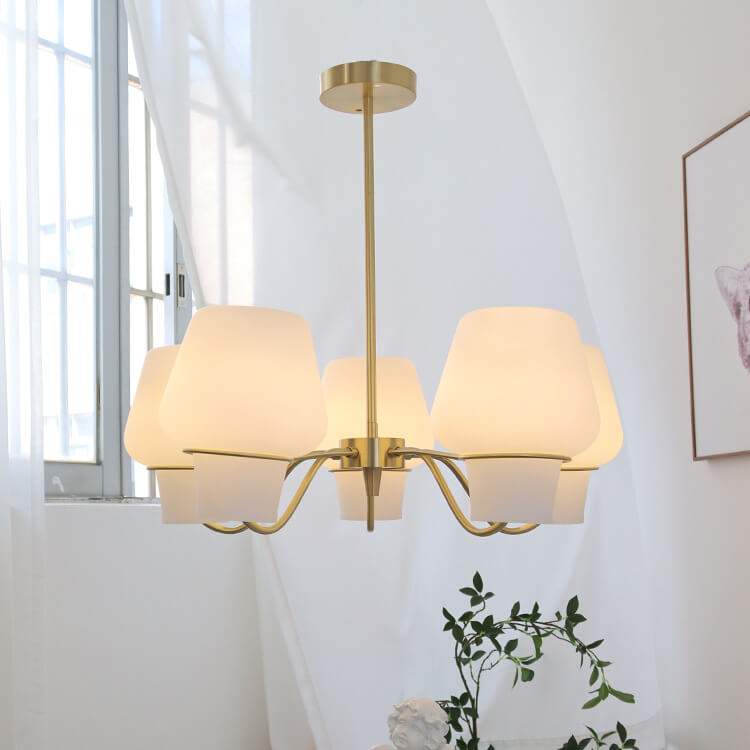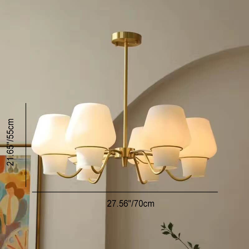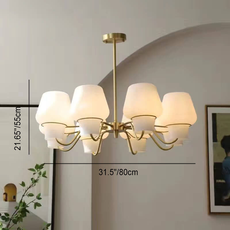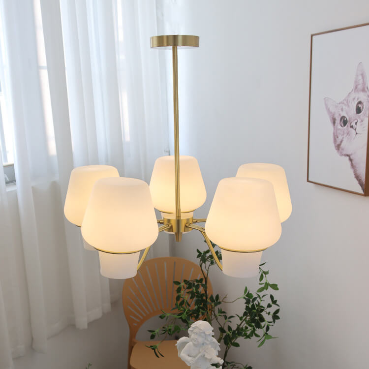 French Vintage Frosted Glass Cone Shade Brass Branch 5/6/8 Light Chandelier