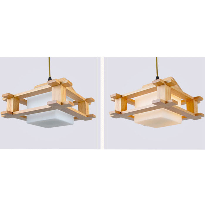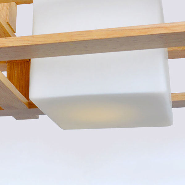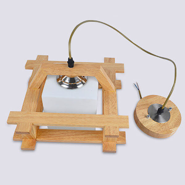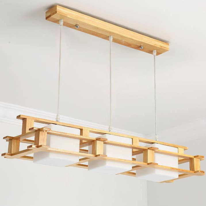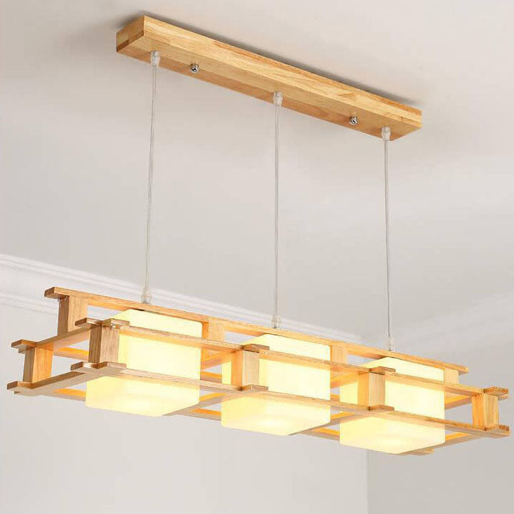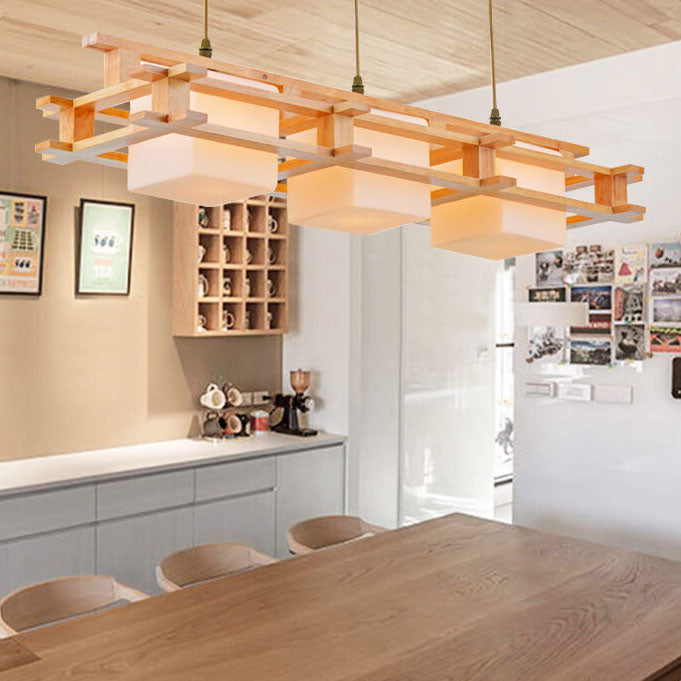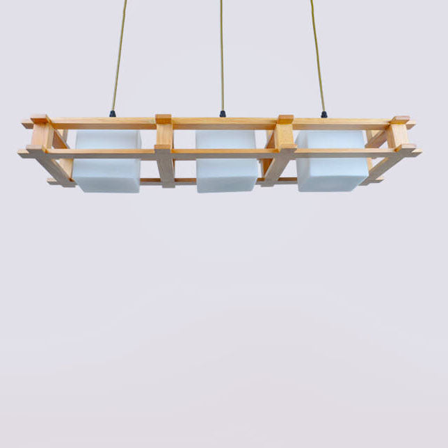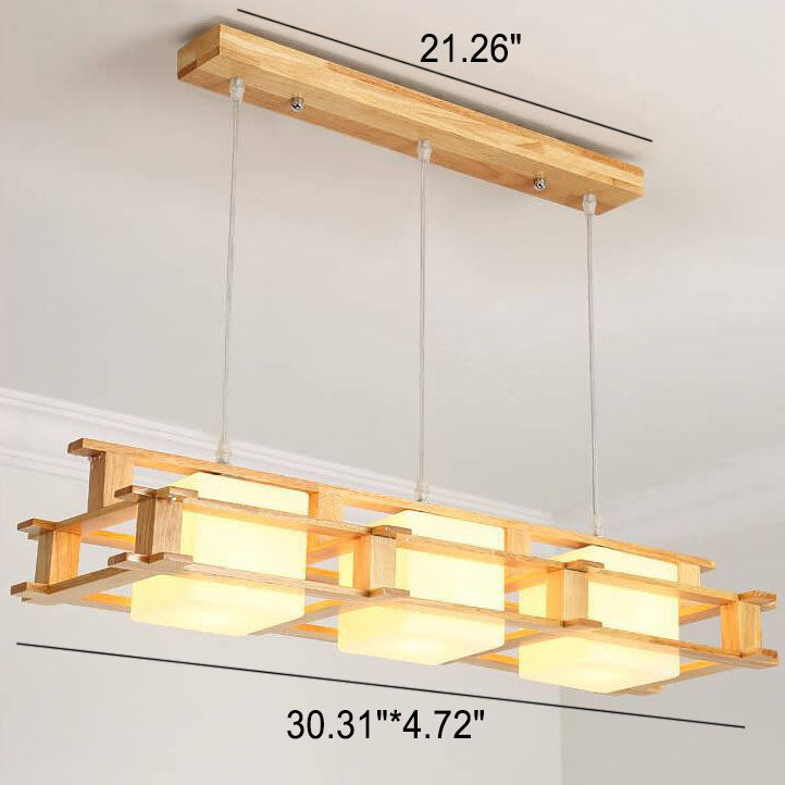 Japanese Simple Log Square Glass Wooden Frame 1/3 Light Chandelier