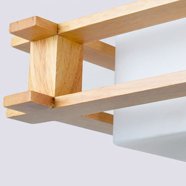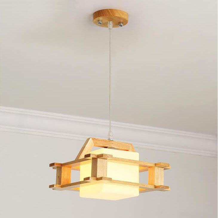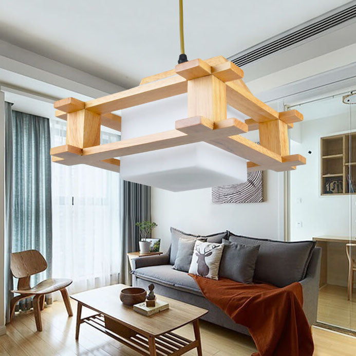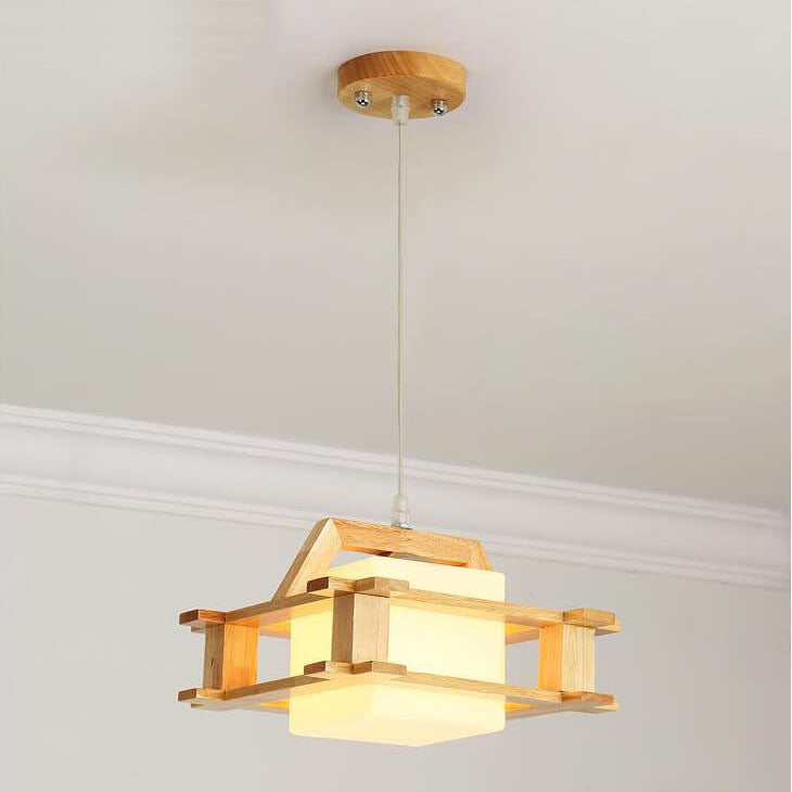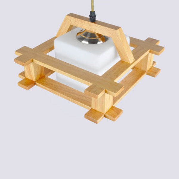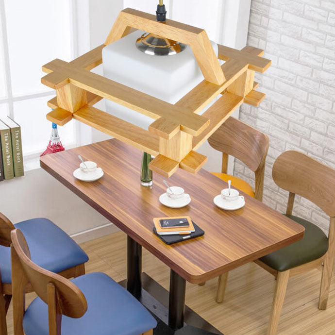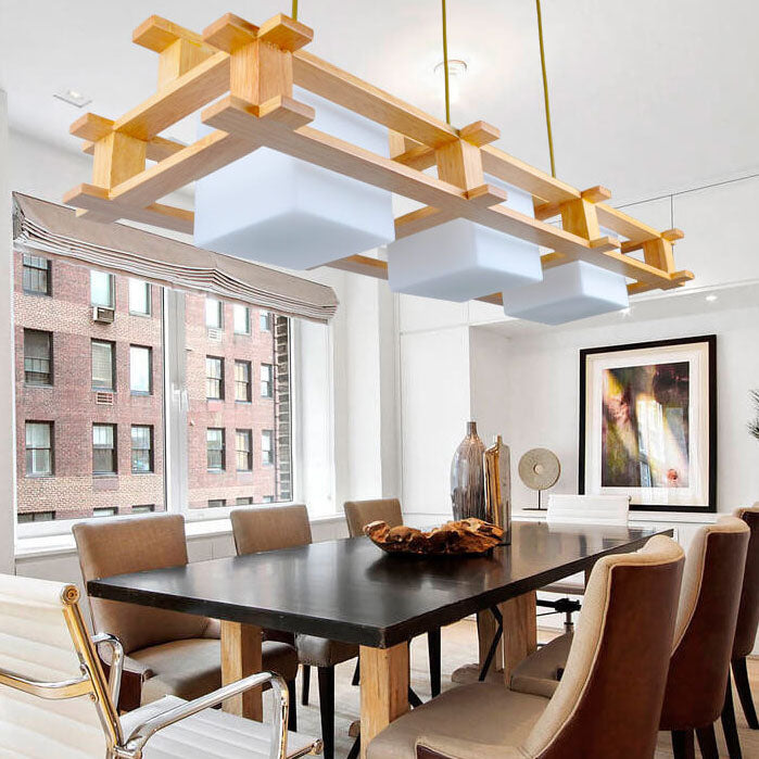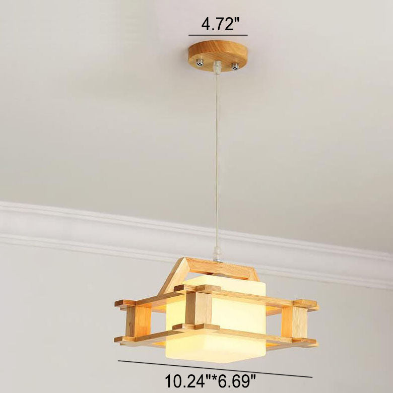 Japanese Simple Log Square Glass Wooden Frame 1/3 Light Chandelier
