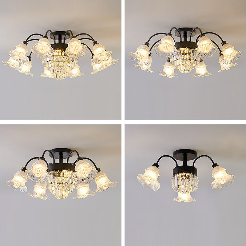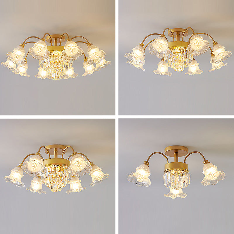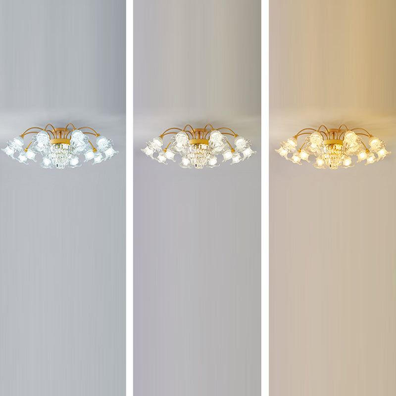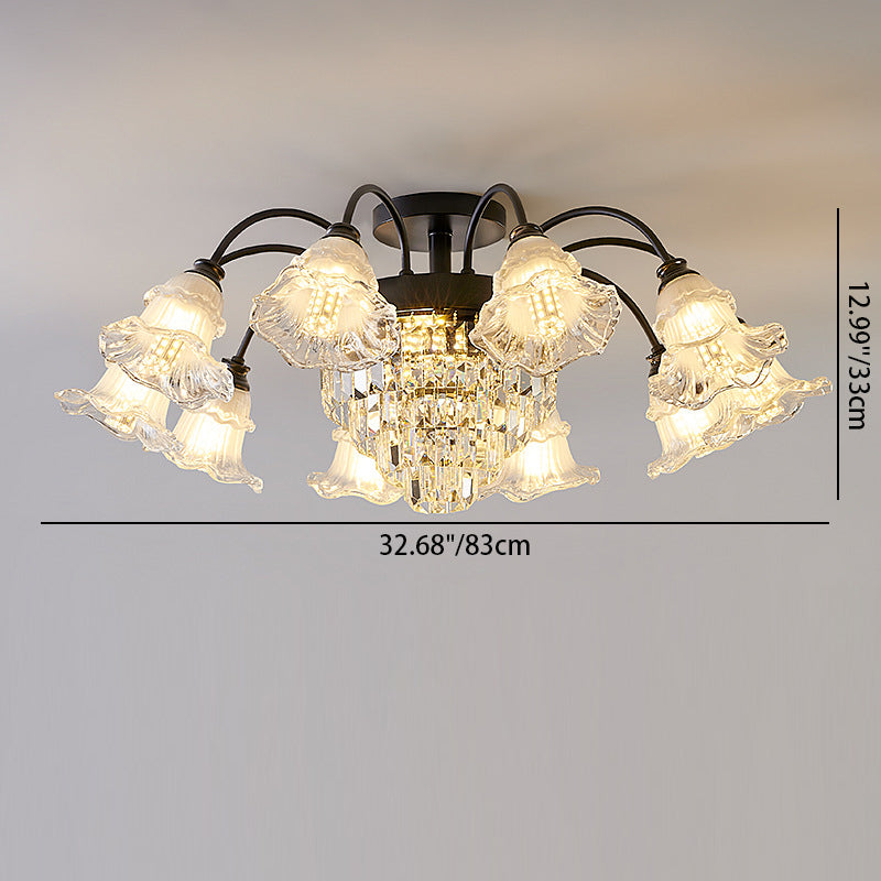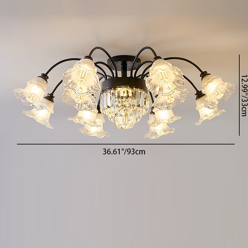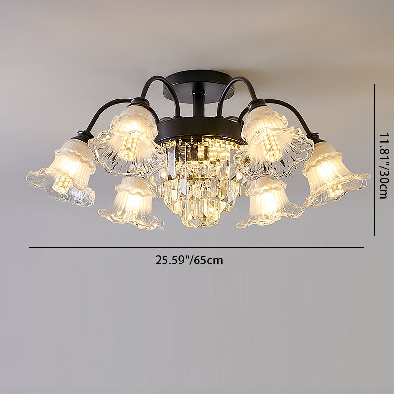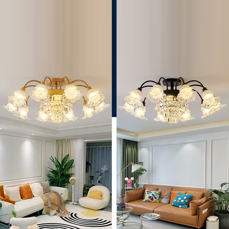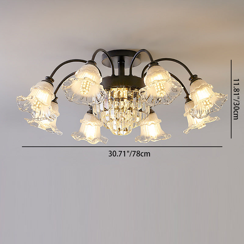 Modern Art Deco Flower Round Branch Crystal Glass Iron 3/6/8/10/12/15 Light Semi-Flush Mount Ceiling Light For Living Room