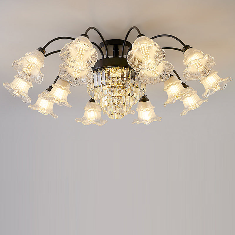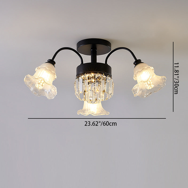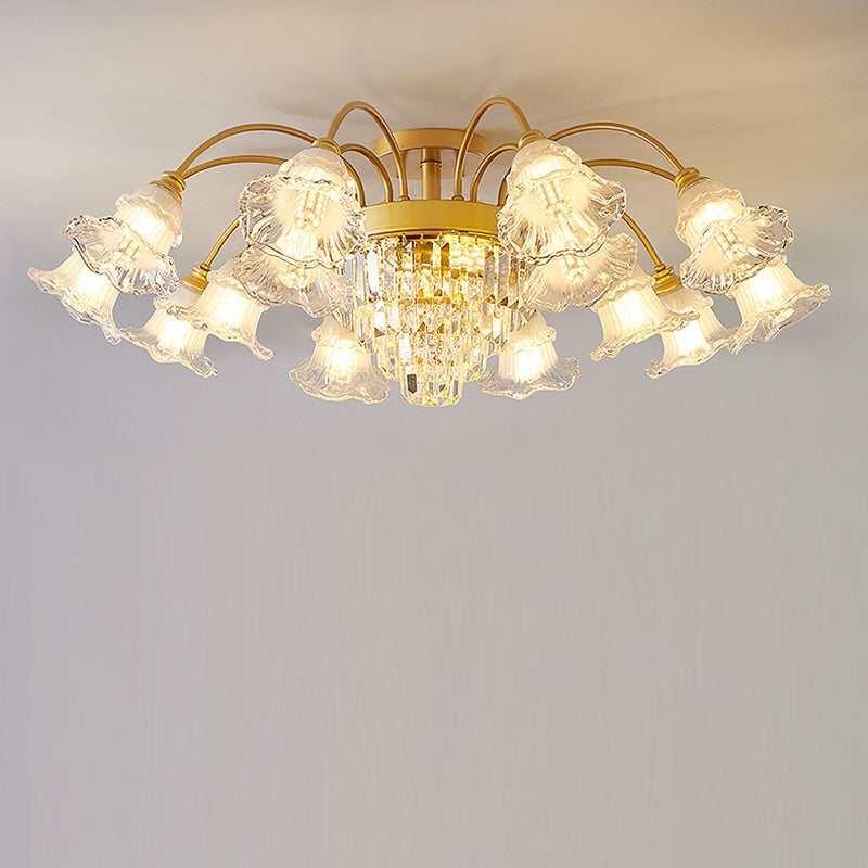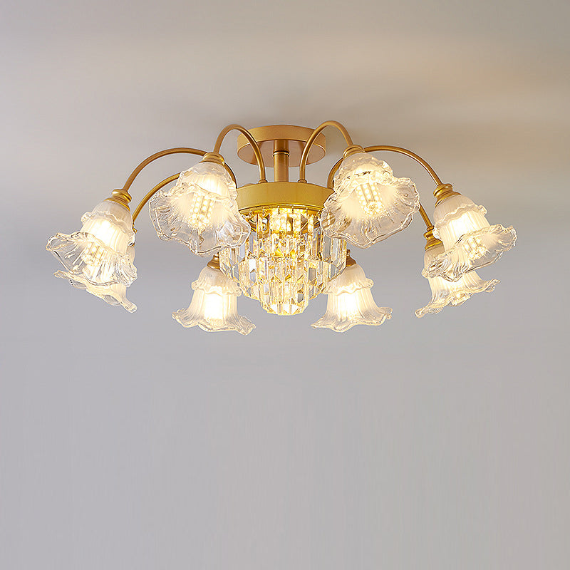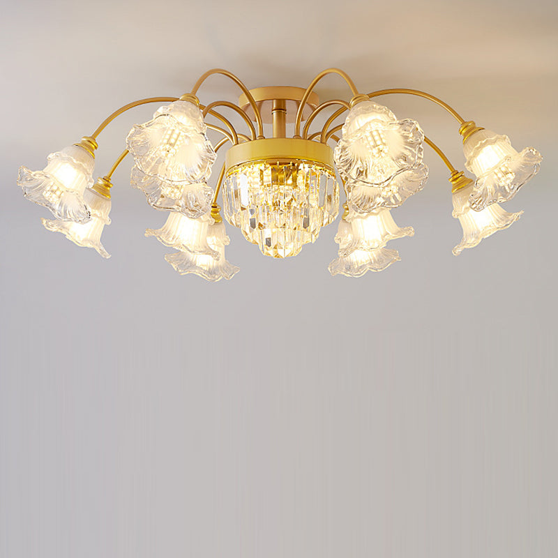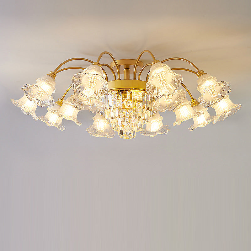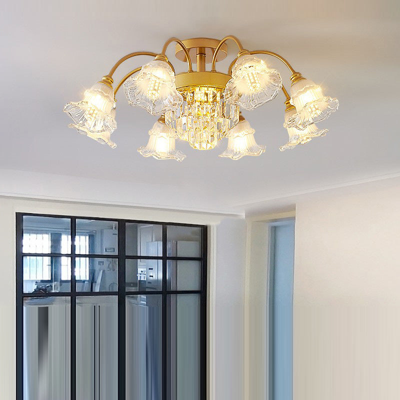 Modern Art Deco Flower Round Branch Crystal Glass Iron 3/6/8/10/12/15 Light Semi-Flush Mount Ceiling Light For Living Room