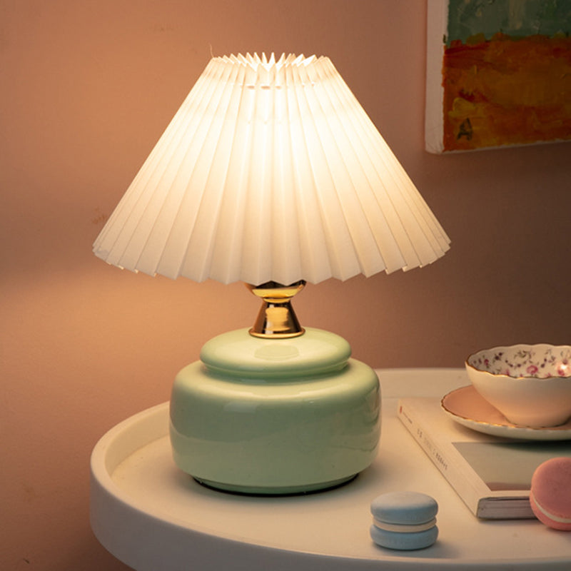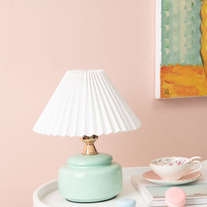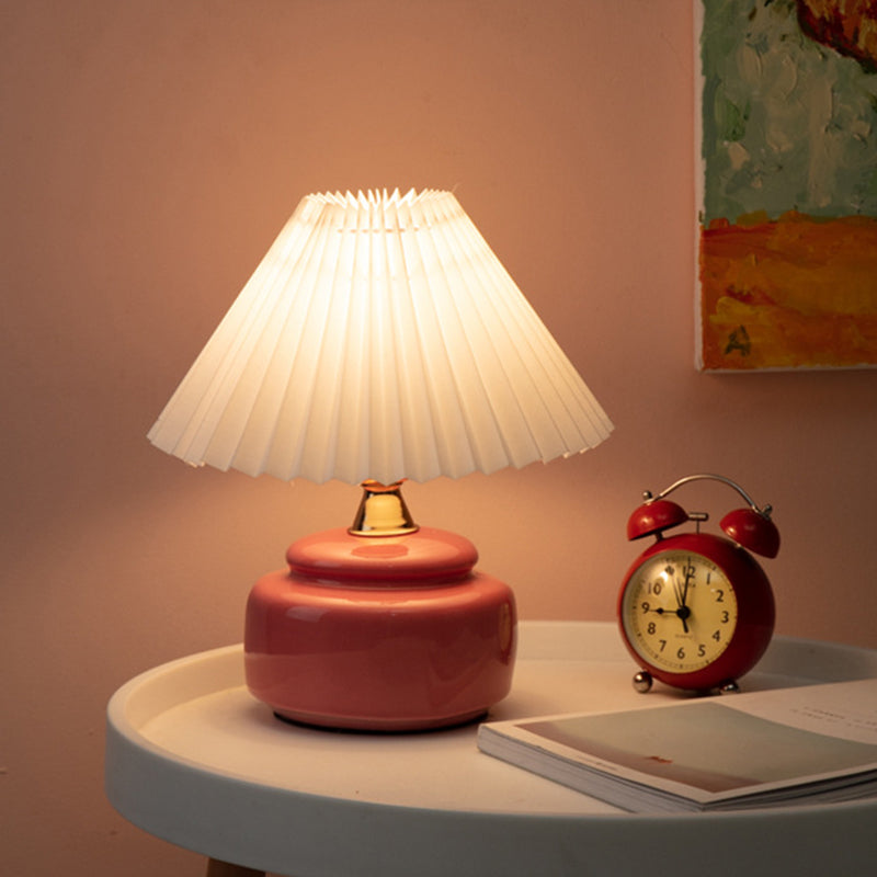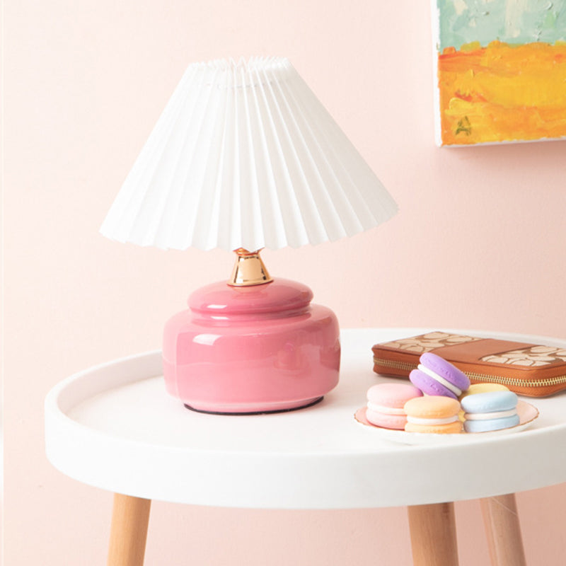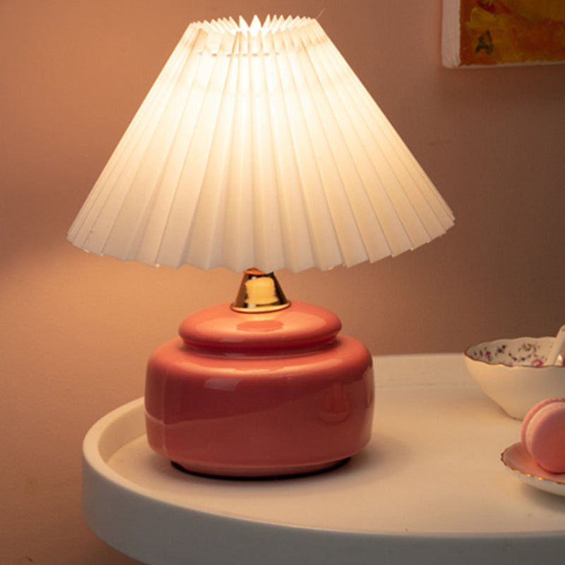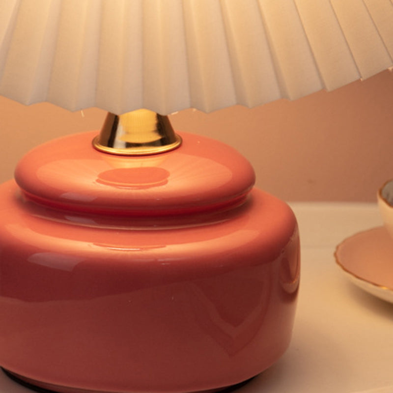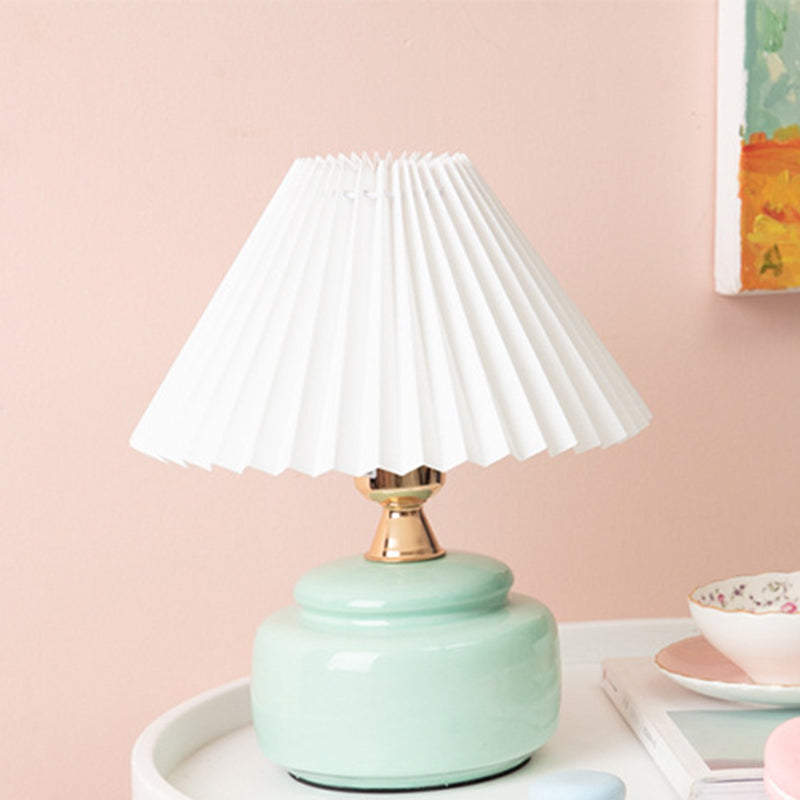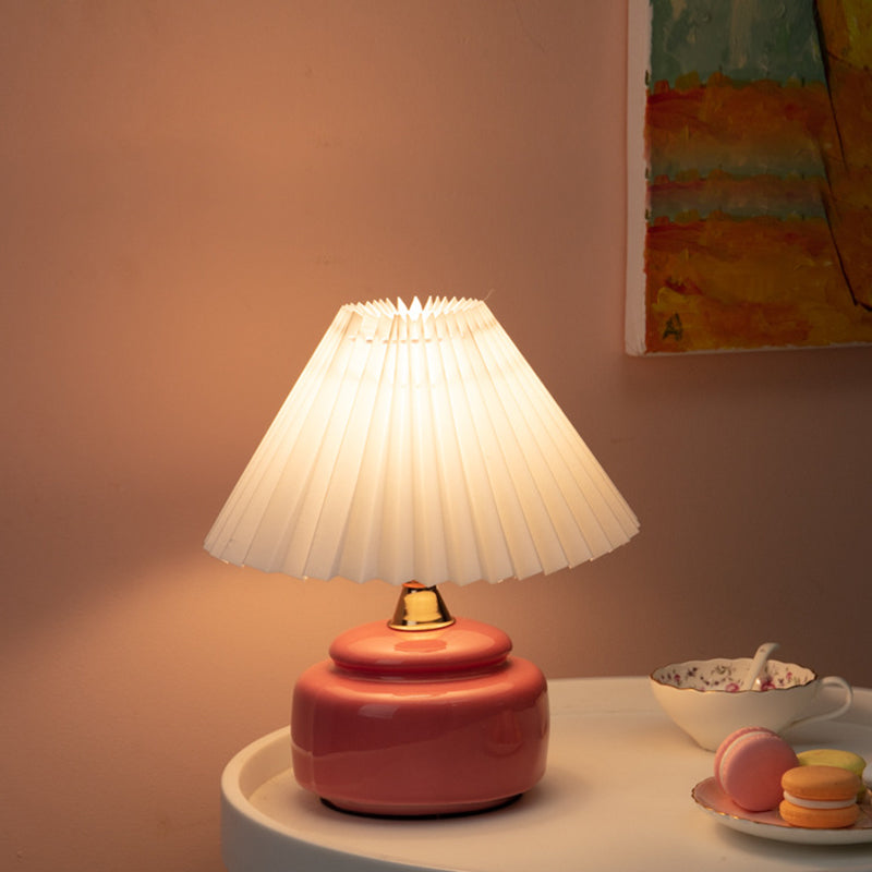 Modern Art Deco Round Ceramic Base Pleated Fabric Shade 1-Light Table Lamp For Bedroom