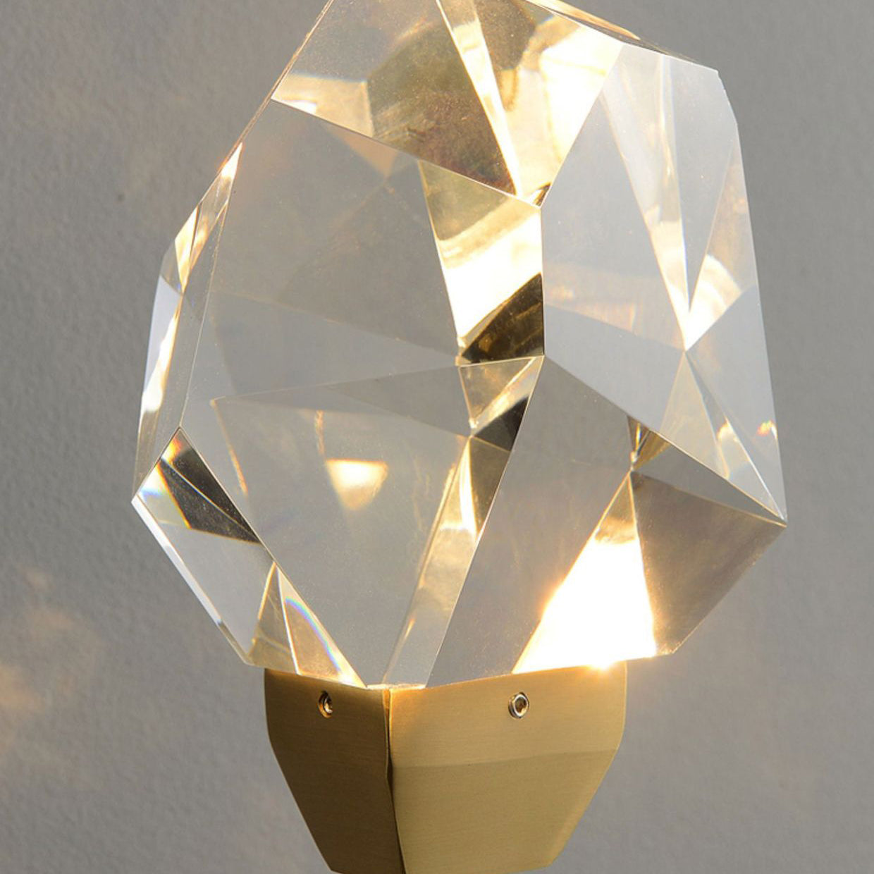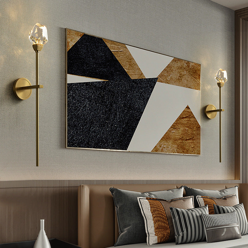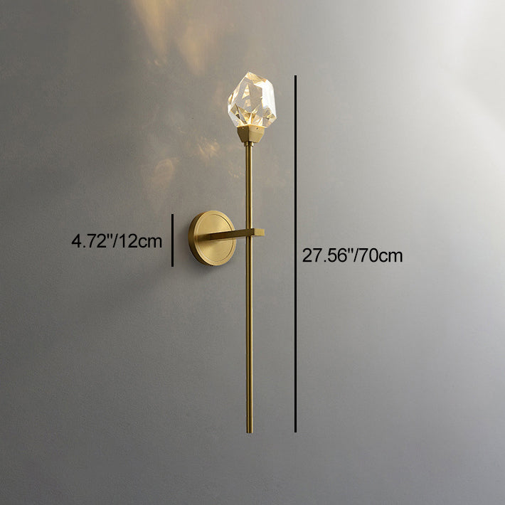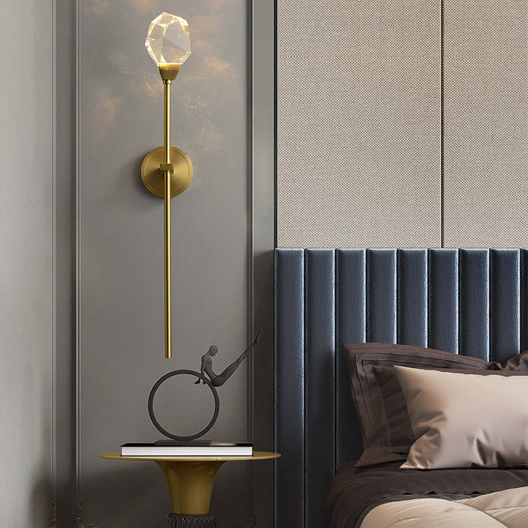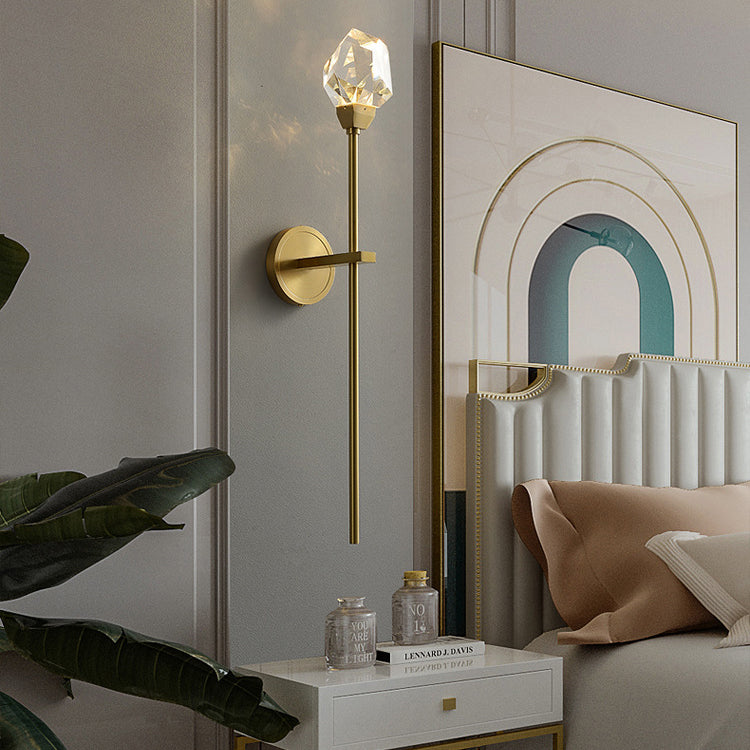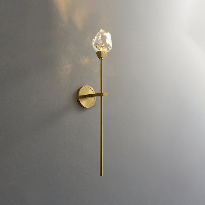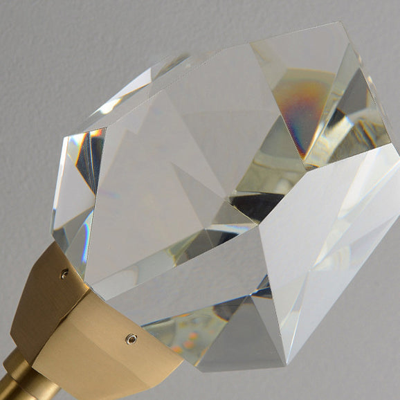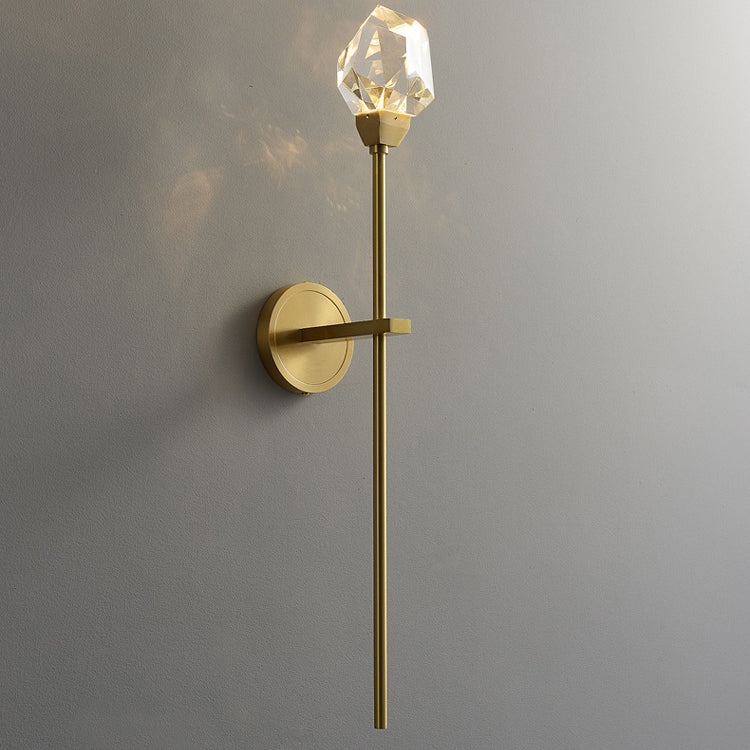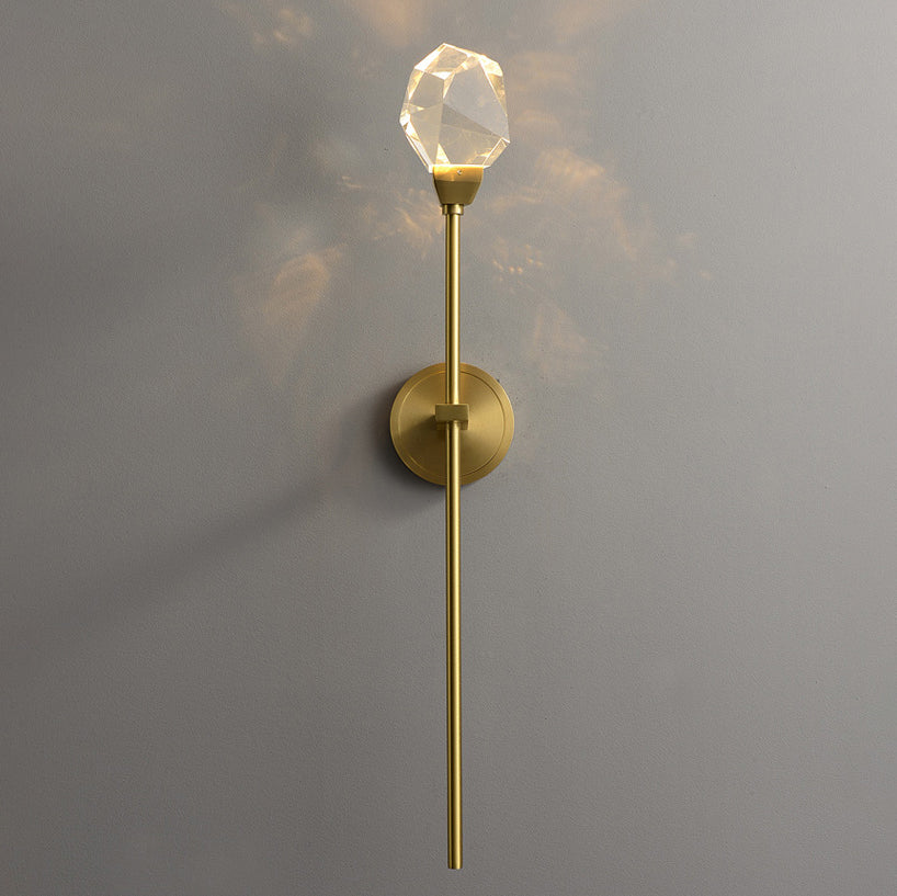 Illuminate your living room with this modern luxury LED wall sconce, featuring a golden brass rod design and artfully cut crystal for a radiant, high-end look. Its sculptural silhouette and multi-angle crystal elements create a stunning decorative accent with elegant ambient lighting.