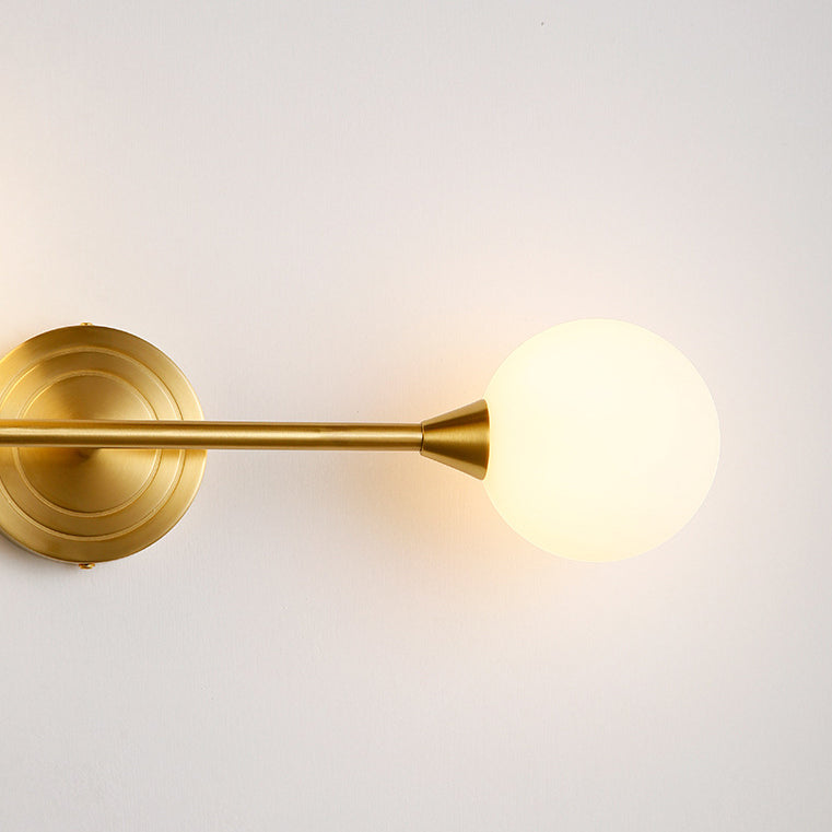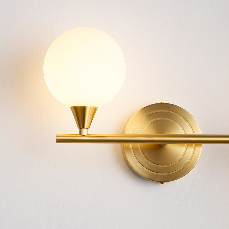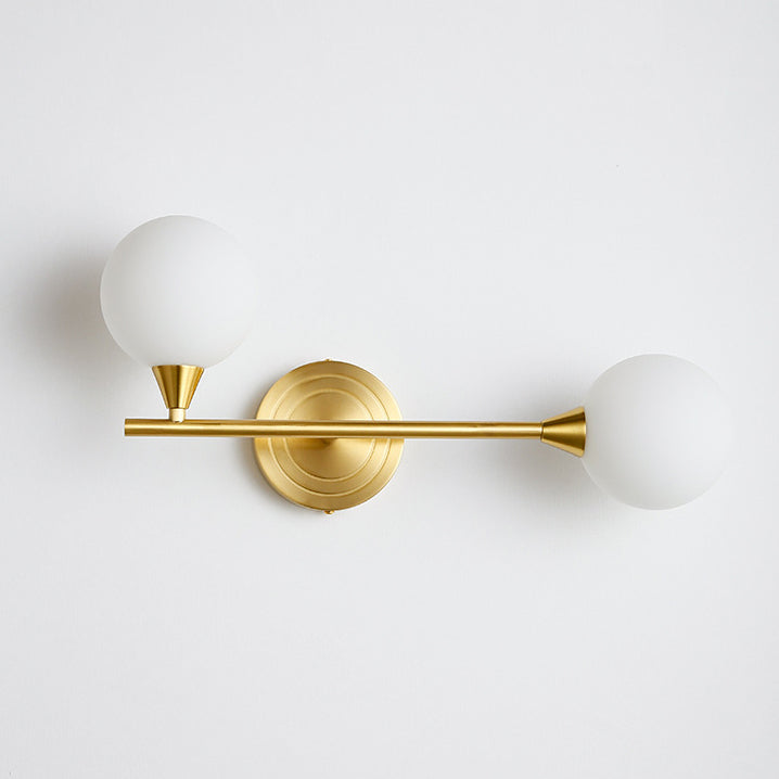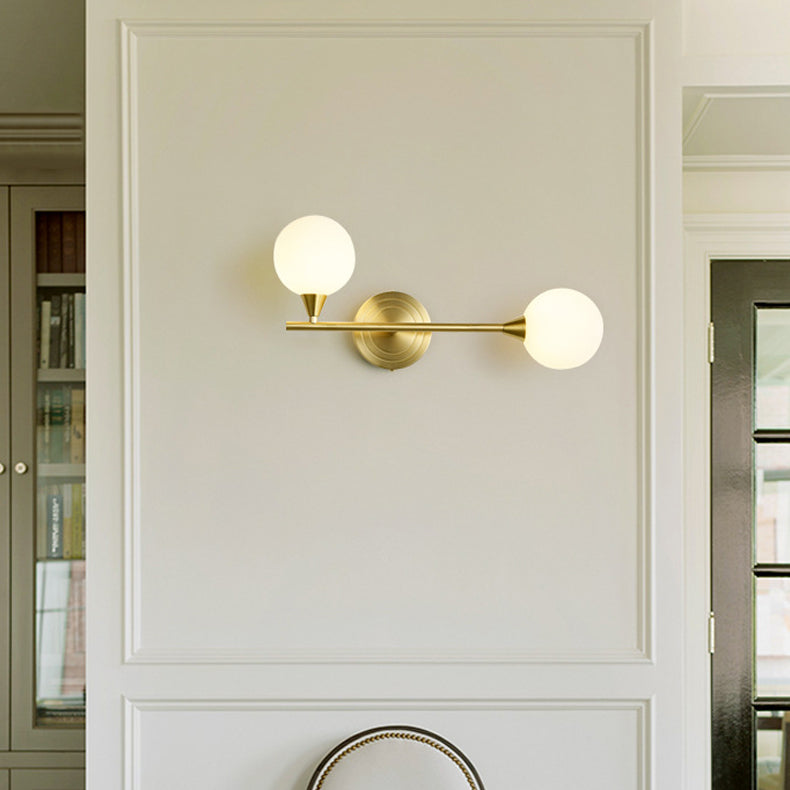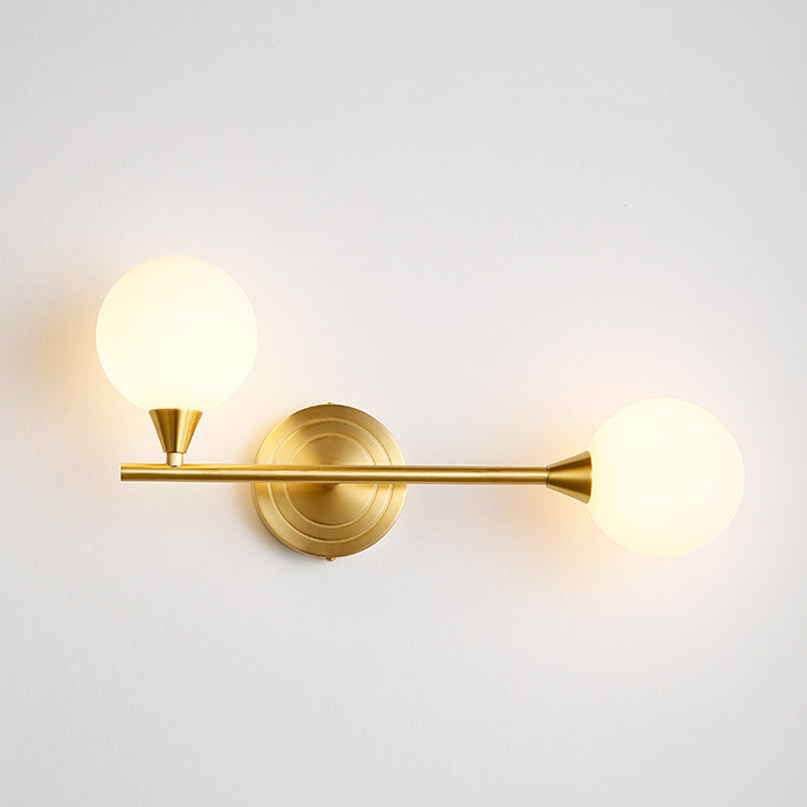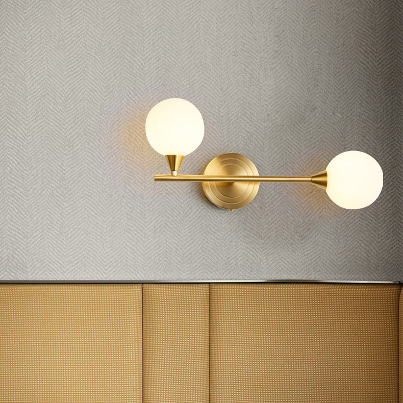 Elevate your space with this modern luxury 2-light wall sconce, featuring a sleek straight brass rod and globe-shaped glass shades in a sophisticated gold finish. Designed for bedrooms and living rooms, it adds an elegant, upscale touch with timeless charm.
