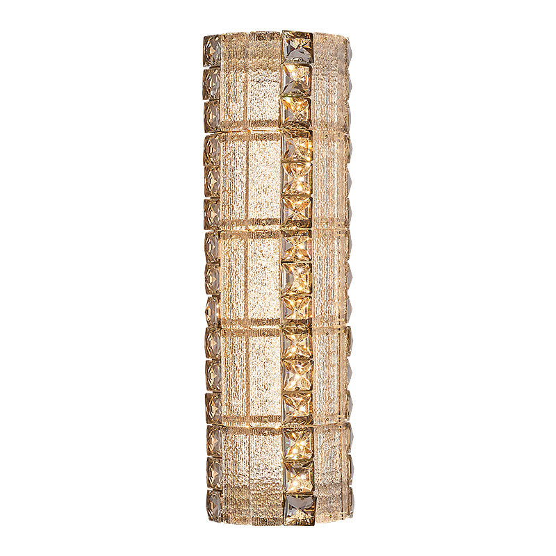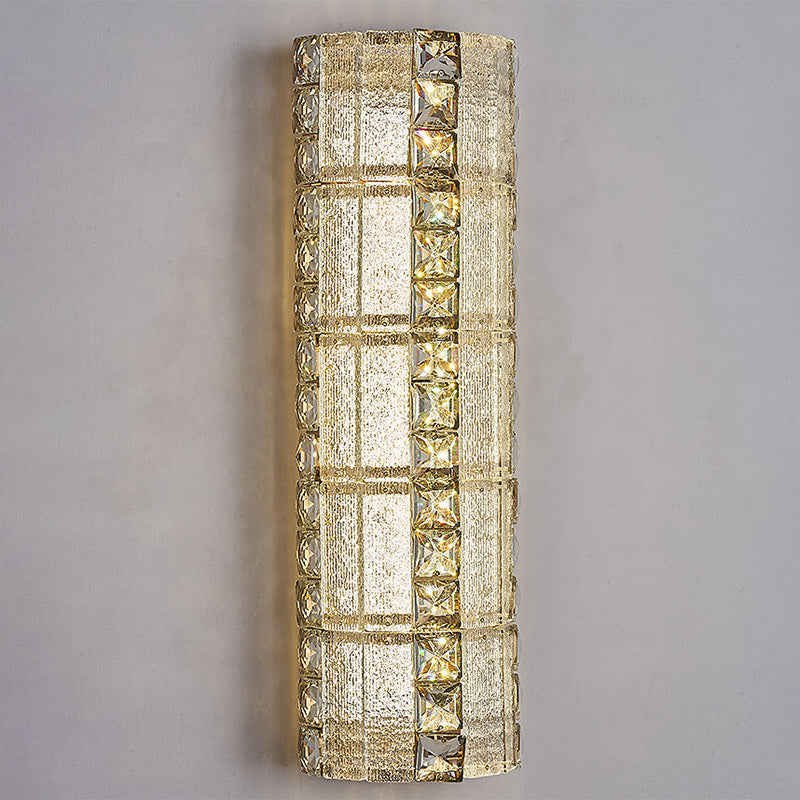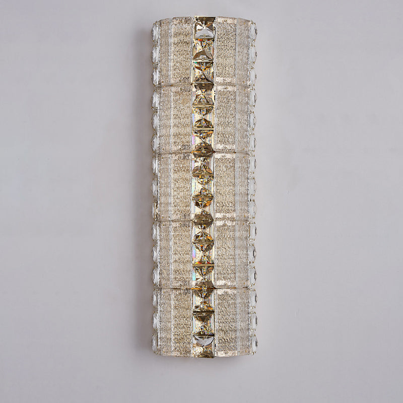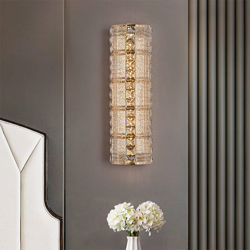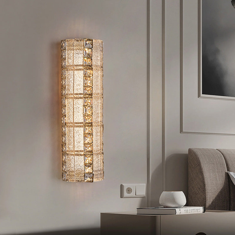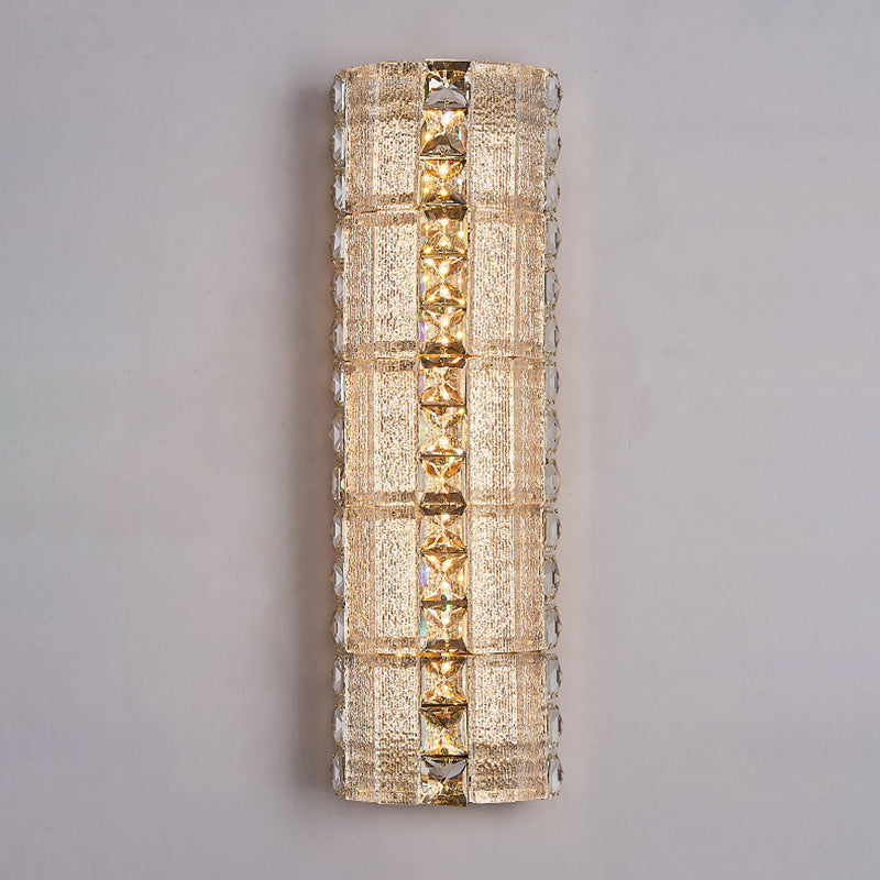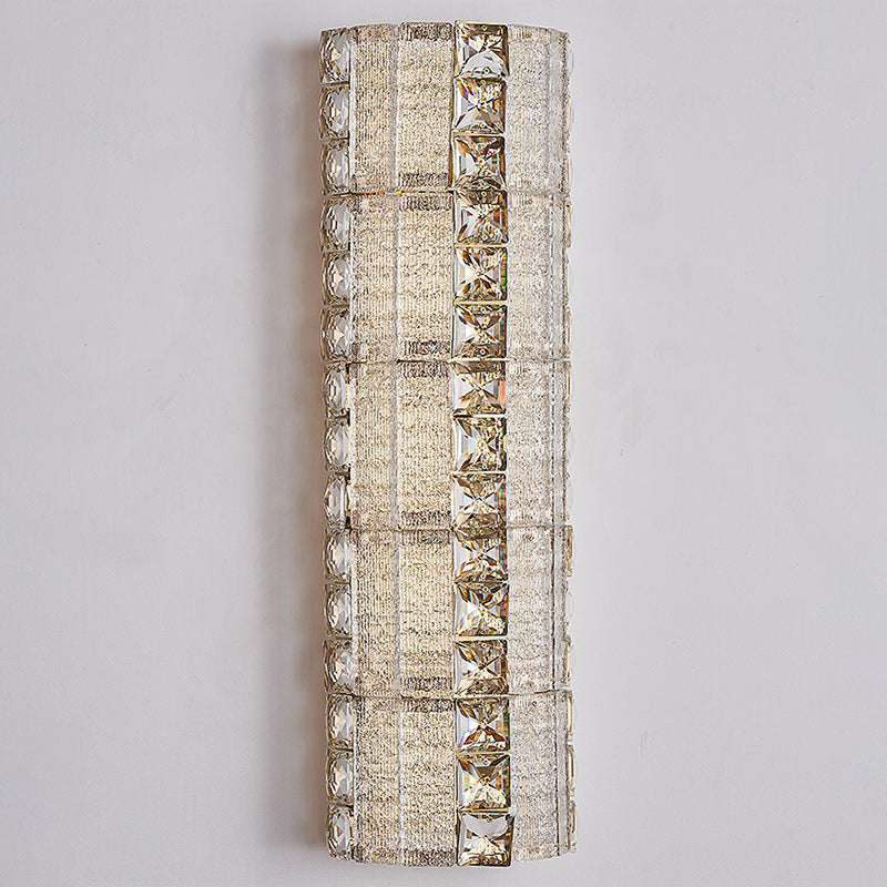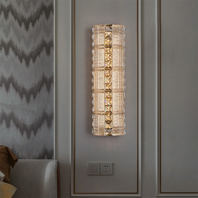 This gold-finished wall sconce features a sleek long design with precision-cut crystal accents that mimic diamond facets, enhancing light refraction and ambiance. Perfect for bedrooms and living rooms, the LED light source combines elegance with energy efficiency for upscale interiors.