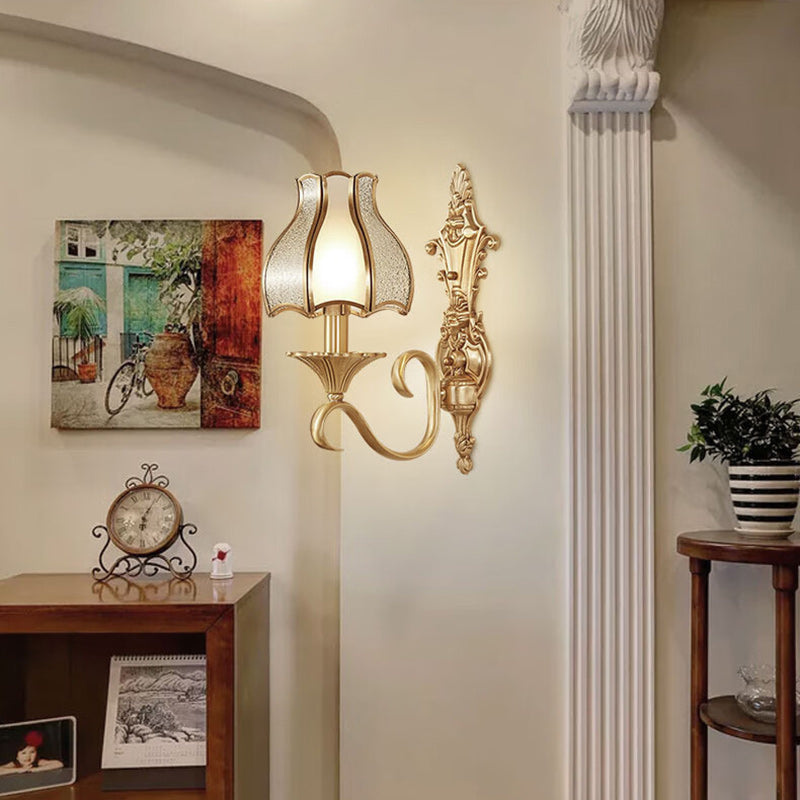 Modern Luxury Curved Rod Flower Shape Candle Holder Full Brass Frame Glass Shade 1/2 Light Wall Sconce Lamp For Living Room