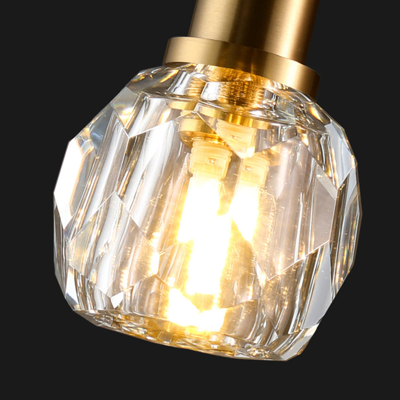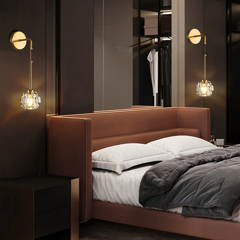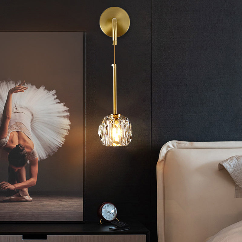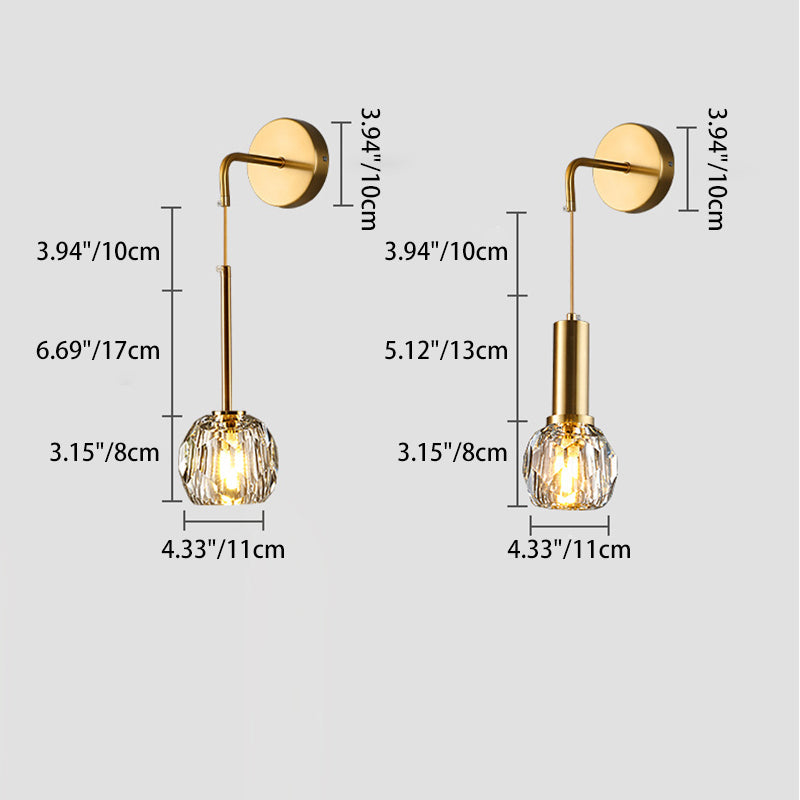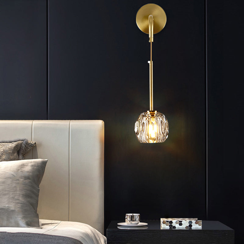 Add a touch of elegance to your bedroom or living room with our Modern Luxury Iron and Crystal Wall Sconce Lamp. Its gold-tone finish and cylindrical design, complemented by a spherical shade, make it a sophisticated choice for any contemporary space. This 1-Light fixture features multiple facets for optimal light transmission, creating a warm and inviting ambiance.