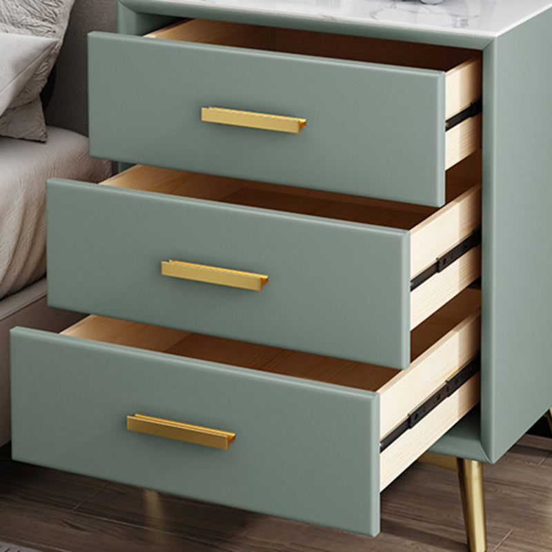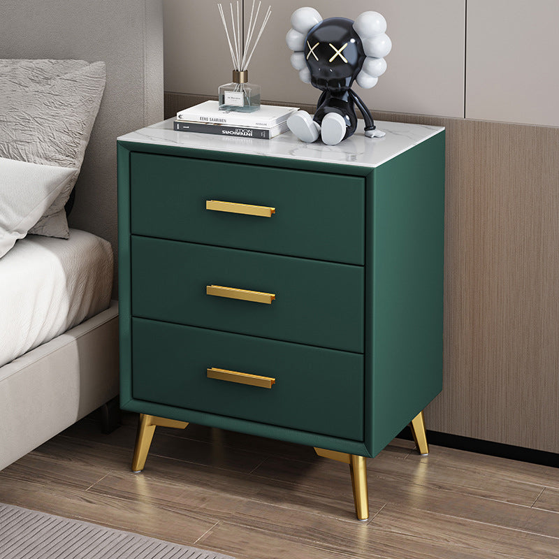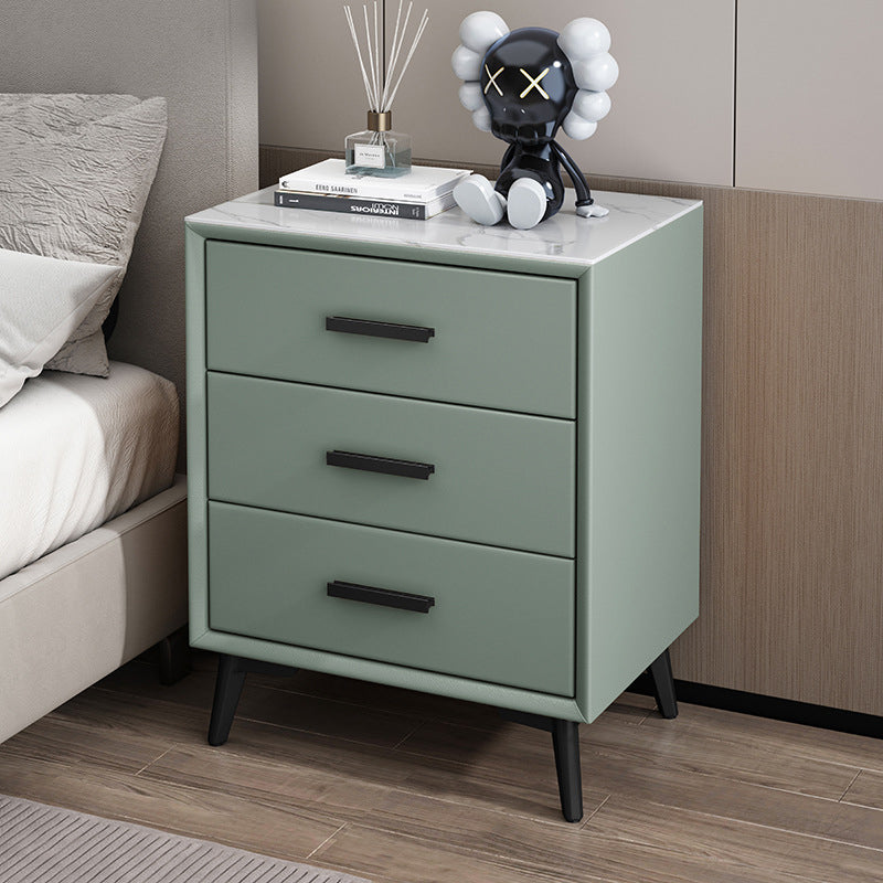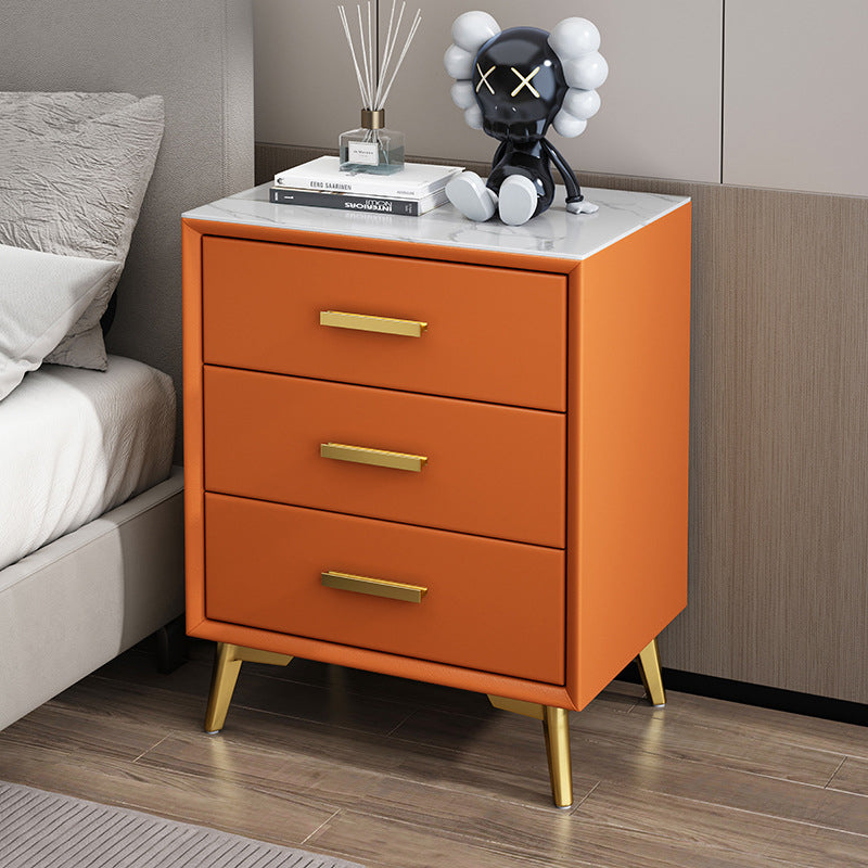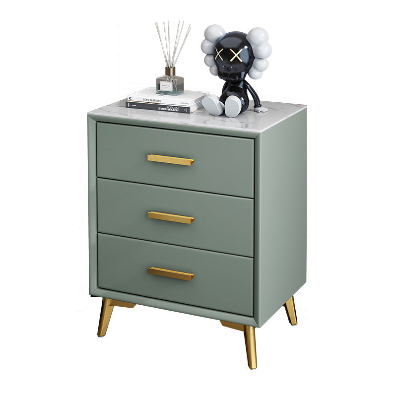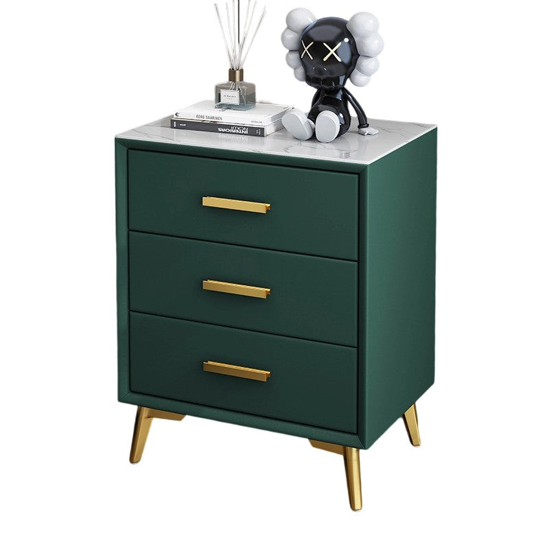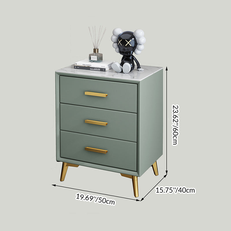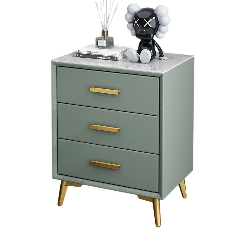 Crafted from a premium mix of microfiber leather, solid wood, sintered stone, and carbon steel, this modern luxury 3-drawer nightstand features a sturdy rectangular body with cylindrical metal legs. Available in green, cream, light gray, dark gray, light blue, forest green, pink, and orange, it offers silent soft-close rails and stable support—perfect for elegant bedroom organization.
