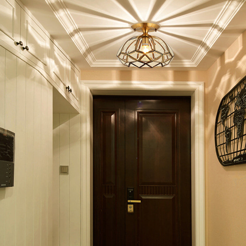 Modern Luxury Round Dome Diamond Shape Brass Frame Glass Shade 1-Light Semi-Flush Mount Ceiling Light For Living Room