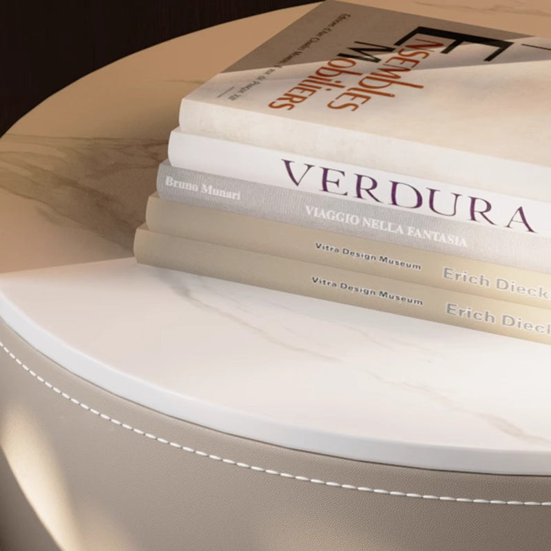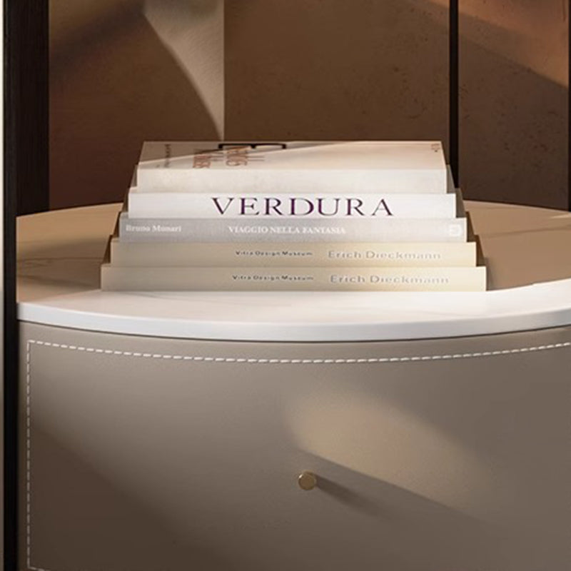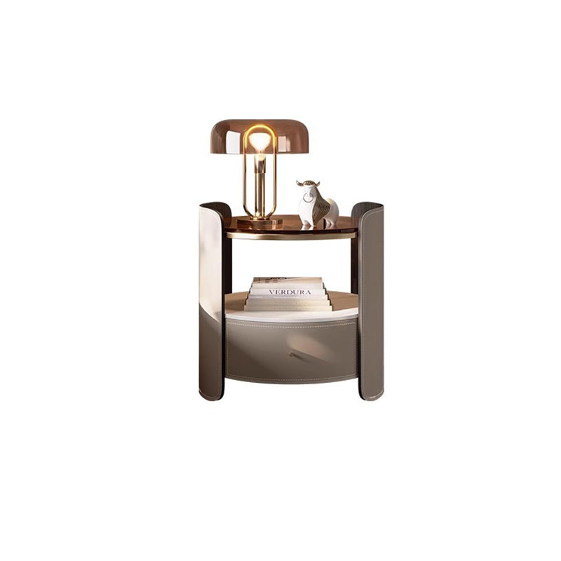 Modern Luxury Round Faux Saddle Leather Glass Solid Wood Nightstand 1-Drawer For Bedroom