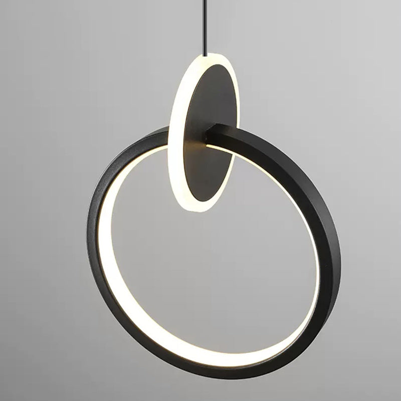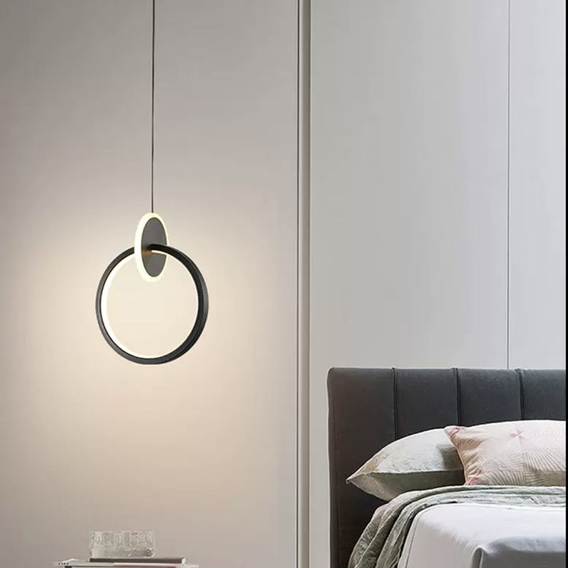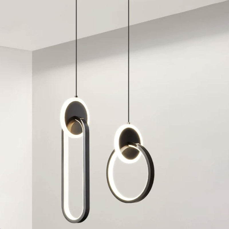 This sleek LED chandelier features a minimalist round and oval design crafted from aluminum, silicone, and acrylic in black and gold finishes. Perfect for bedroom or living room spaces, it provides stylish, ambient lighting with a clean modern silhouette—ideal for accenting bedside or feature walls.
