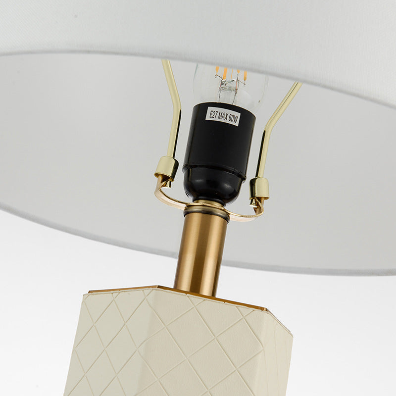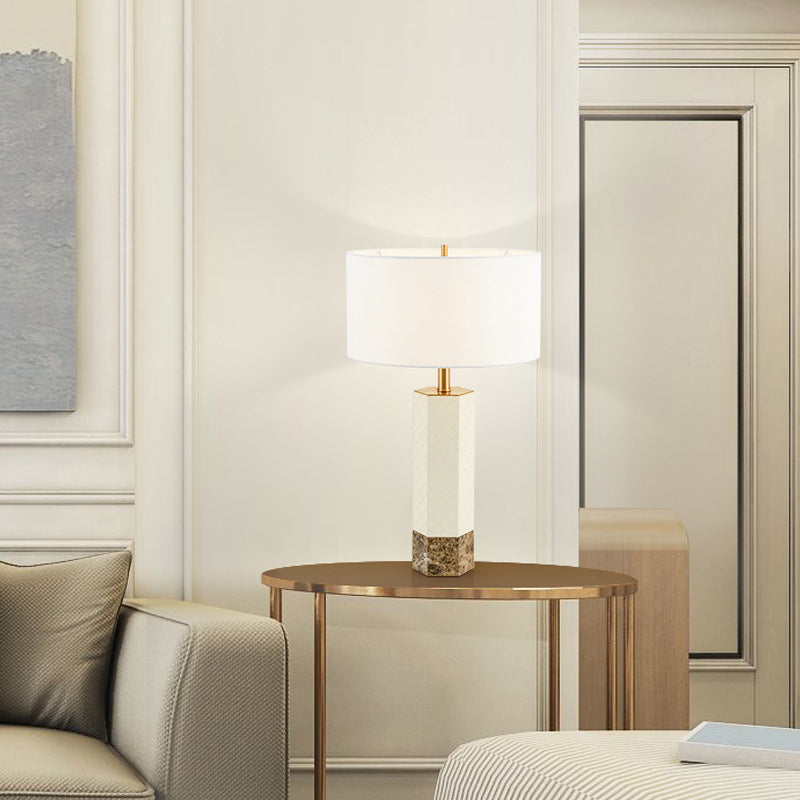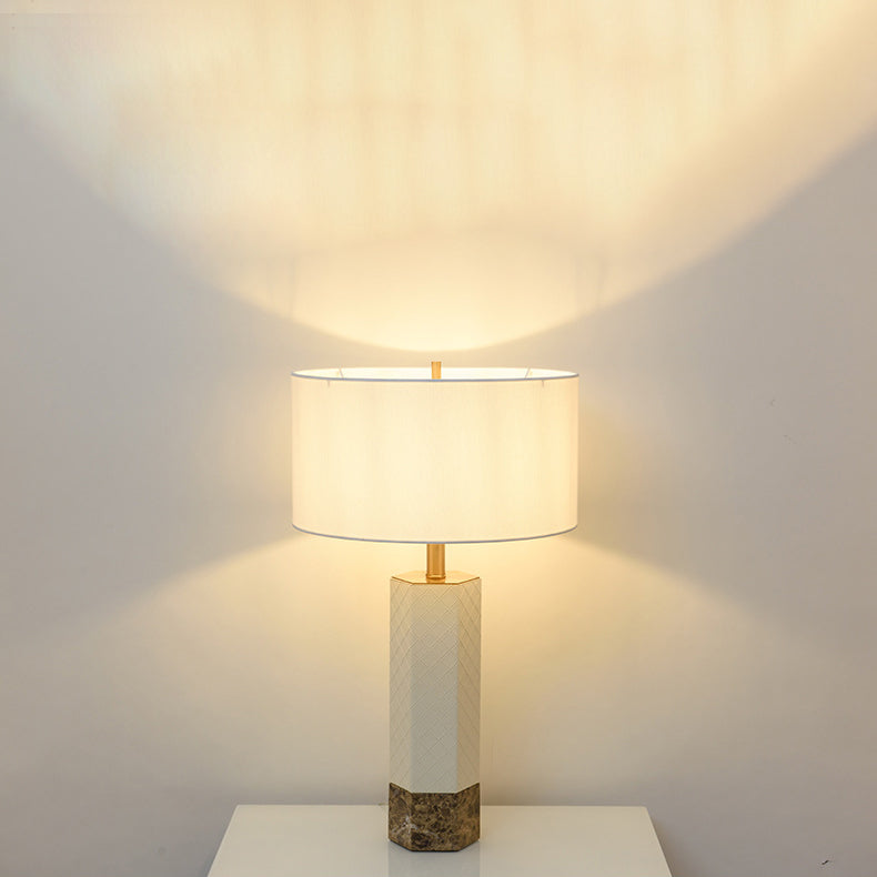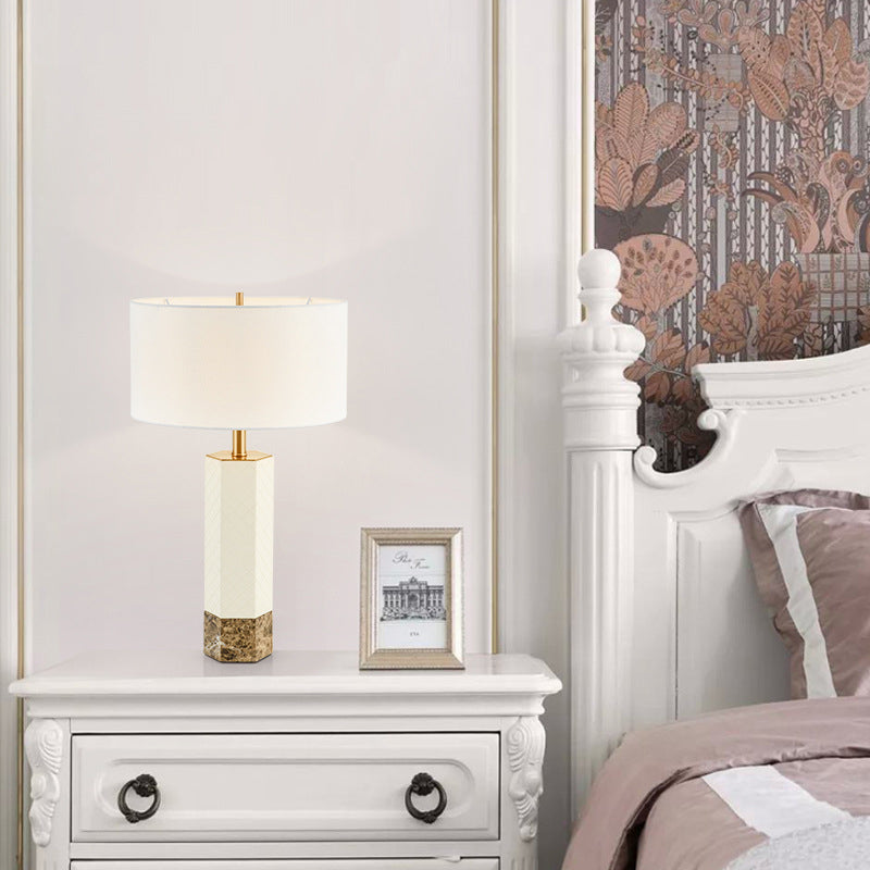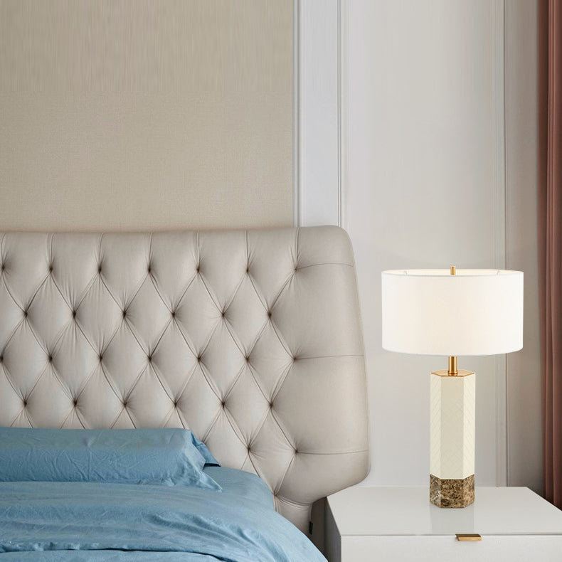 Modern Minimalist Hexagonal Column Round Marble Leather Fabric 1-Light Table Lamp For Bedroom