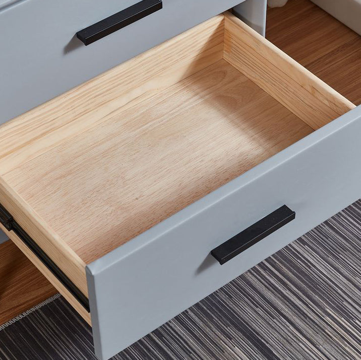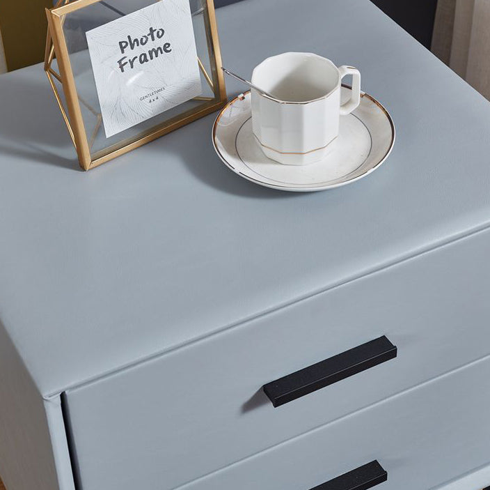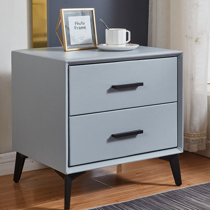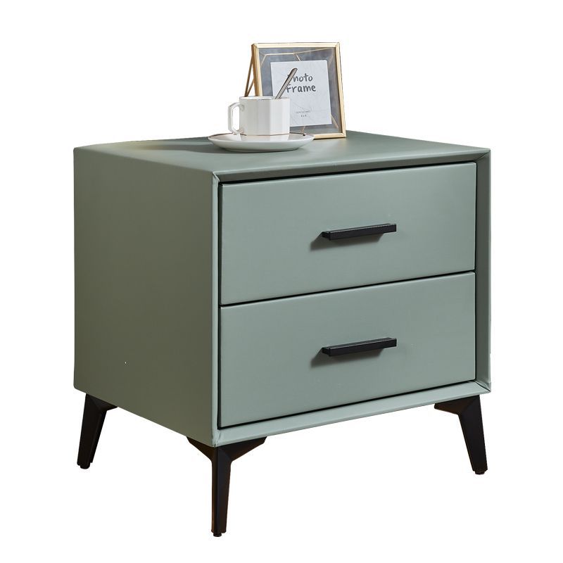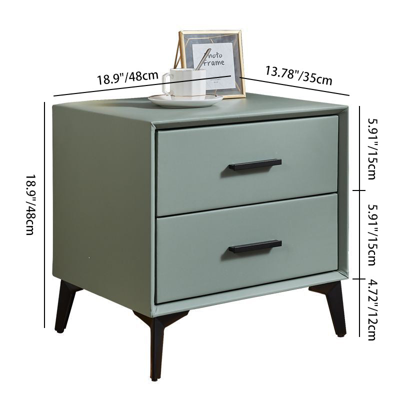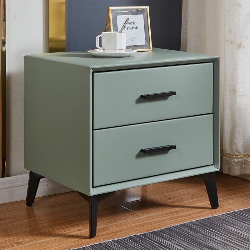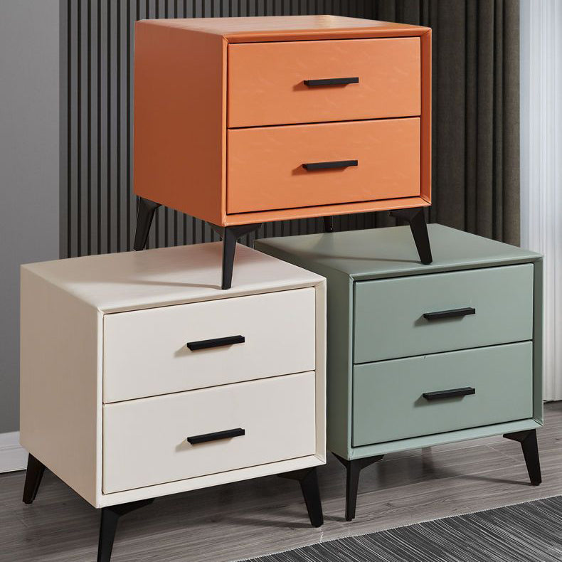 Crafted from medium-density fiberboard, PU leather, metal, and iron, this modern minimalist nightstand features a clean square silhouette with angled legs. Its two enclosed drawers glide smoothly and help keep dust and moisture out—ideal for stylish, functional bedroom storage in a variety of trendy colors like mint green, ivory, gray, navy, and orange.