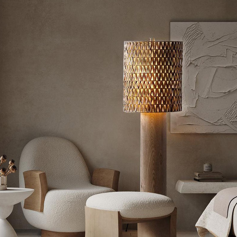 Modern Simple Wood Rattan Woven Long Body Cylinder 1-Light Standing Floor Lamp