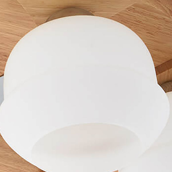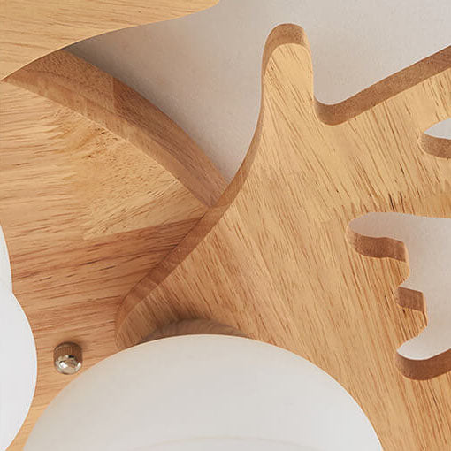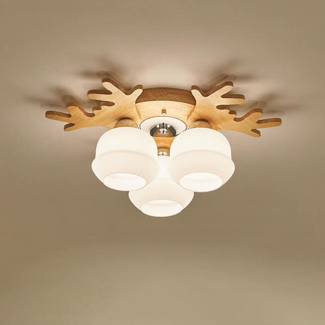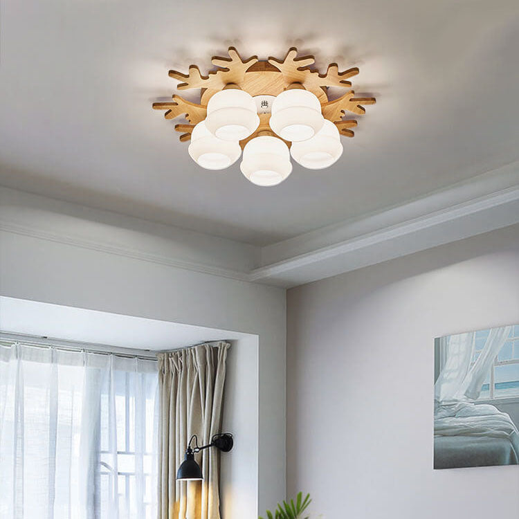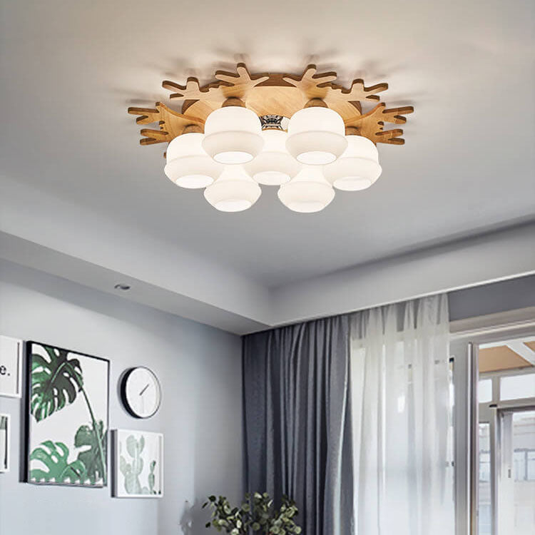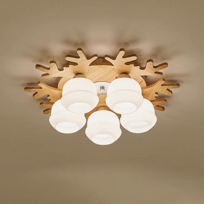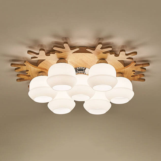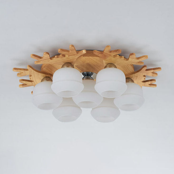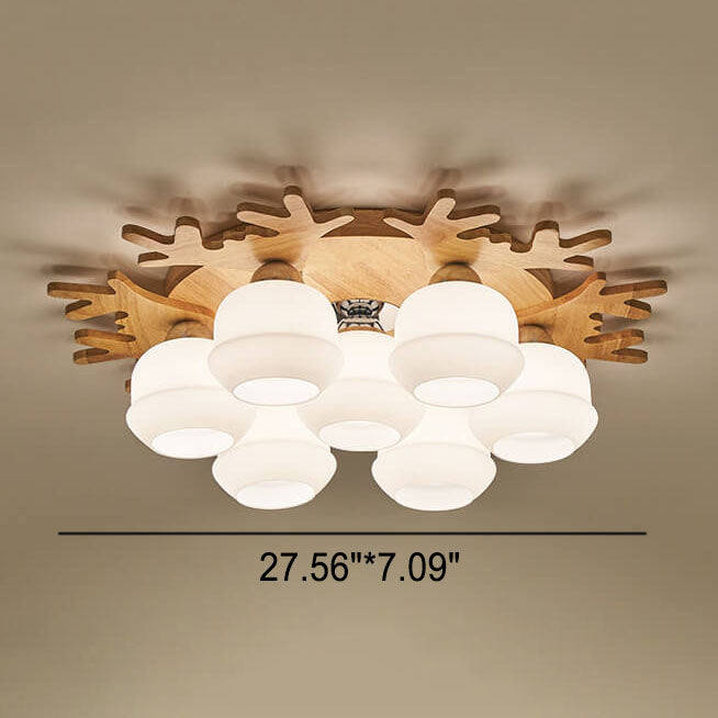 Nordic Solid Wood Antler Frosted Glass Round Shade 3/5/7 Light Flush Mount Ceiling Light